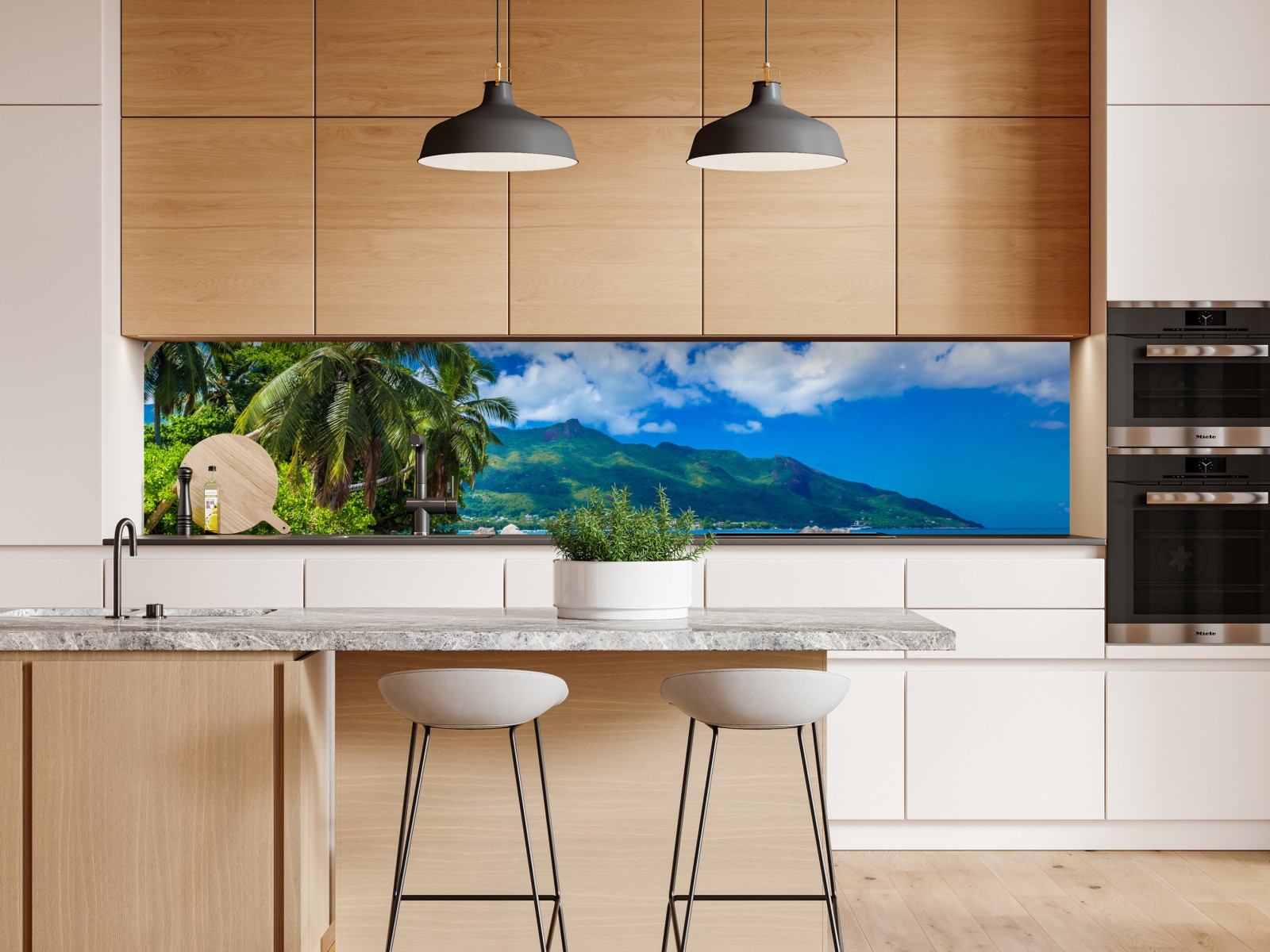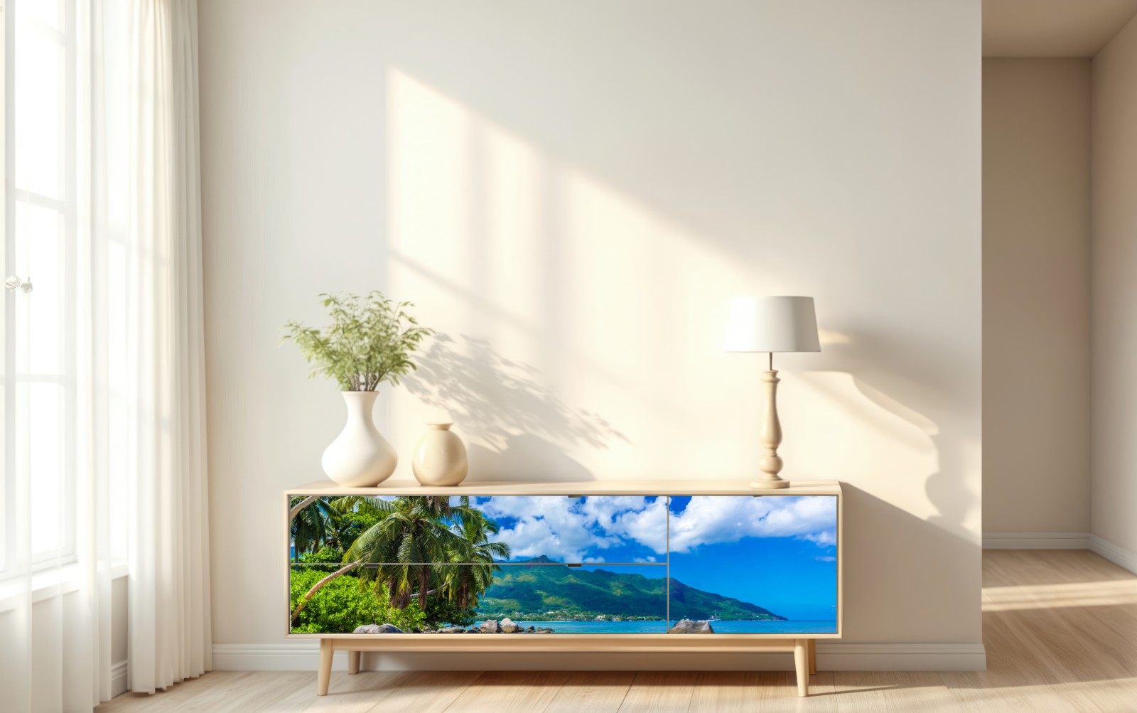 Bringen Sie die beruhigende Schönheit von Baie Beau Vallon in Ihr Zuhause mit dieser lebendigen tropischen Strandaufnahme mit türkisfarbenem Wasser, wiegenden Palmen und sonnenverwöhntem Sand.