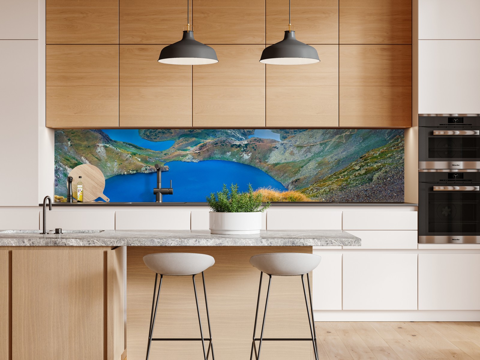 Atemberaubende Panoramaaufnahme alpiner Seen mit tiefblauem Wasser und rauen Bergkämmen, ideal um die Natur in Ihr Zuhause zu holen.