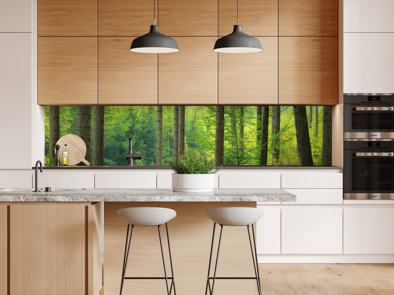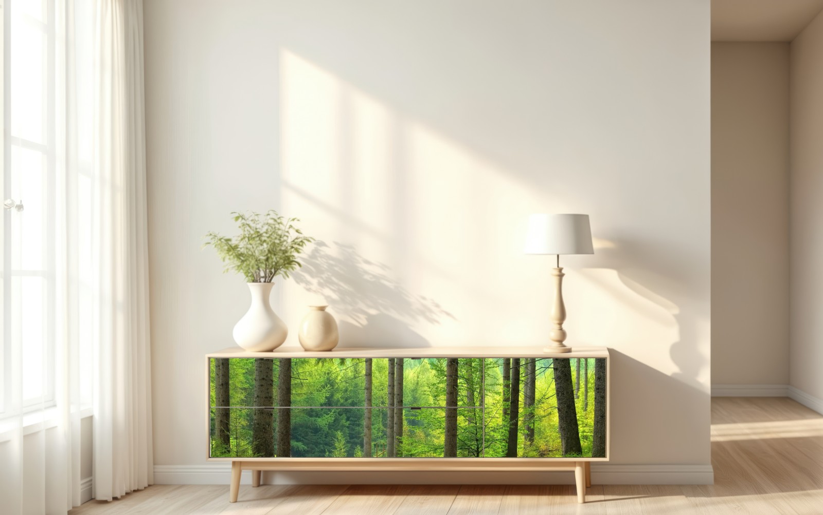 Ein ruhiger, sonniger Waldweg, der die beruhigende Schönheit der Natur in Ihr Zuhause bringt.