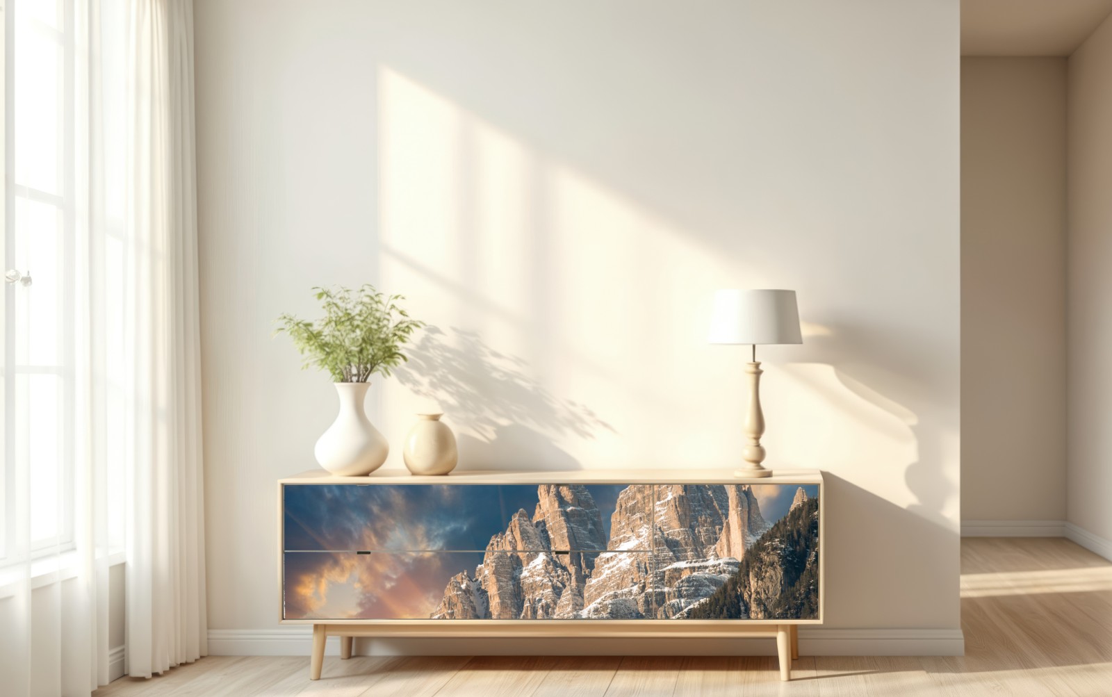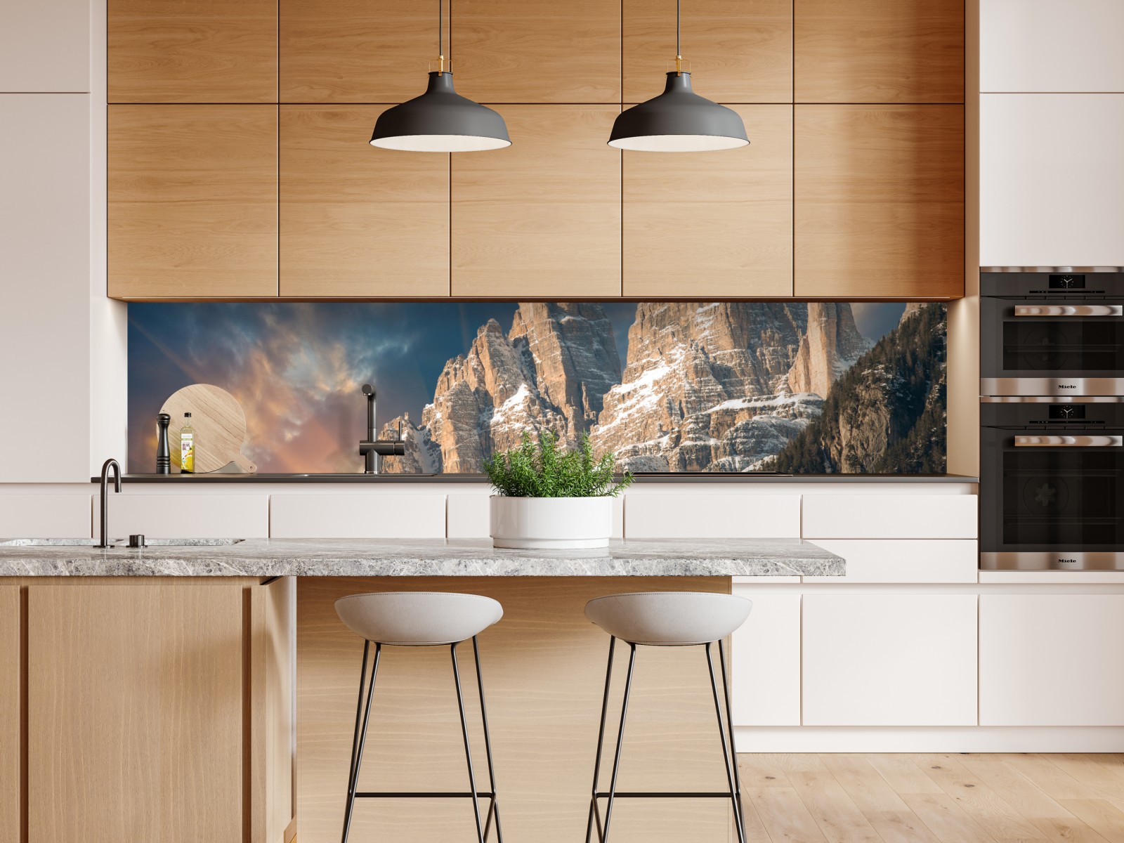 Atemberaubender Blick auf schneebedeckte Dolomiten bei Sonnenuntergang bringt dramatische Natur und Ruhe in Ihr Zuhause.