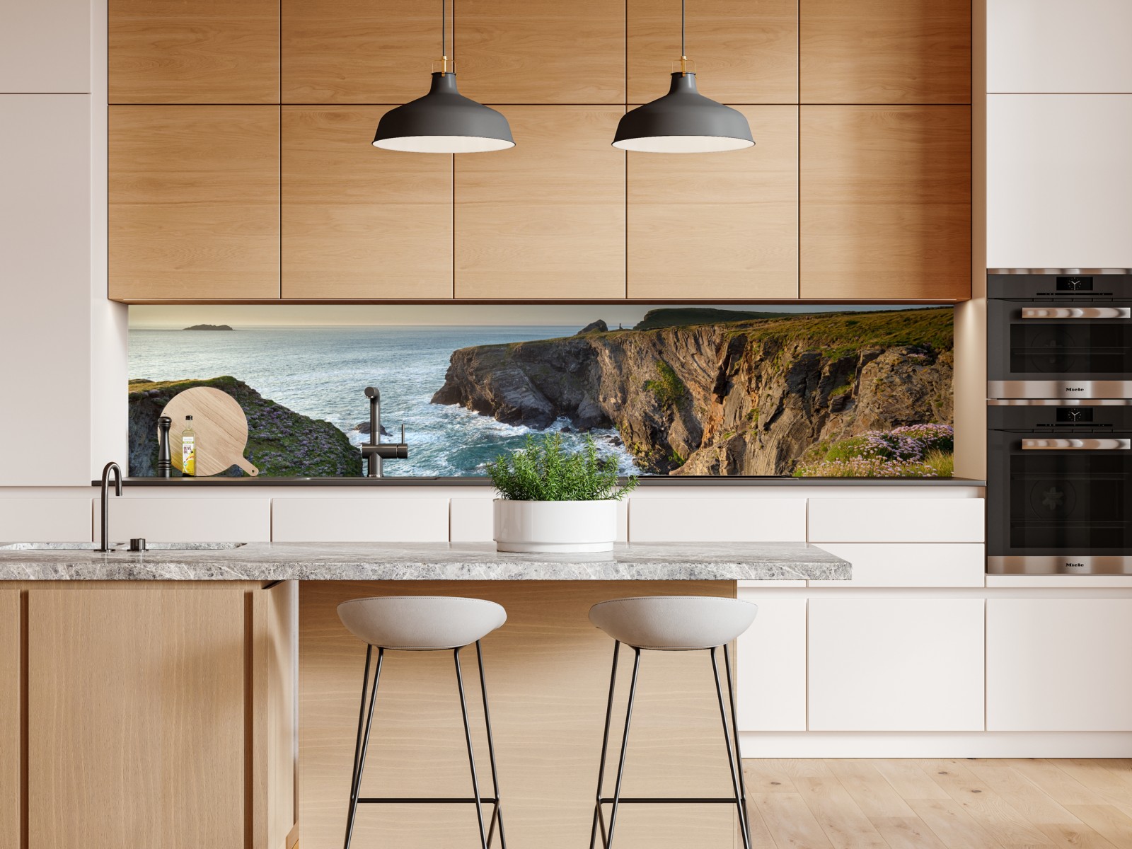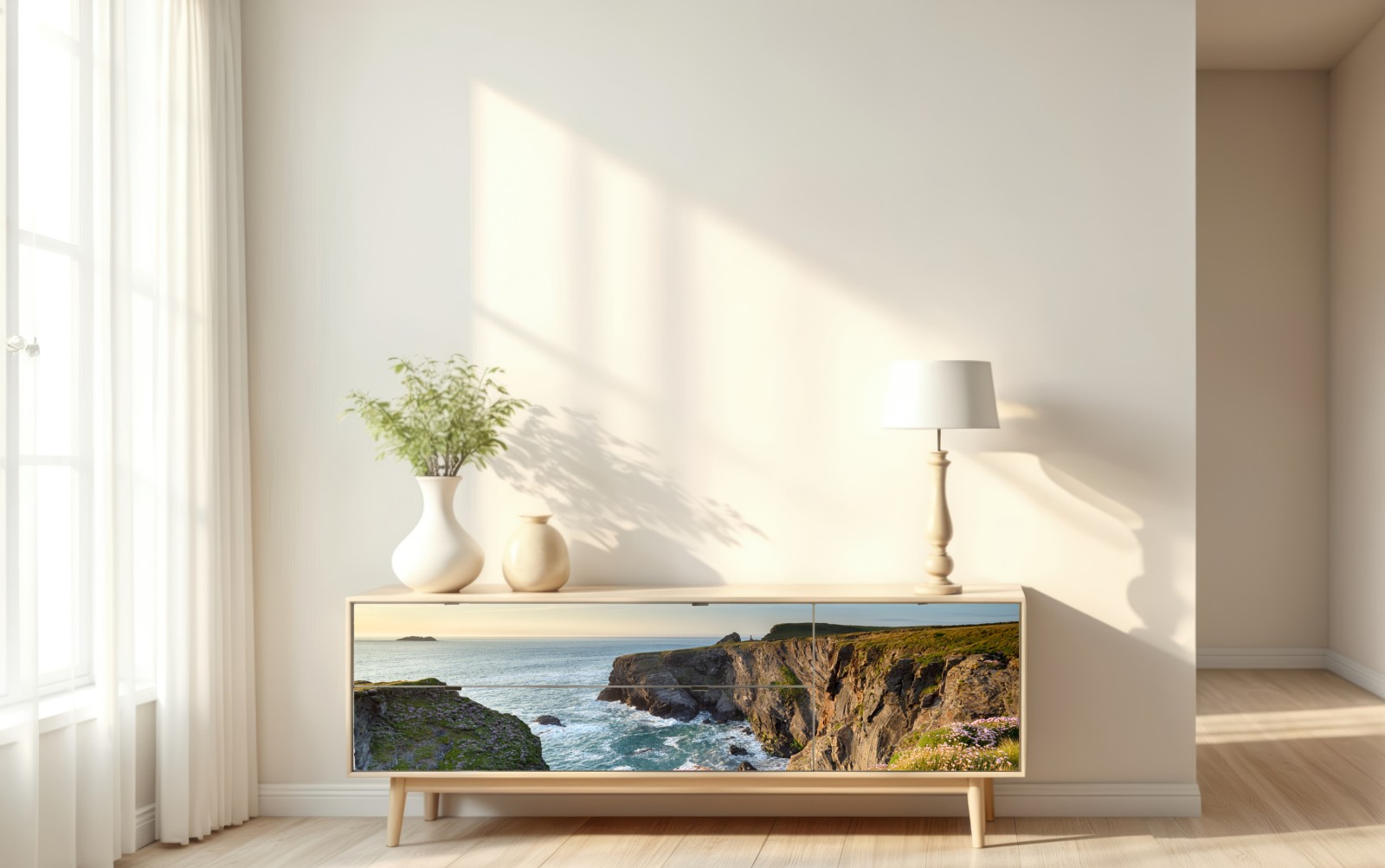Atemberaubende Küstenklippen mit Wildblumen im Vordergrund, fotografiert in der goldenen Stunde, um ruhige natürliche Schönheit in Ihren Raum zu bringen.