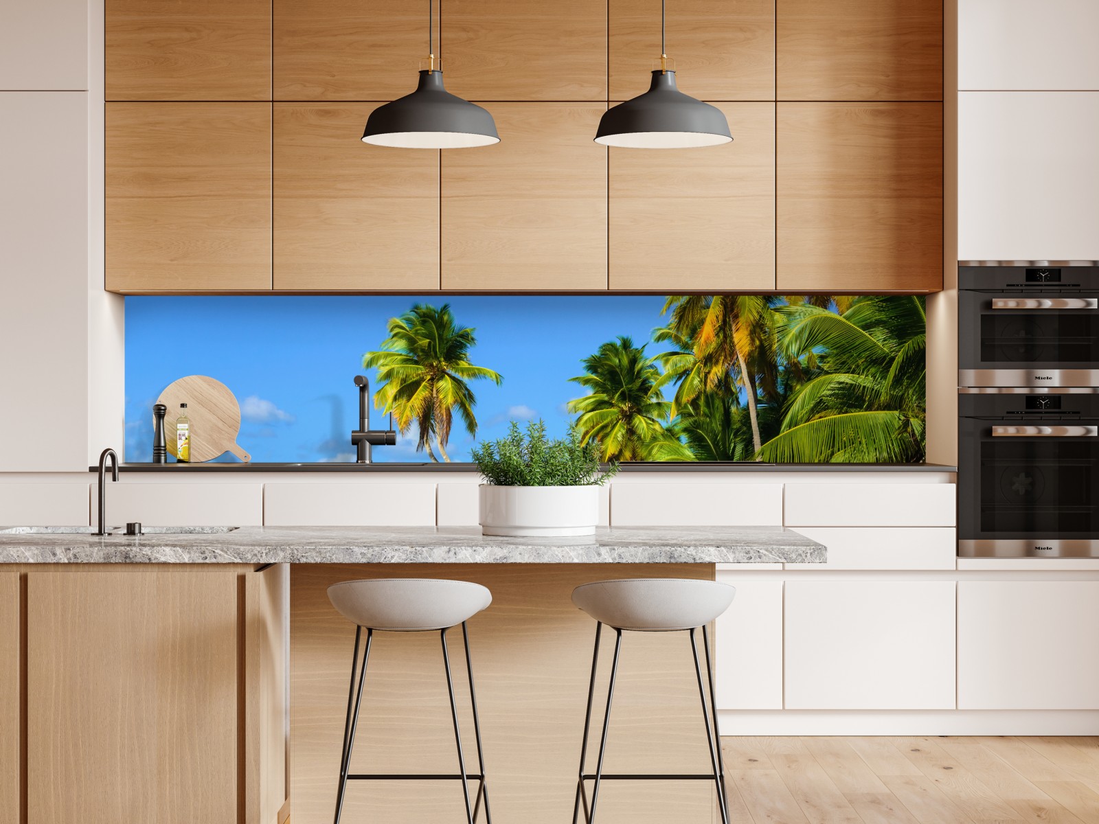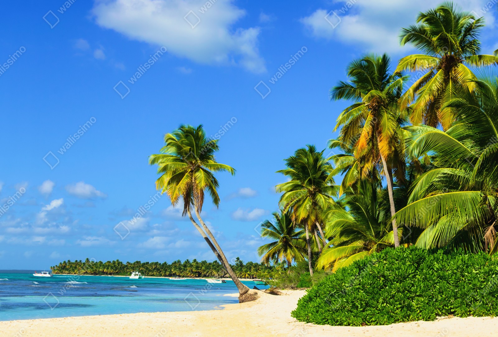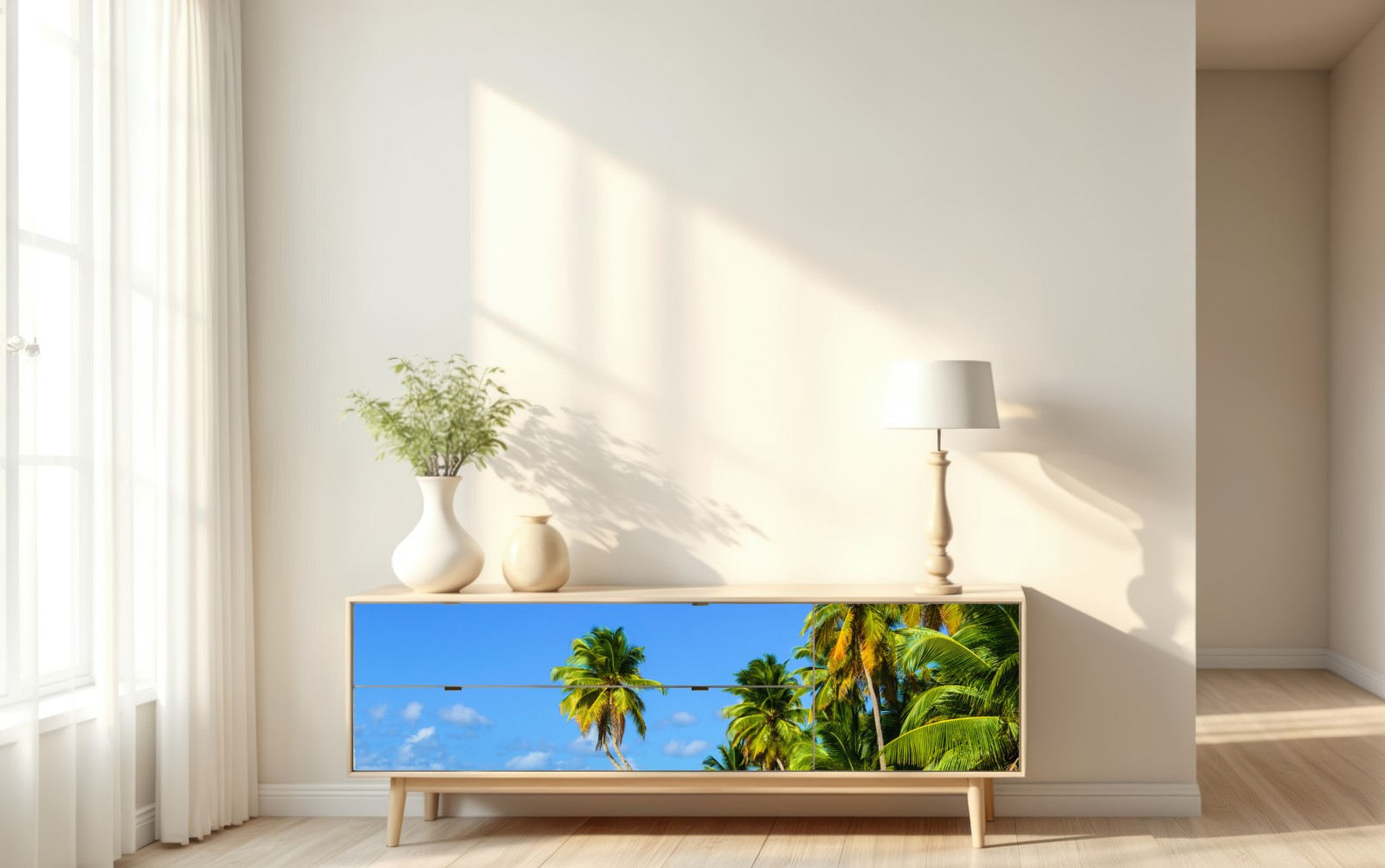 Bringen Sie tropisches Flair in Ihr Zuhause mit dieser lebendigen Strandaufnahme mit wiegenden Palmen, türkisfarbenem Wasser und goldenem Sand.