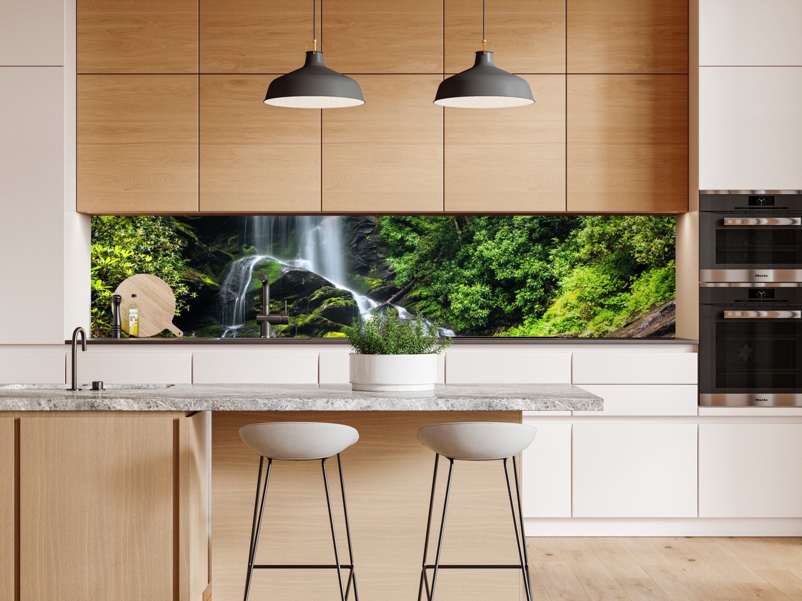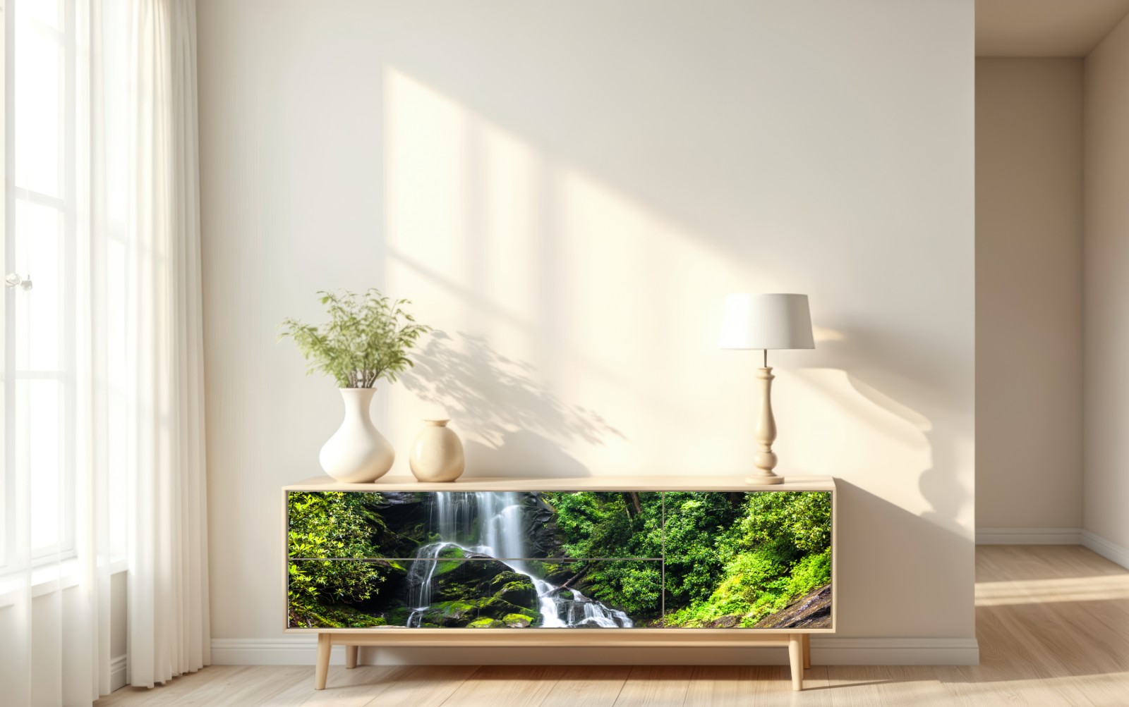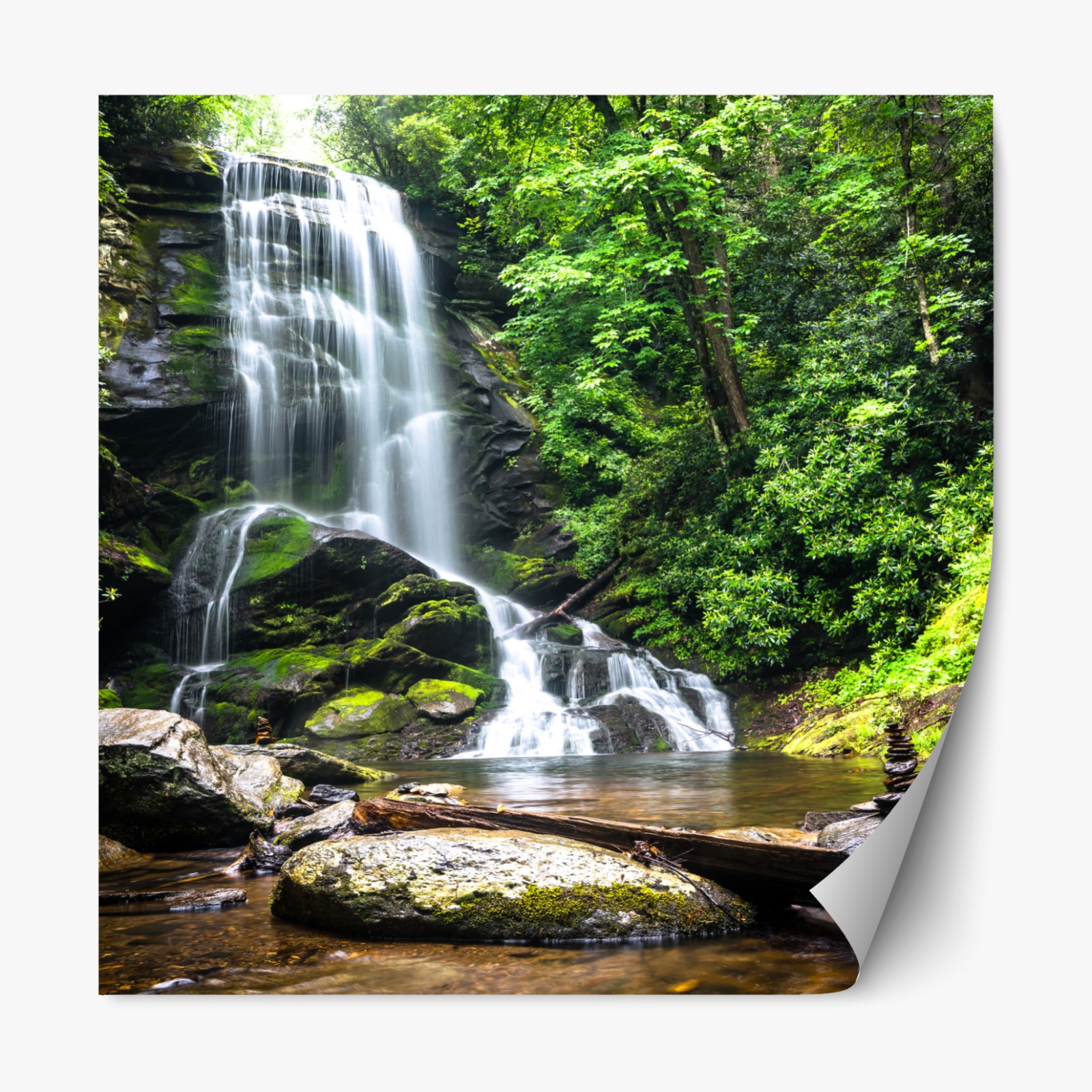 Bringen Sie die beruhigende Atmosphäre eines üppigen Wasserfalls in Ihren Raum mit diesem hochauflösenden Naturdruck, ideal als ruhiger Blickfang und für biophile Einrichtungen.