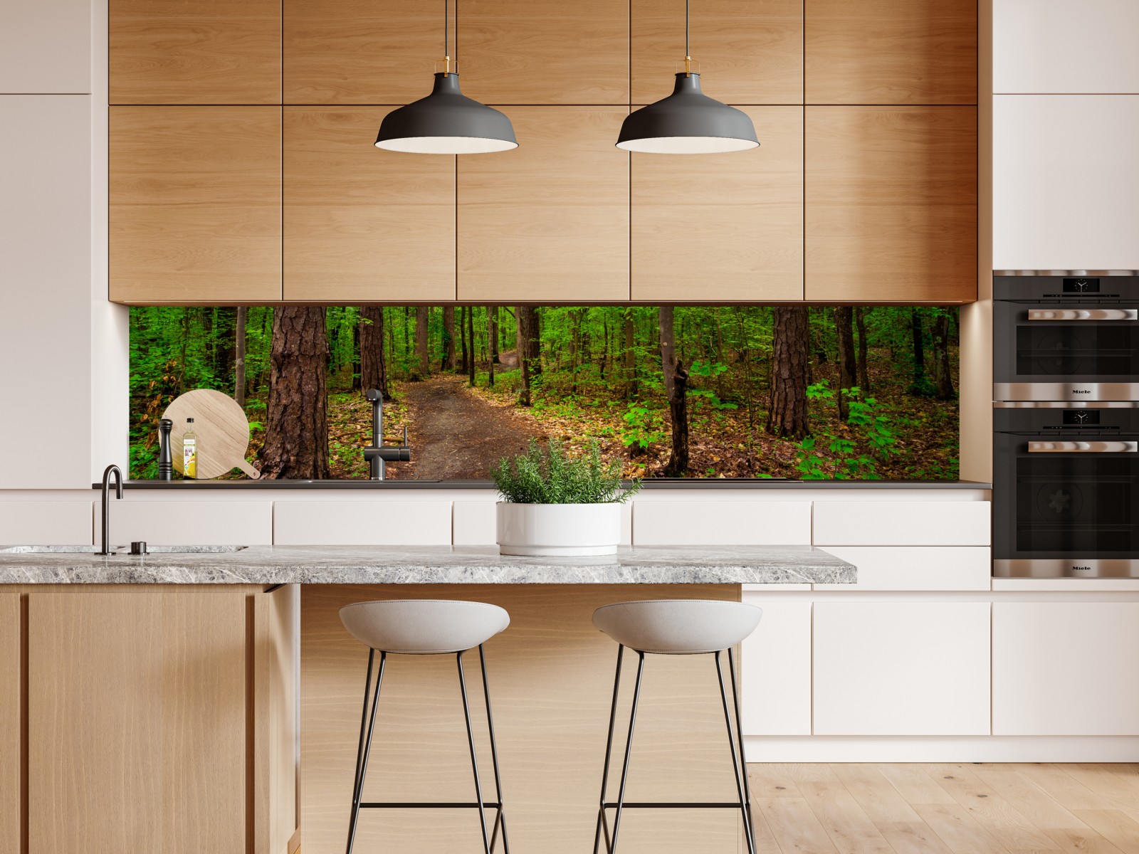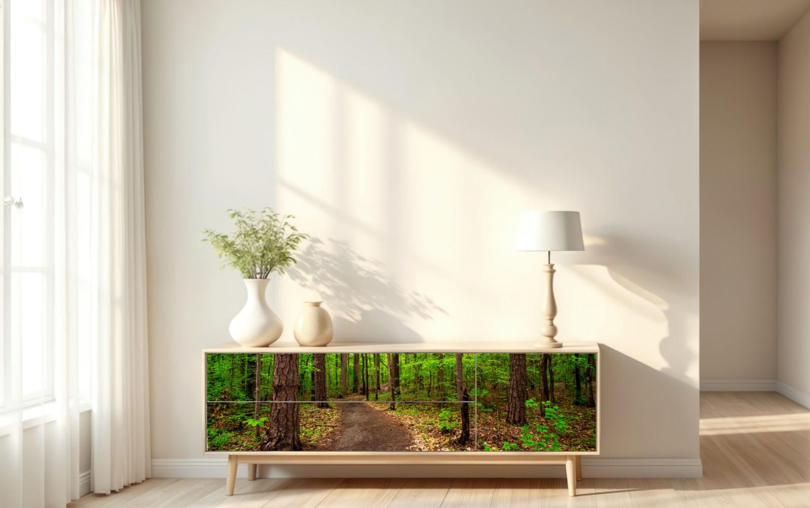Lebendige grüne Farbtöne und ein ruhiger Waldweg bringen natürliche Ruhe und Frische in jeden Raum.