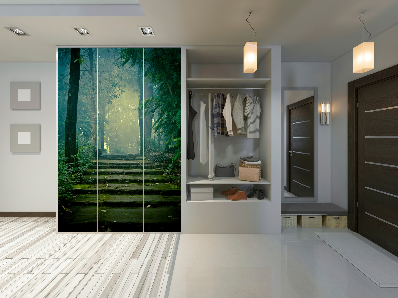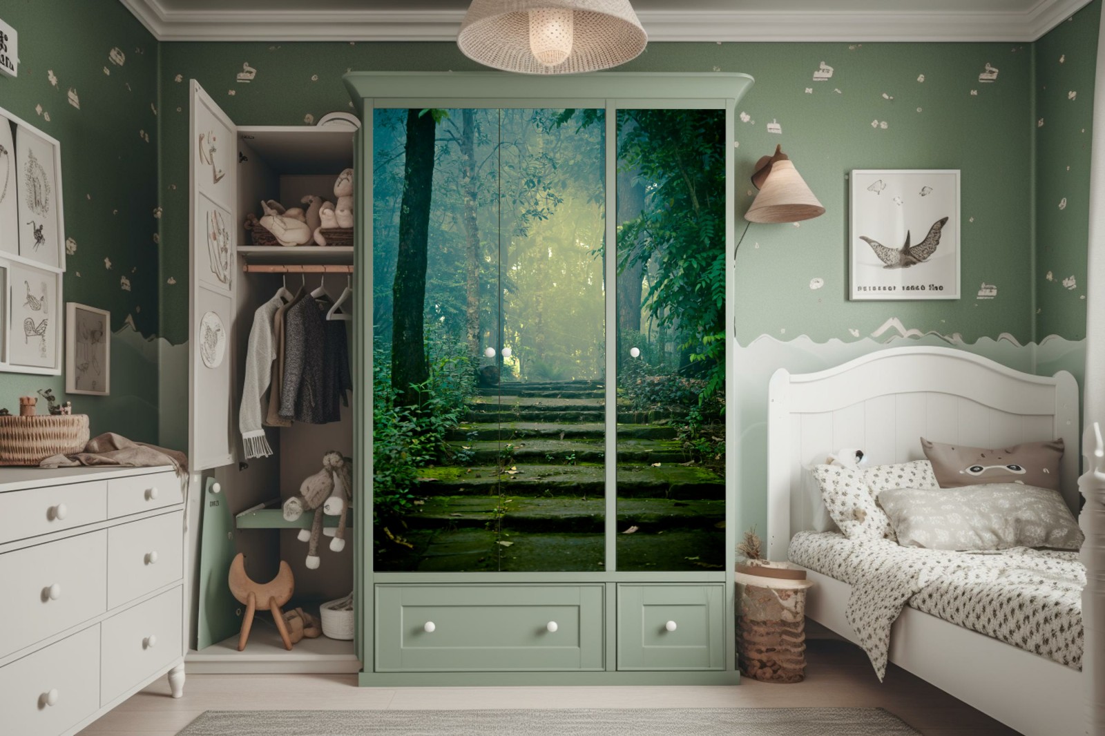 Schrankaufkleber Moosbedeckte steintreppe in den nebligen wald