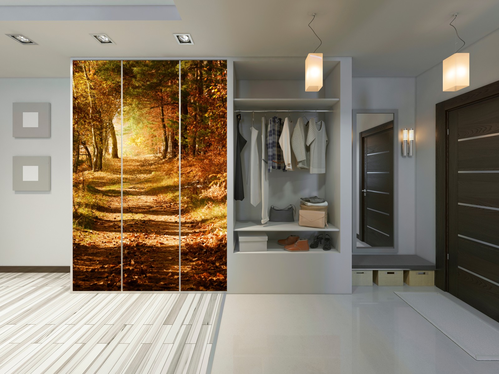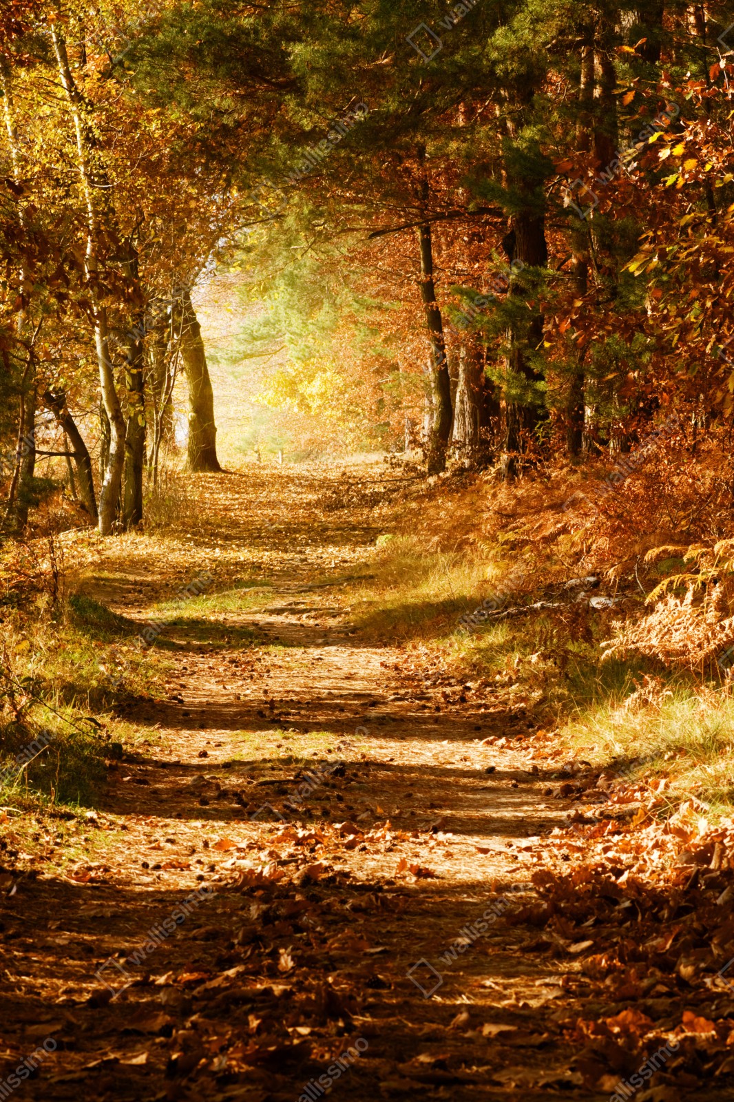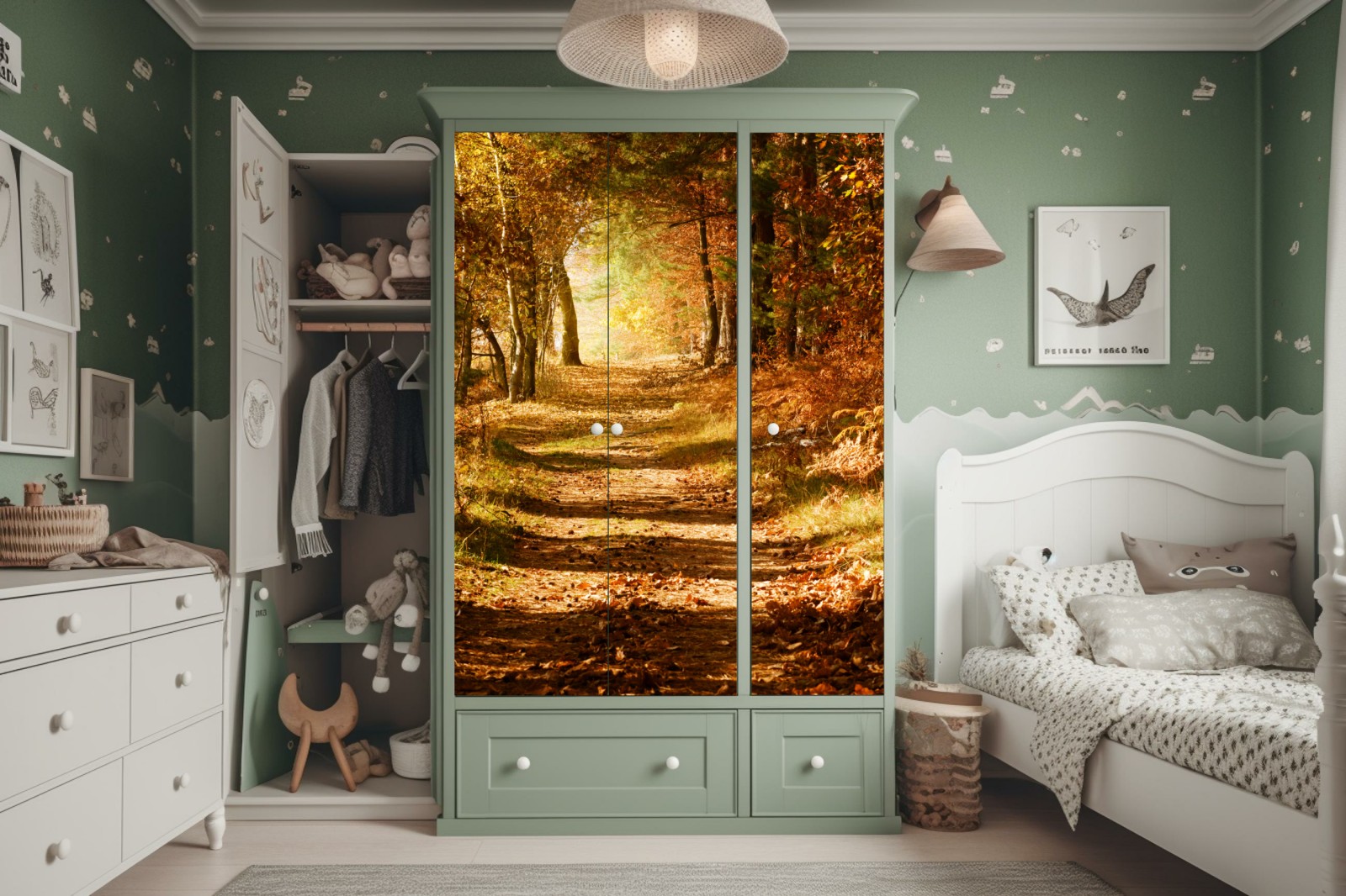 Schrankaufkleber Herbstlicher waldweg mit goldenem licht