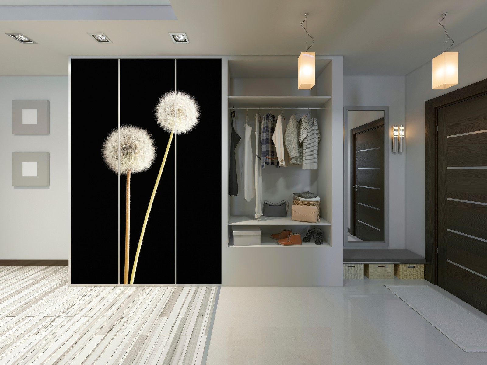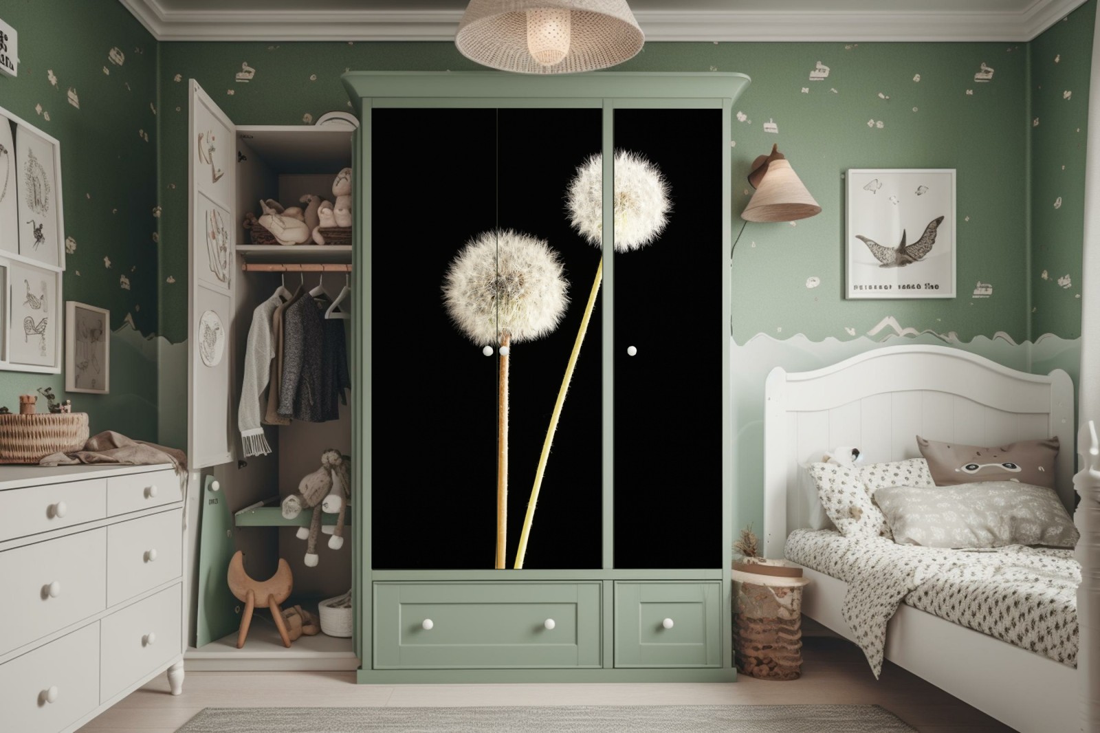 Schrankaufkleber Zarte löwenzahnsamen auf schwarzem hintergrund