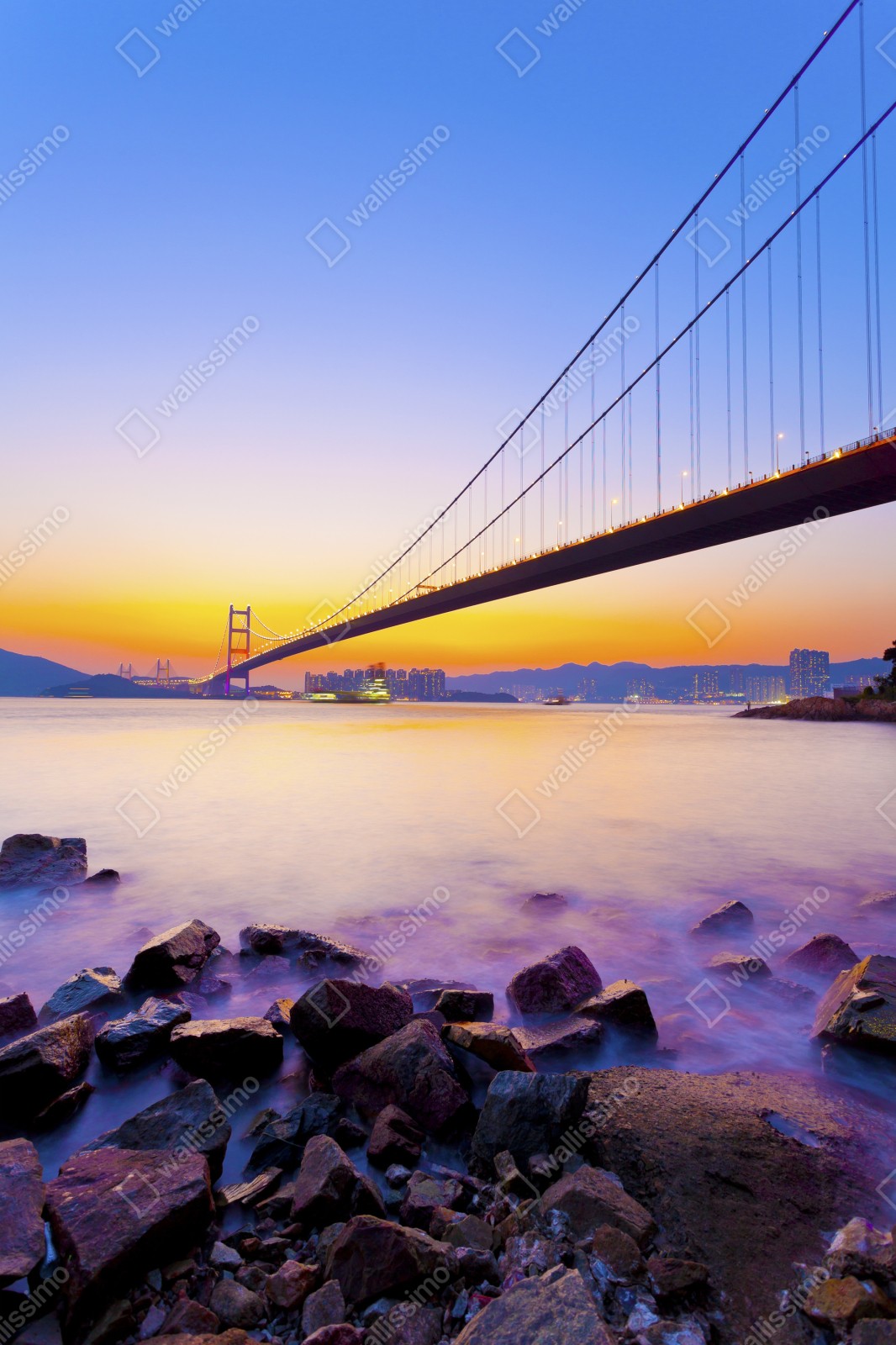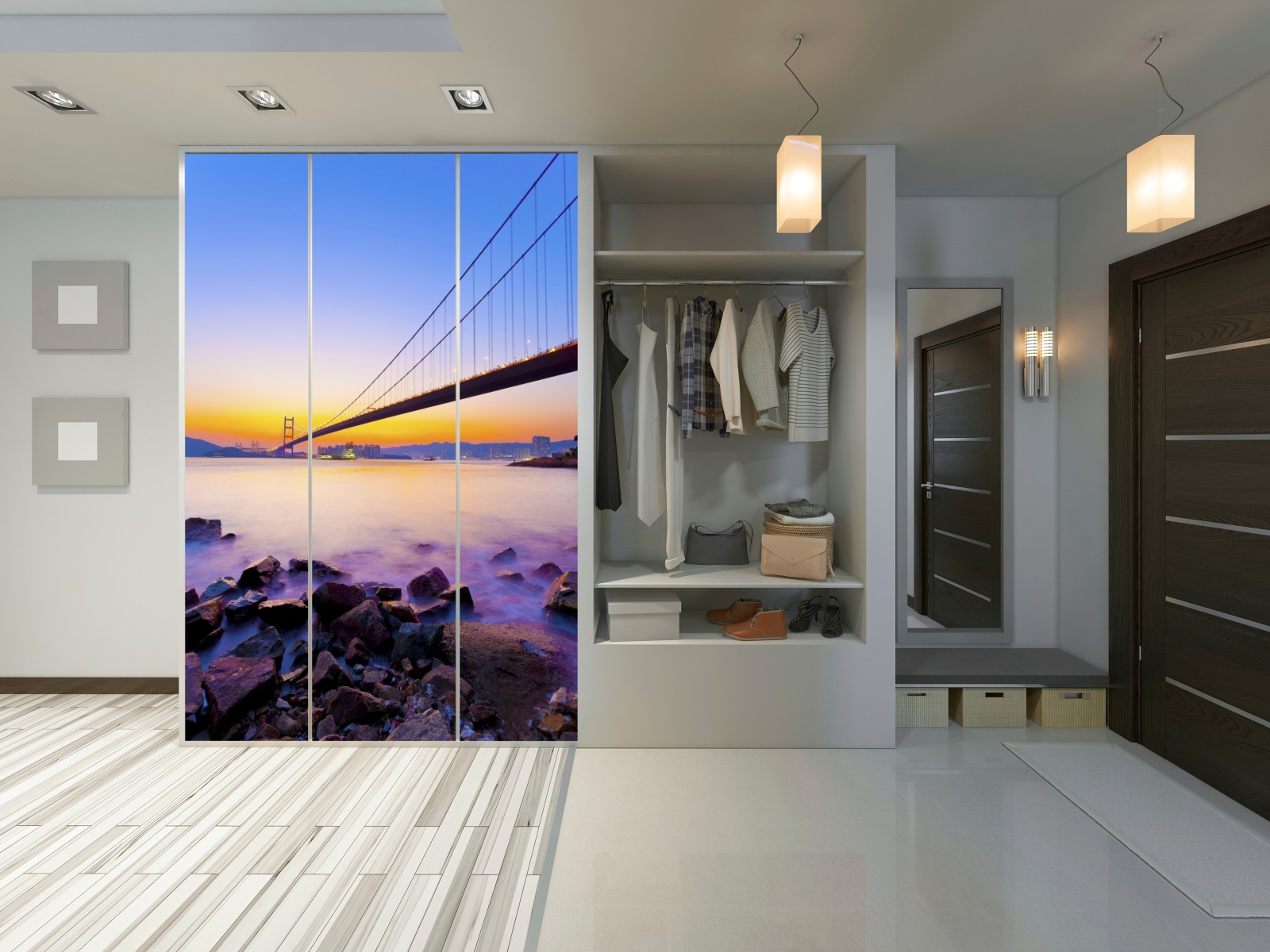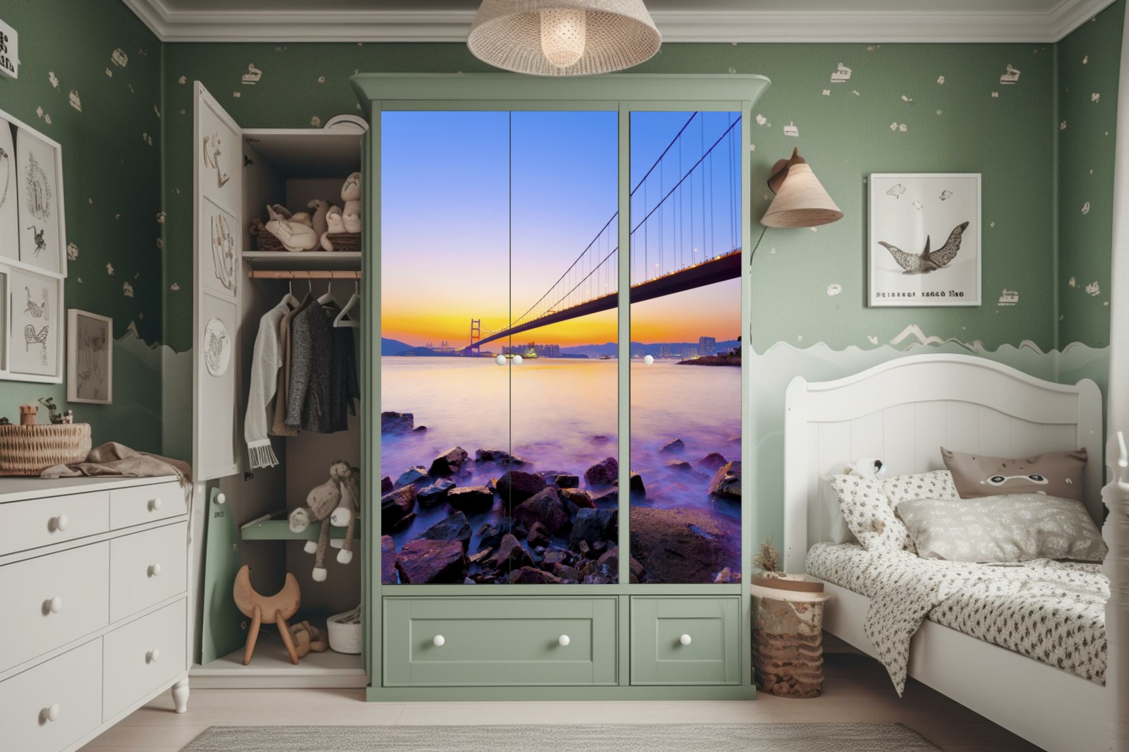 Schrankaufkleber Goldener sonnenuntergang über hängebrücke