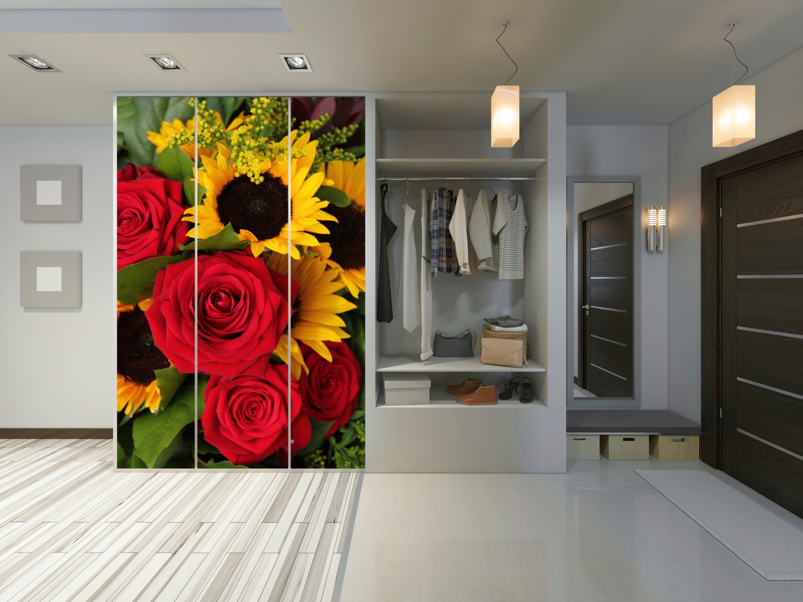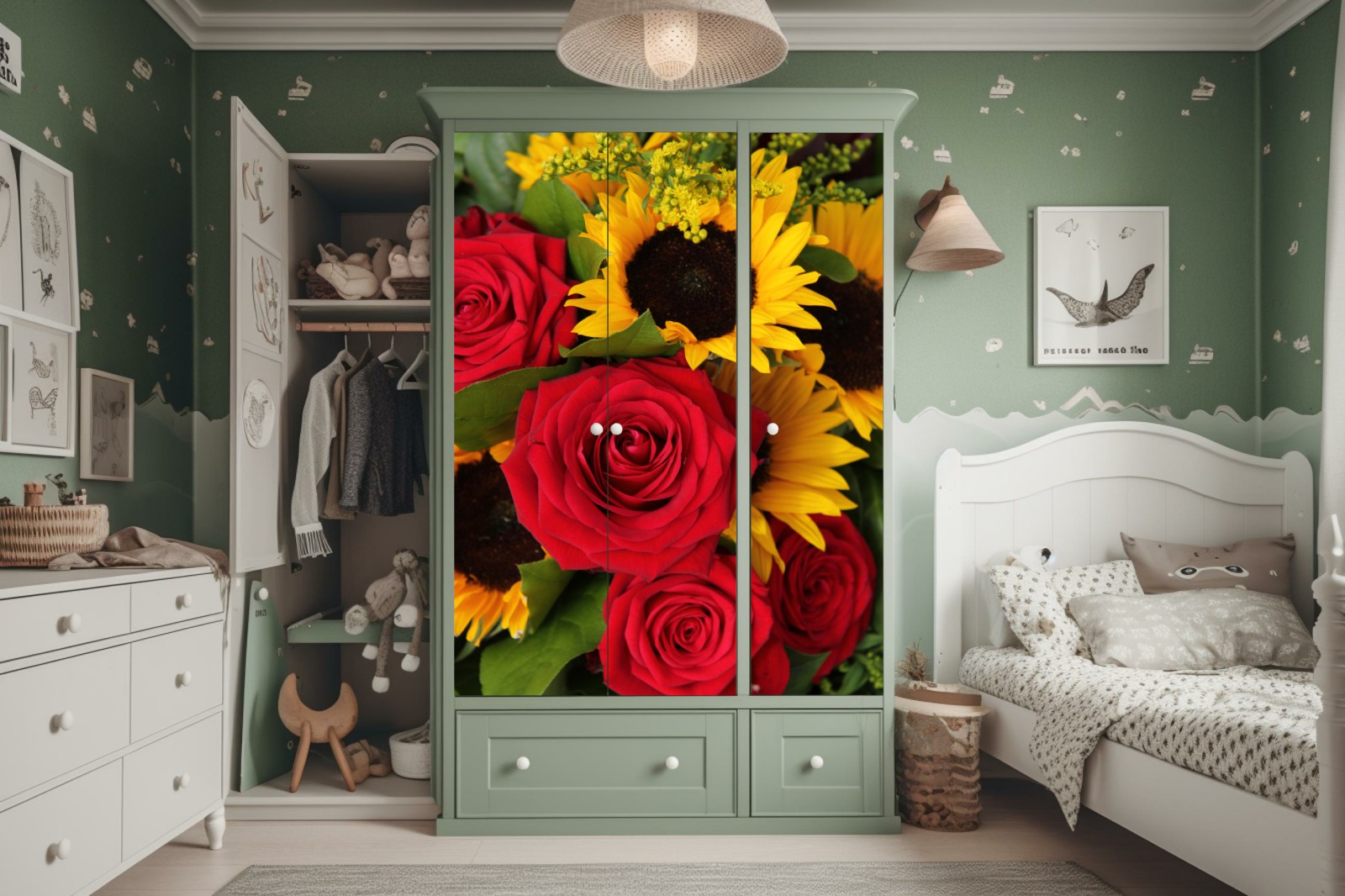 Schrankaufkleber Rote rosen und sonnenblumen im bukett