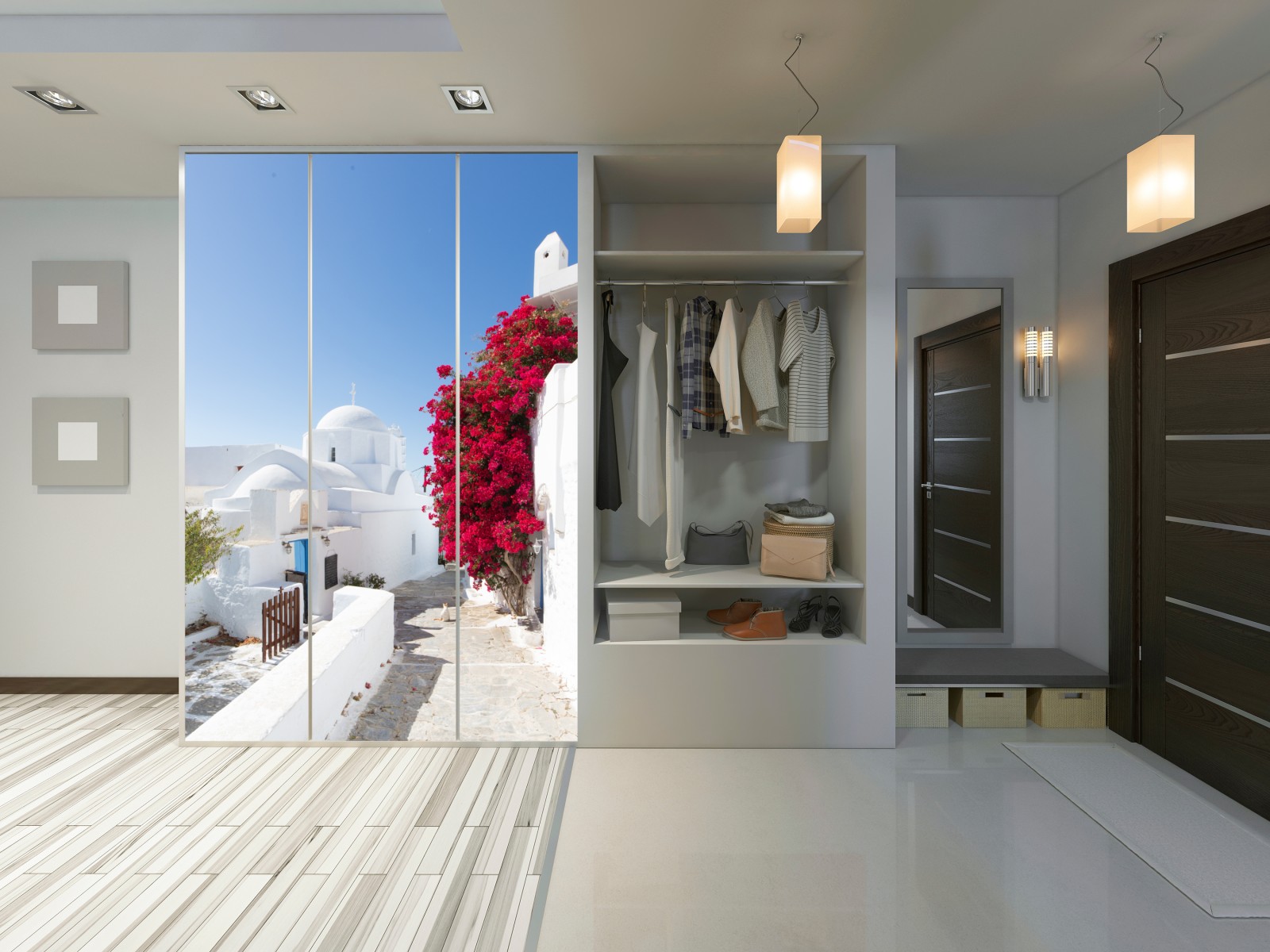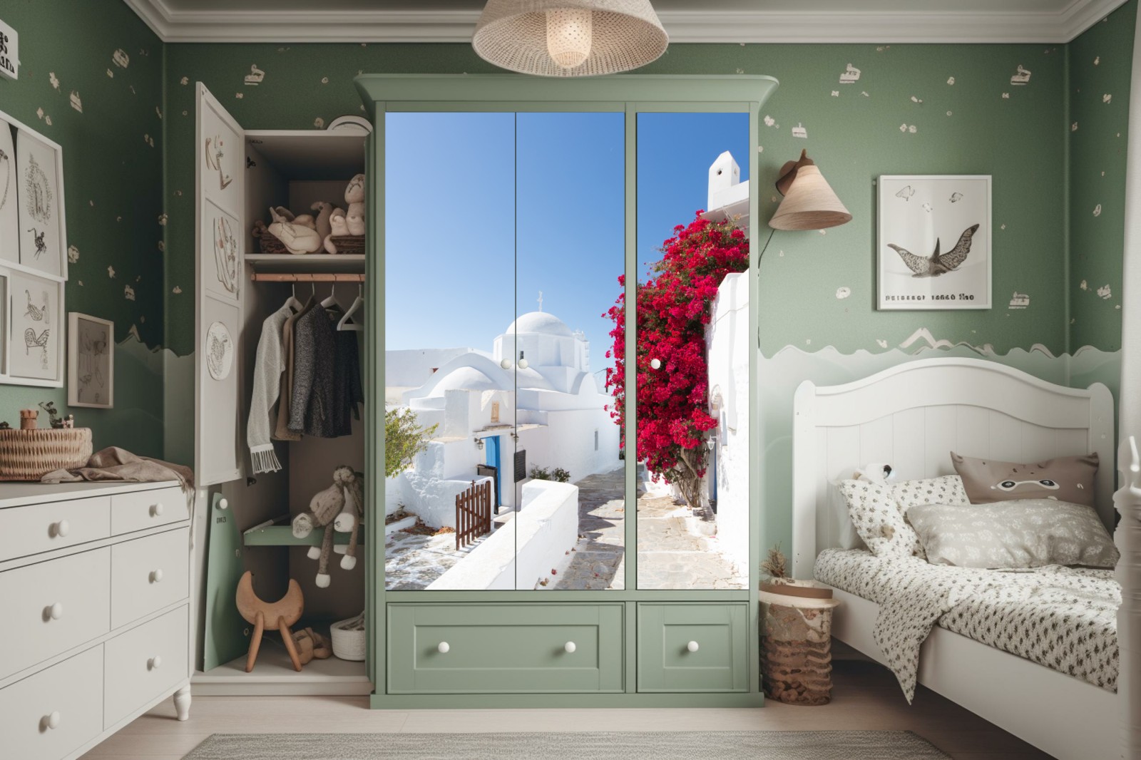 Schrankaufkleber Sonnige gasse auf der insel mit leuchtender buganvillea