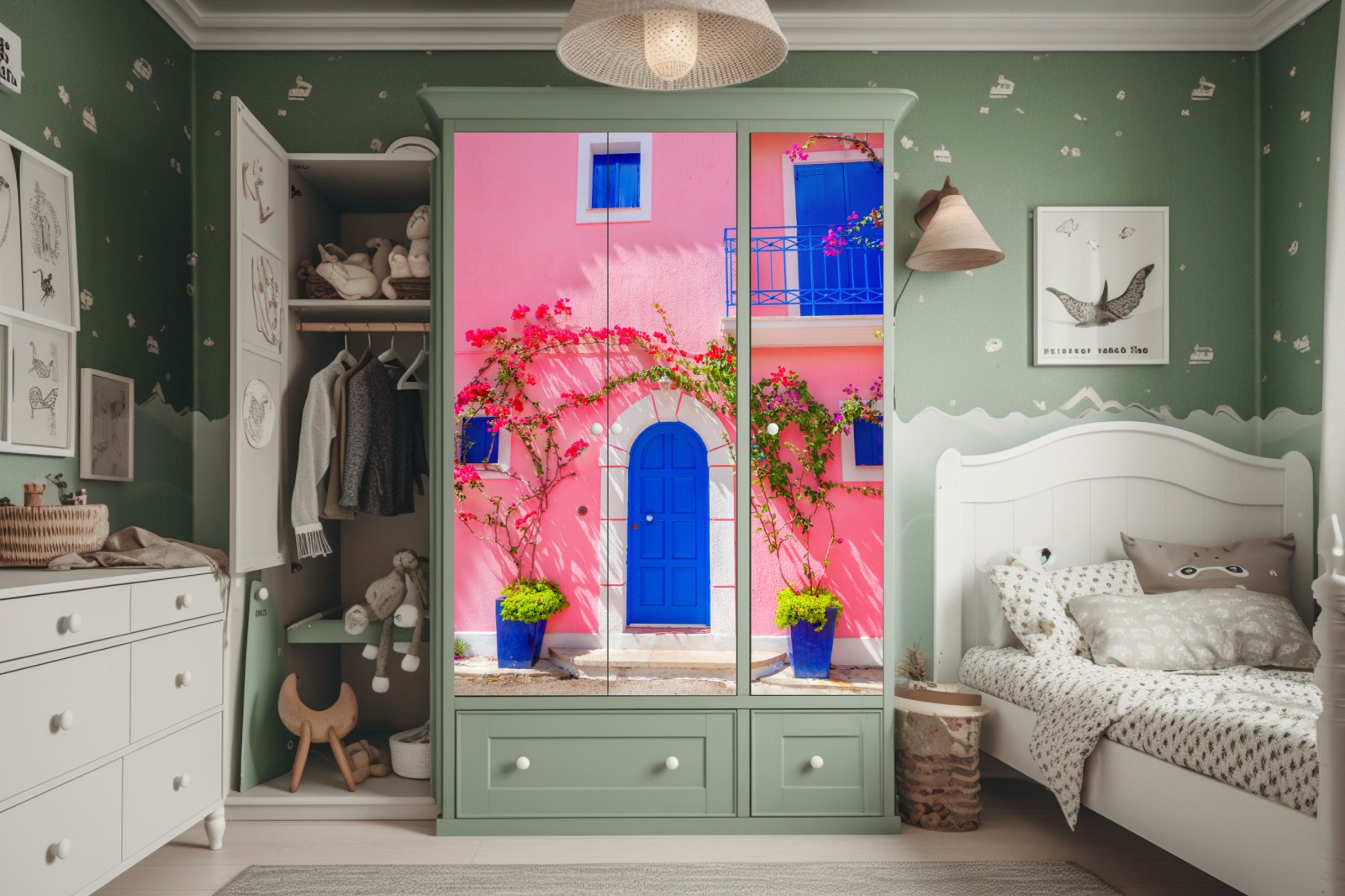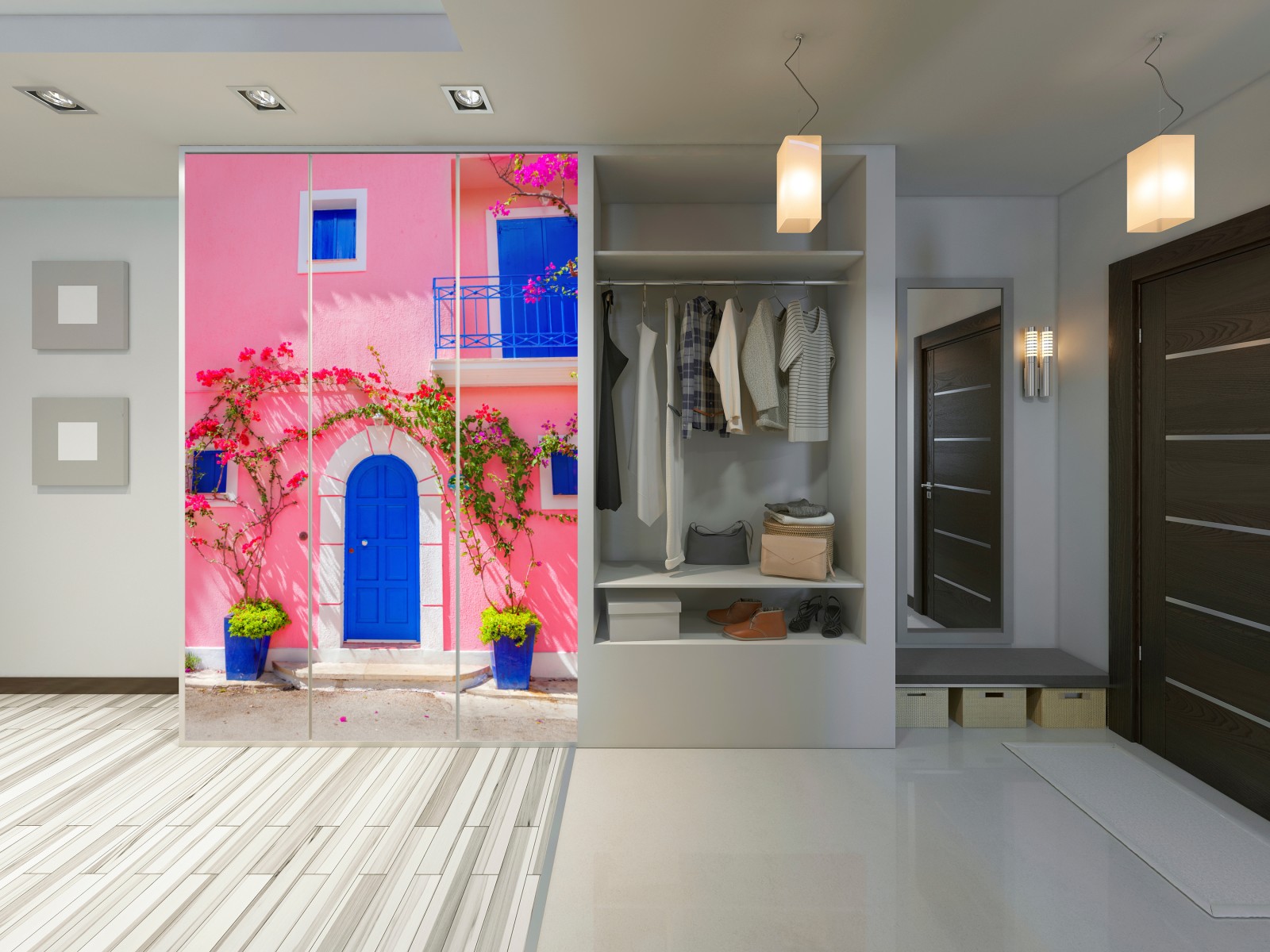Schrankaufkleber Leuchtende rosa fassade mit blauer tür