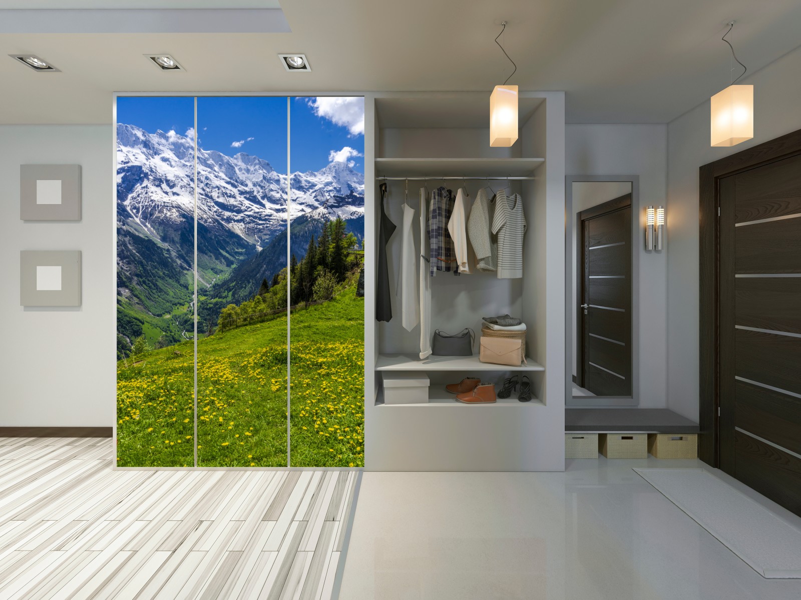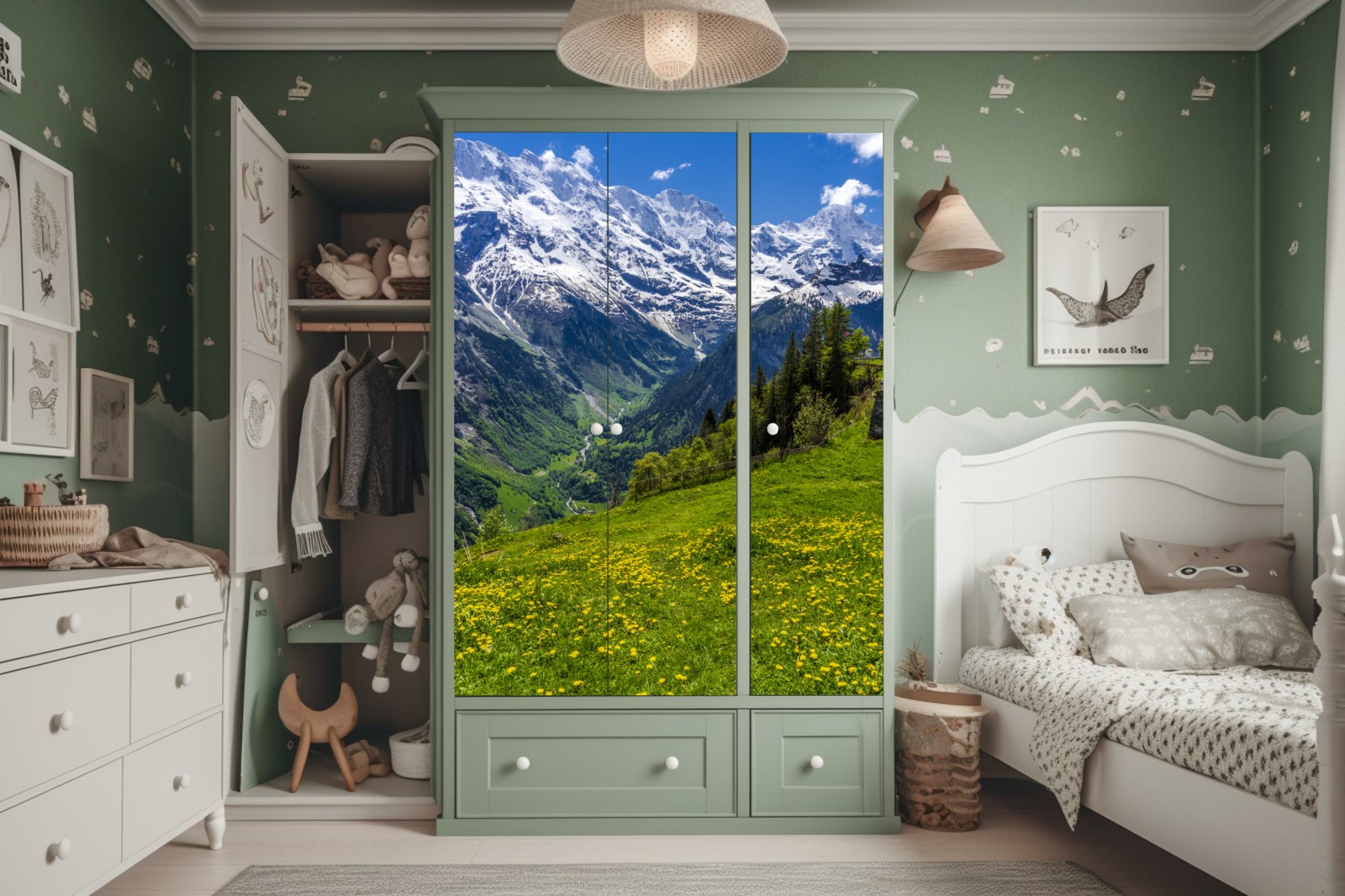 Schrankaufkleber Alpwiese im frühling vor schneebedeckten gipfeln