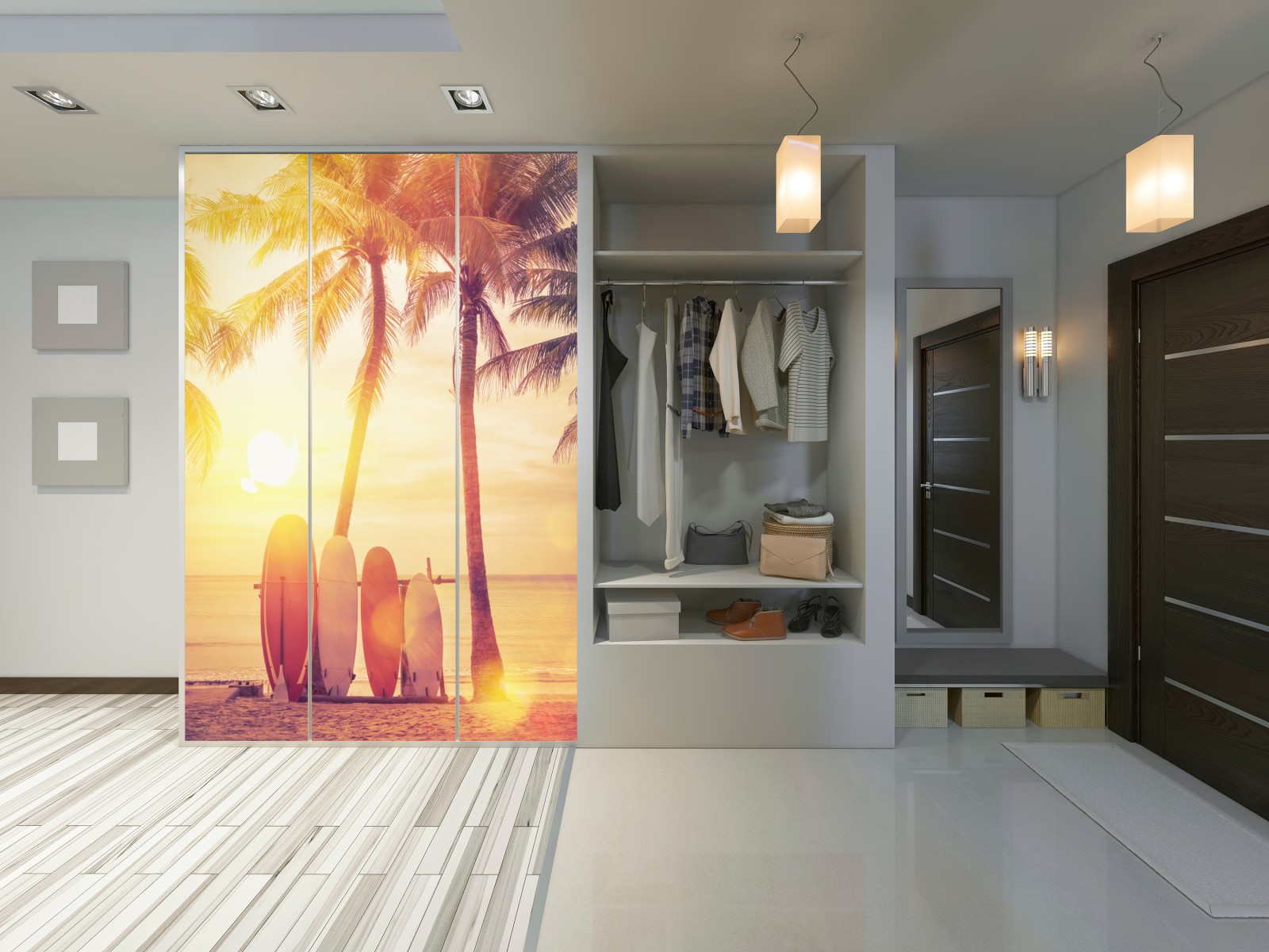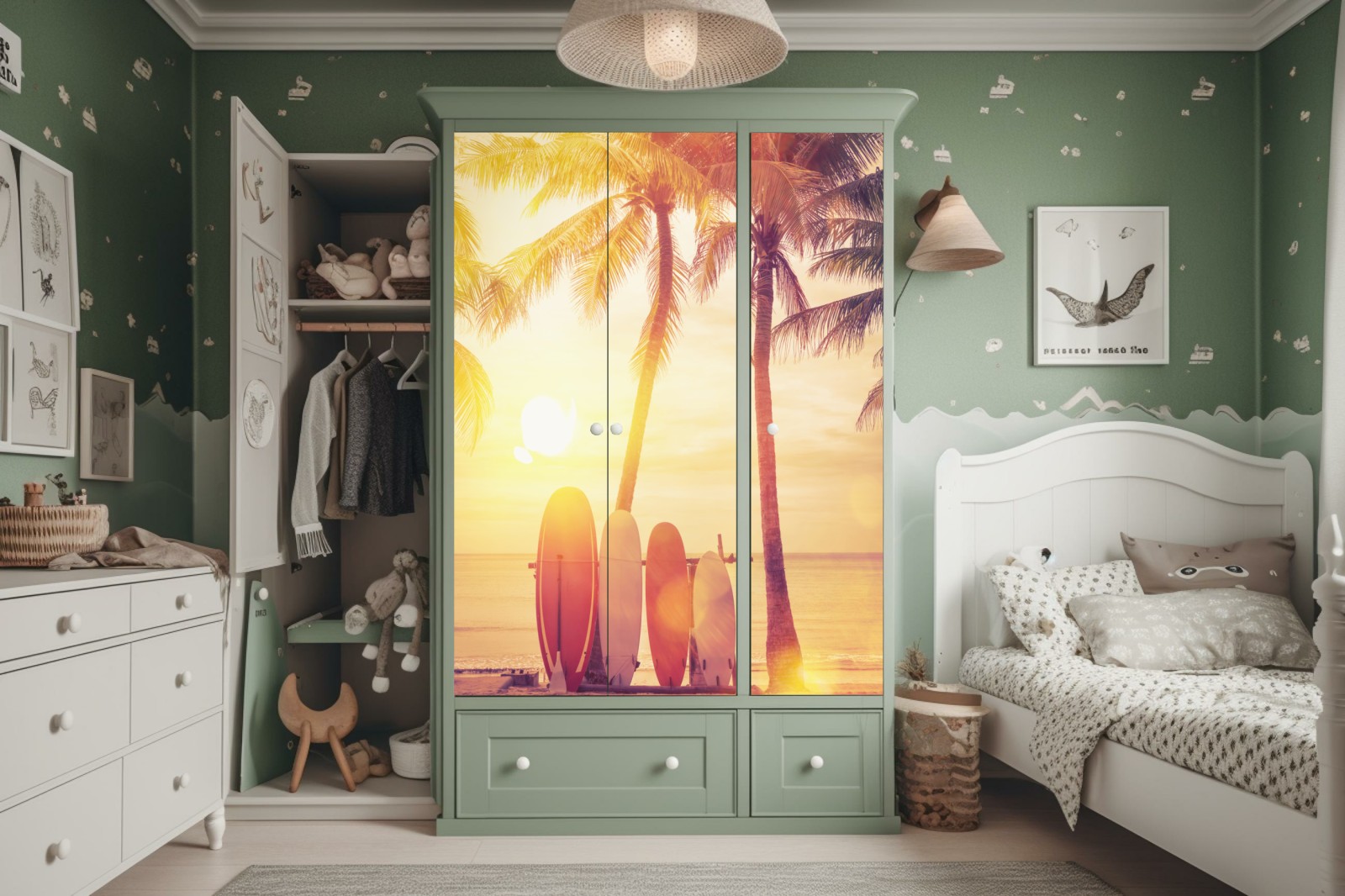 Schrankaufkleber Tropischer sonnenuntergang mit surfboards
