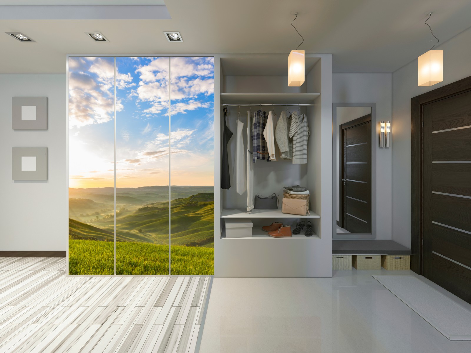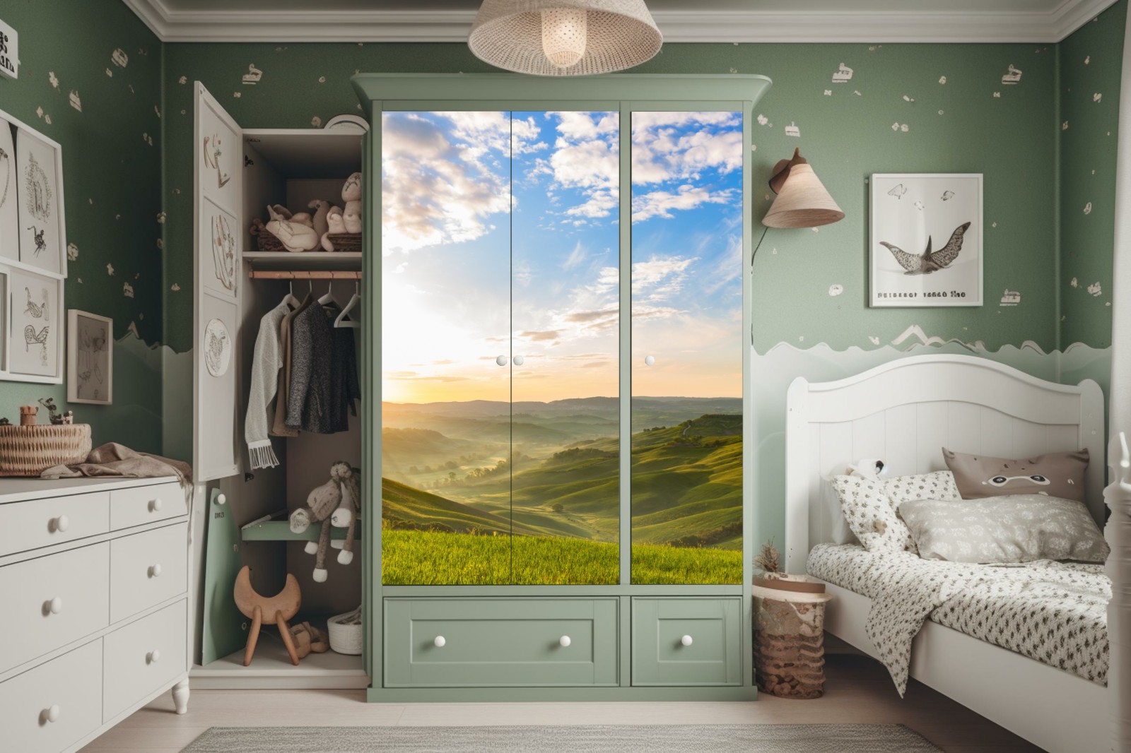 Schrankaufkleber Sonnenaufgang über nebligen hügeln