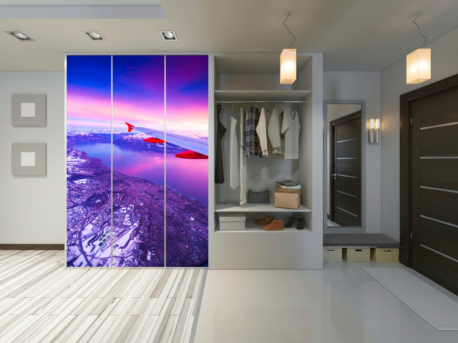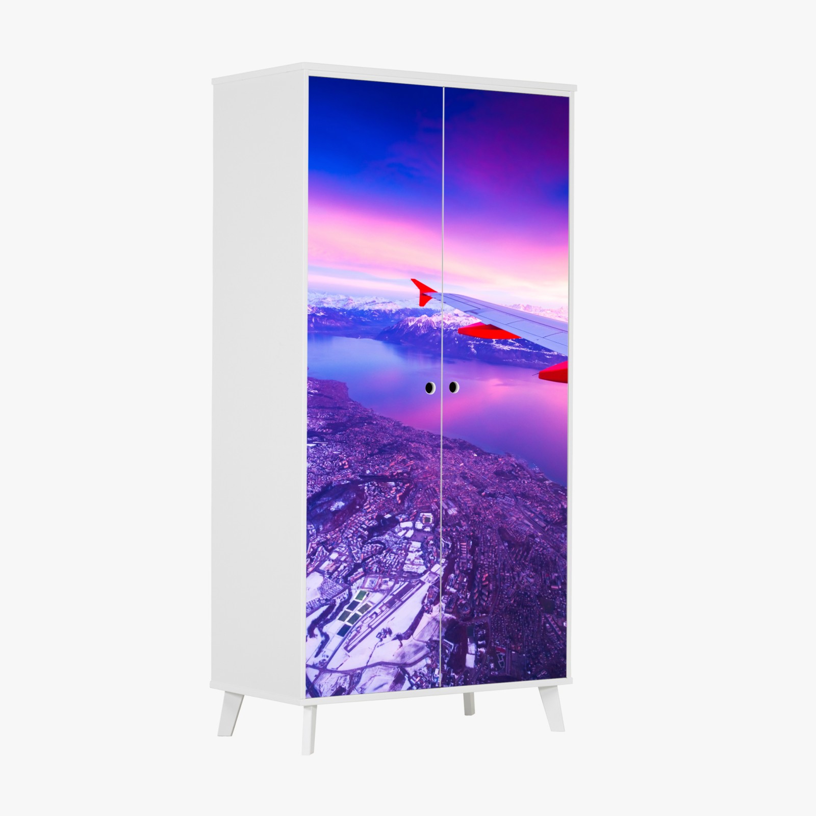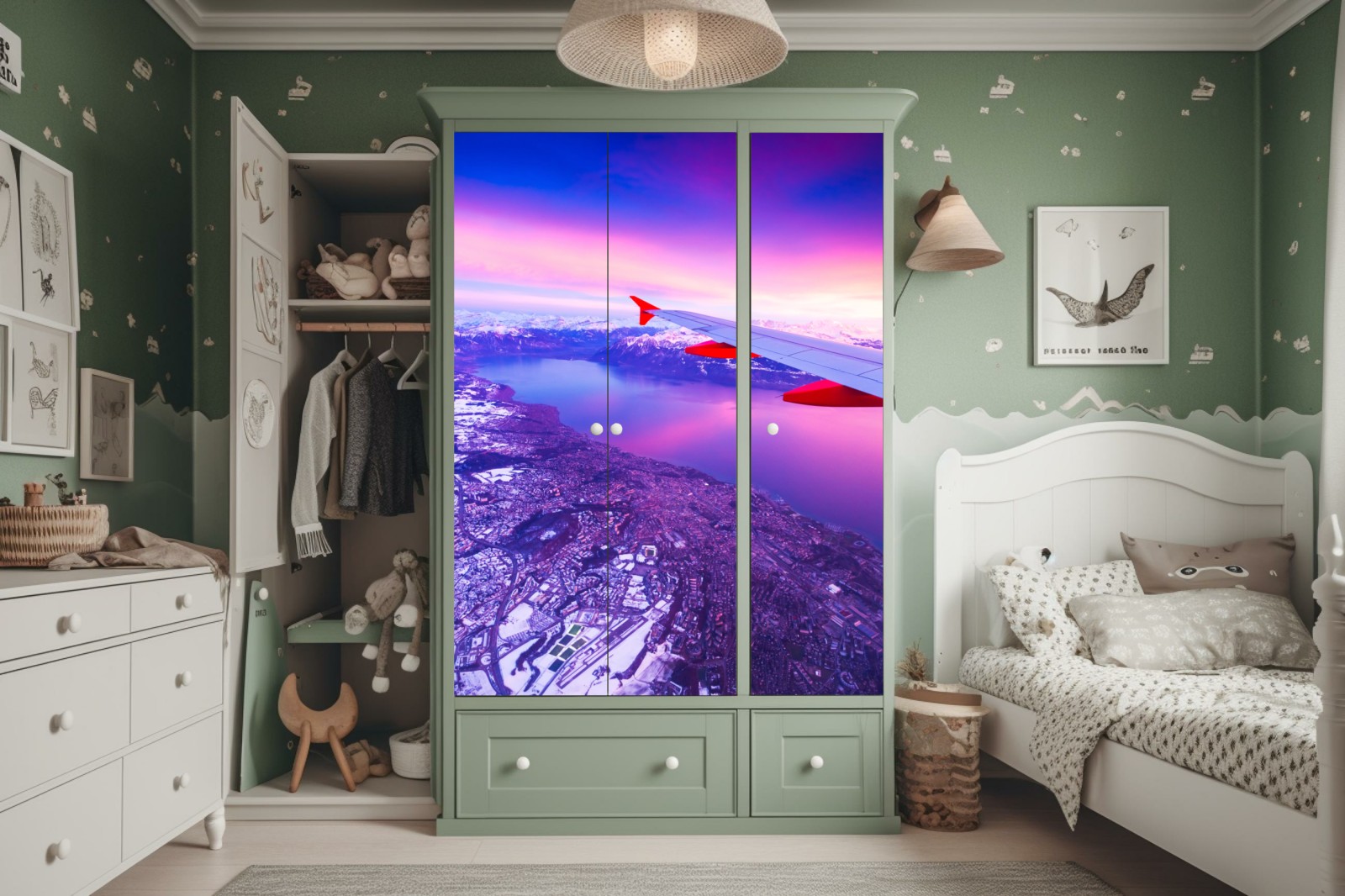 Schrankaufkleber Luftaufnahme einer stadt am see bei sonnenuntergang