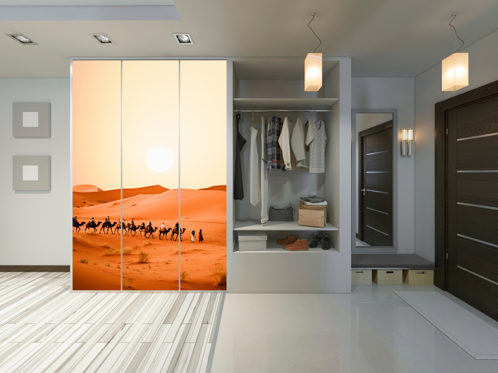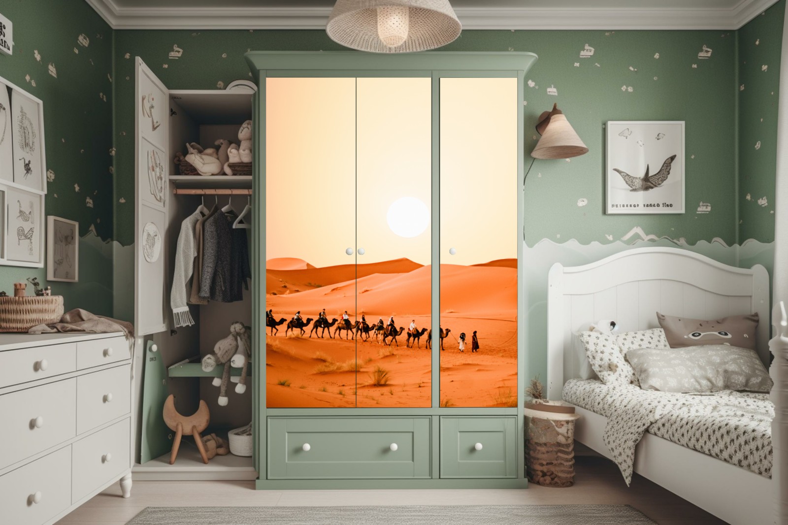 Schrankaufkleber Karawane von kamelen in der wüste bei sonnenuntergang