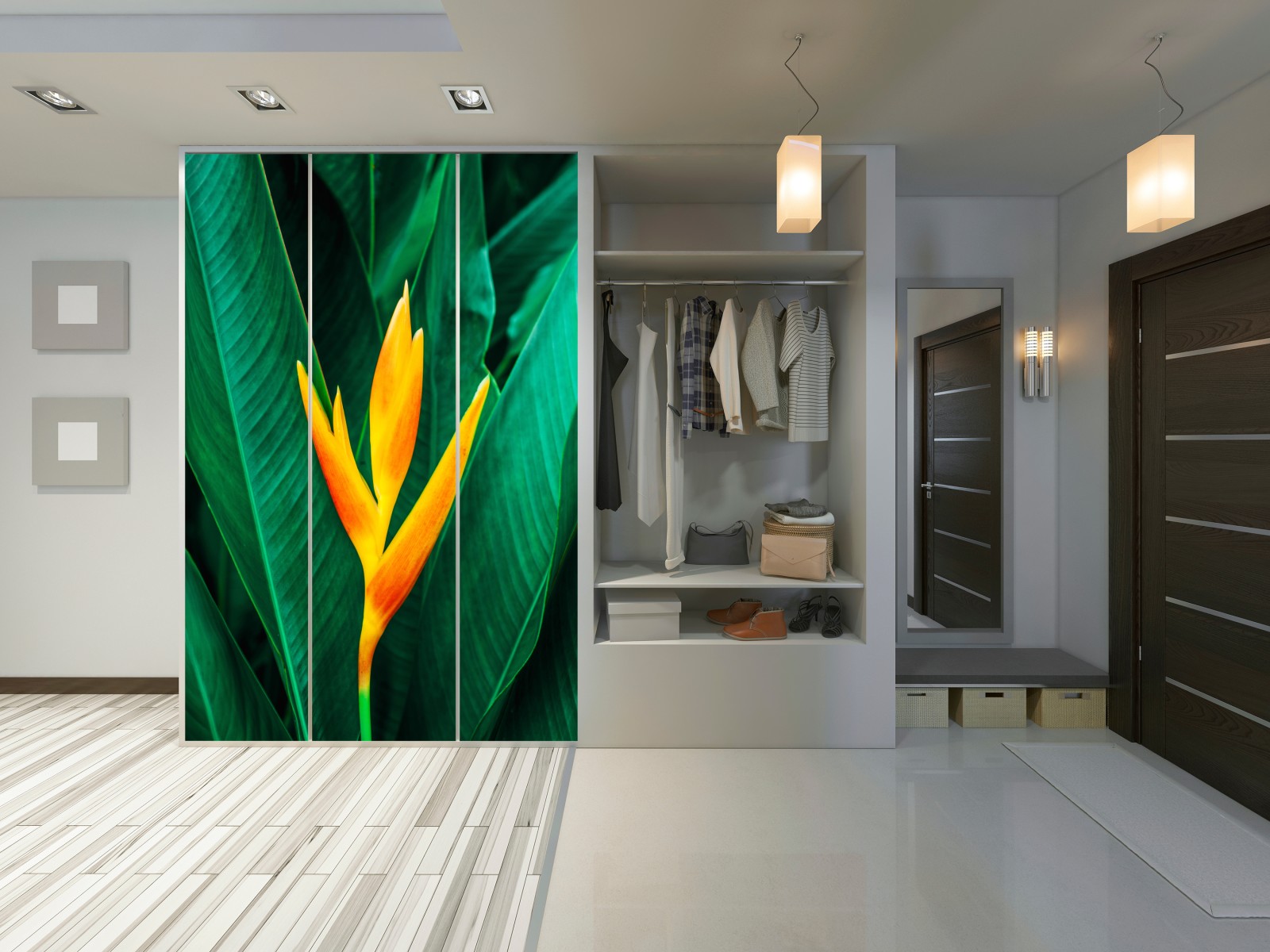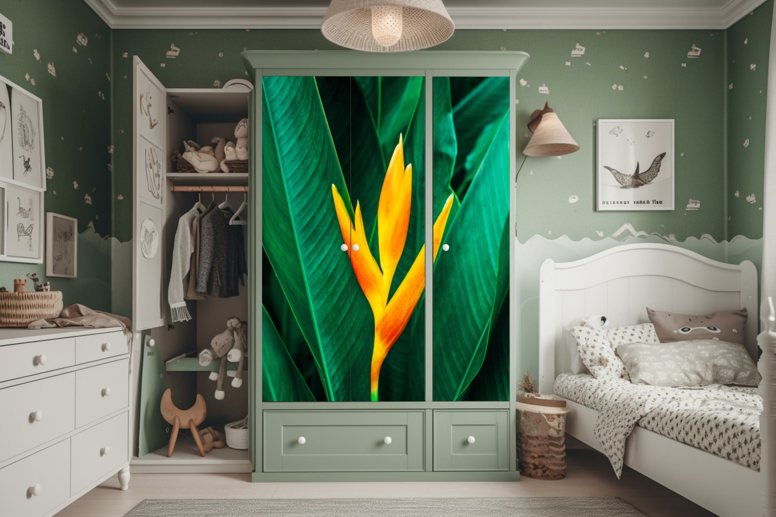 Schrankaufkleber Leuchtende tropische heliconia vor satten grünen blättern