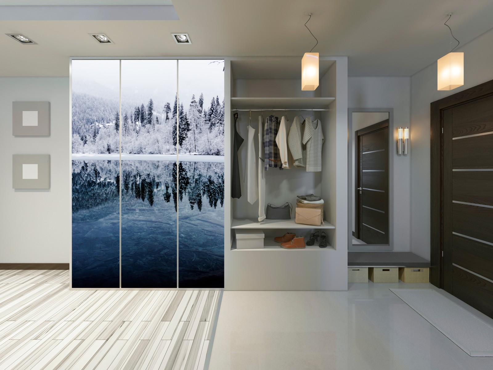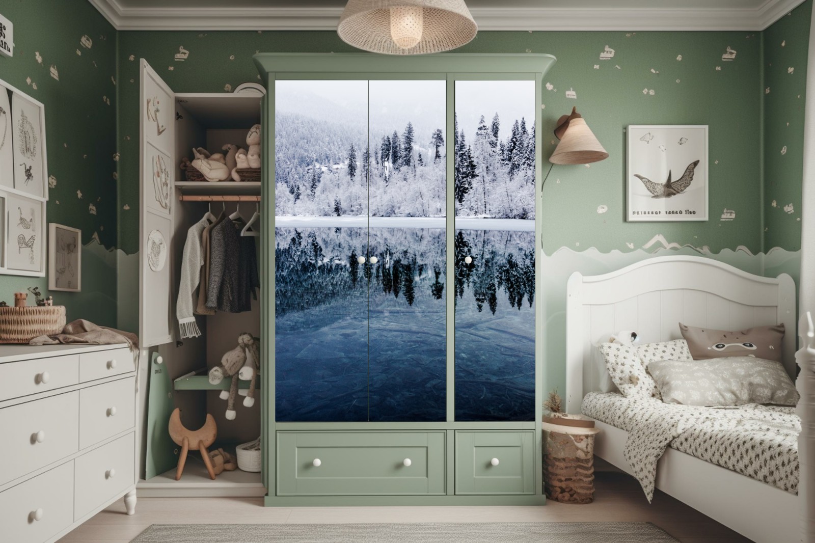 Schrankaufkleber Winterlicher see mit spiegelung im verschneiten wald