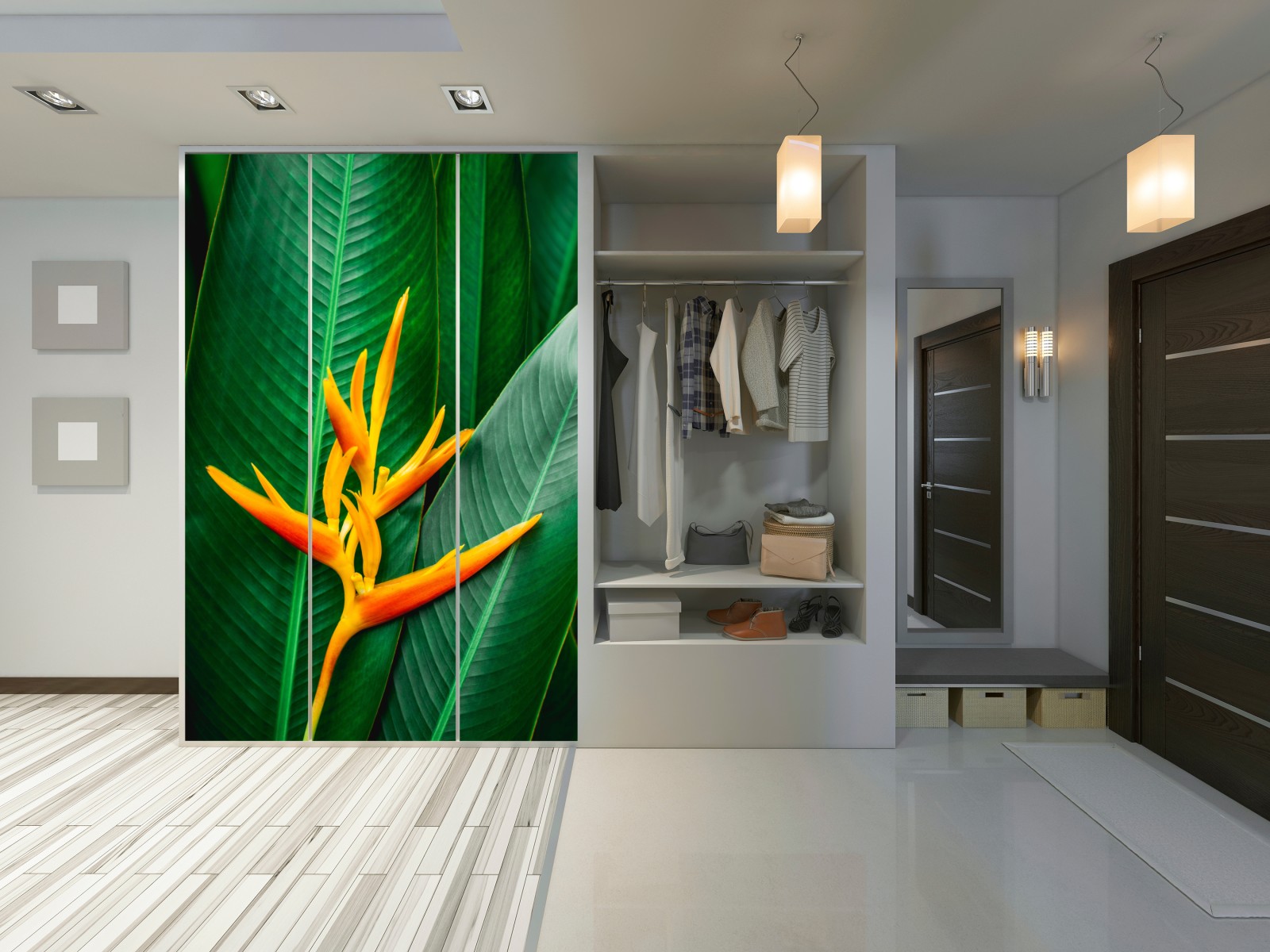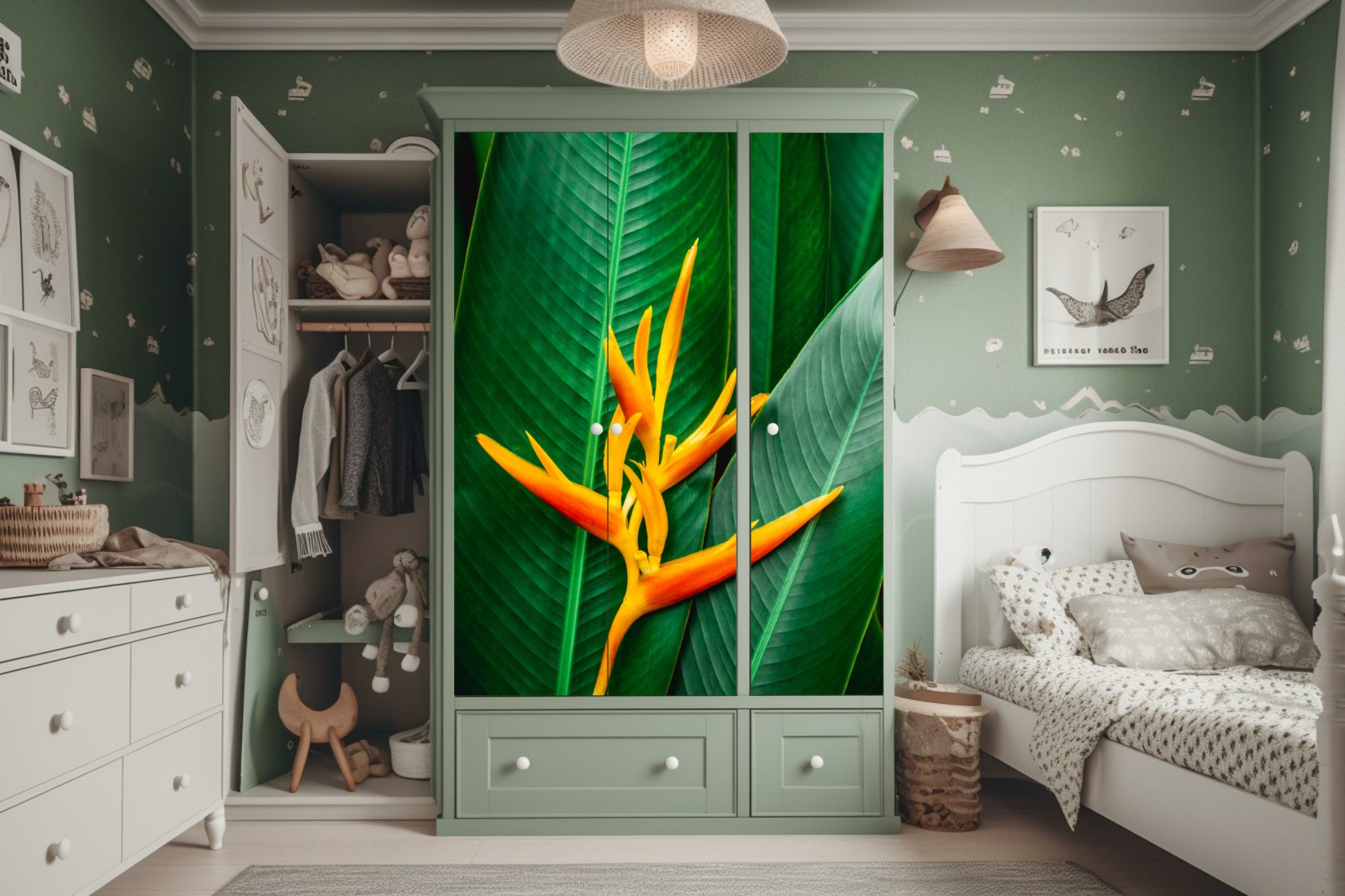 Schrankaufkleber Leuchtende heliconia vor grünen blättern