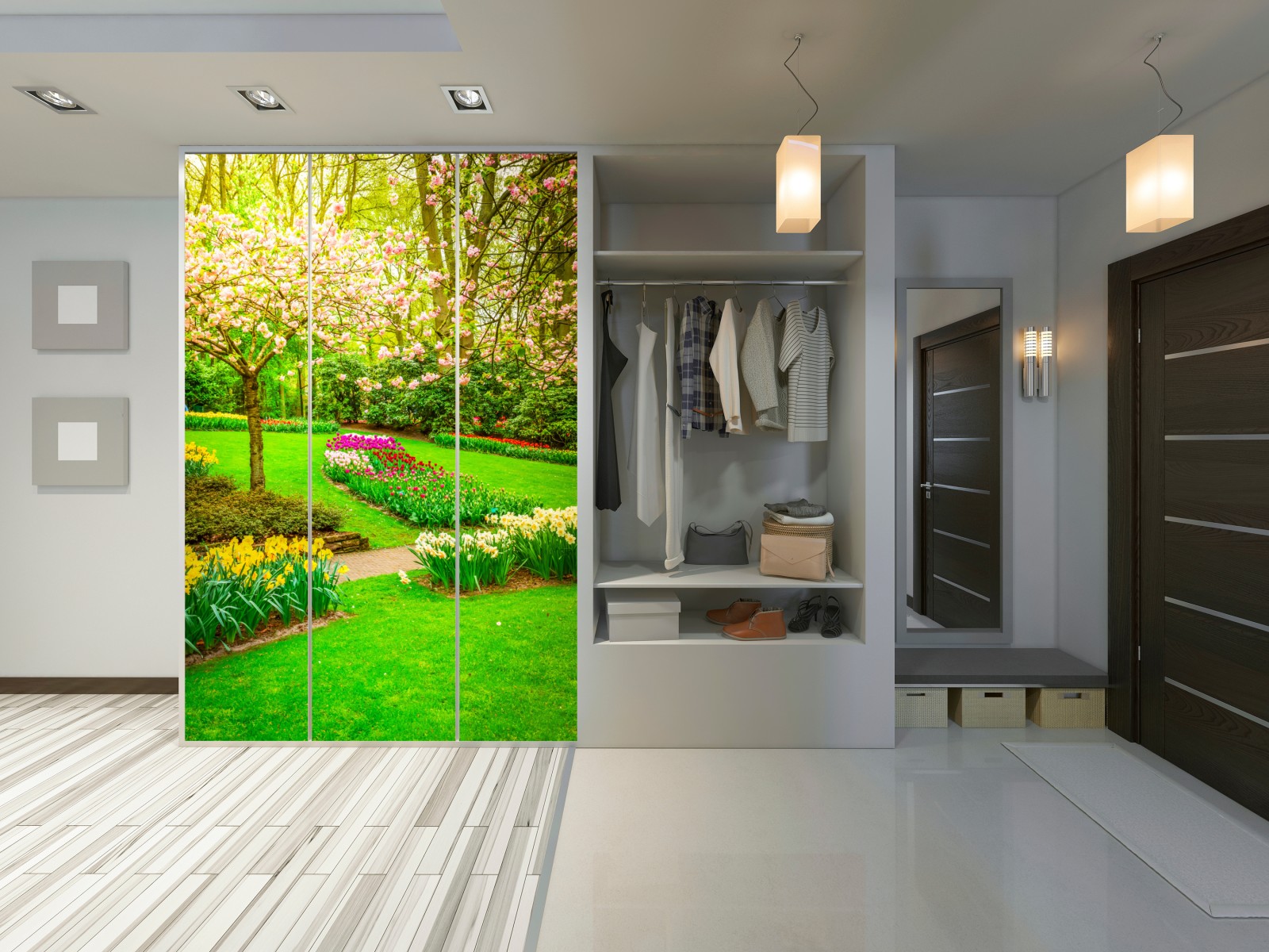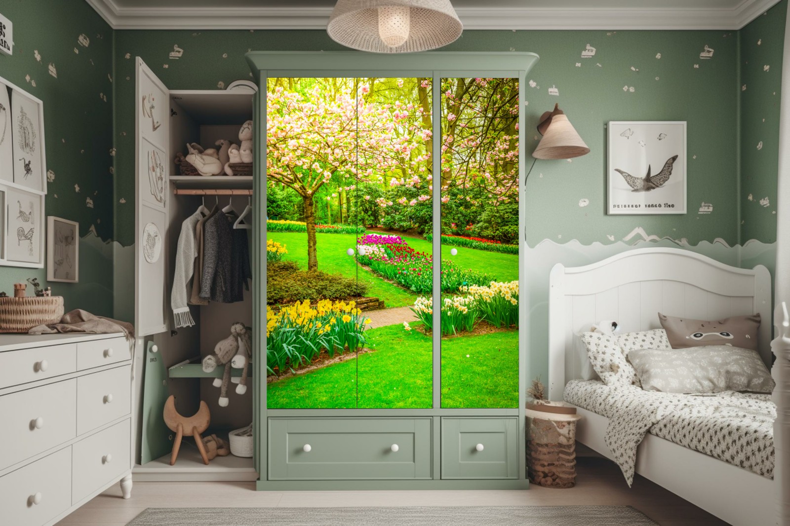 Schrankaufkleber Frühlingsgarten in blüte: tulpen und kirschblüten