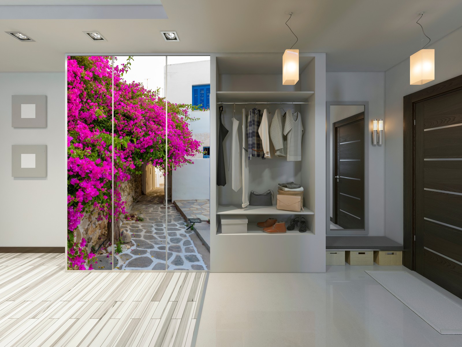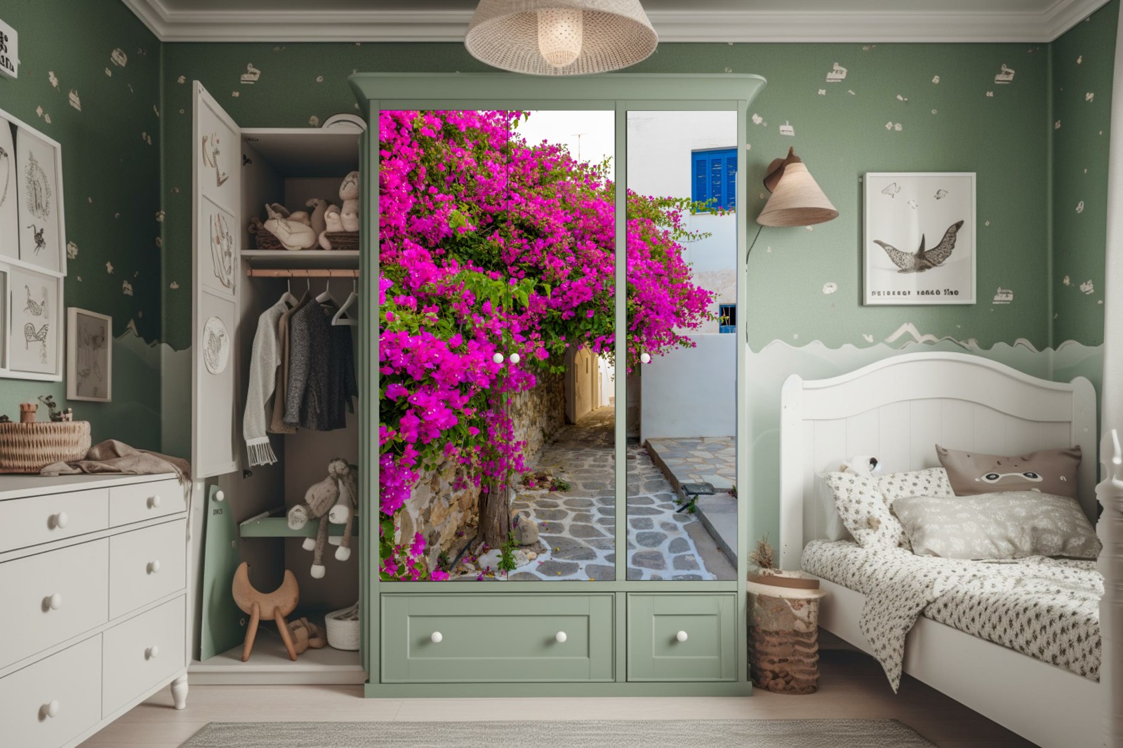 Schrankaufkleber Blühende bougainvillea in Naousa gasse
