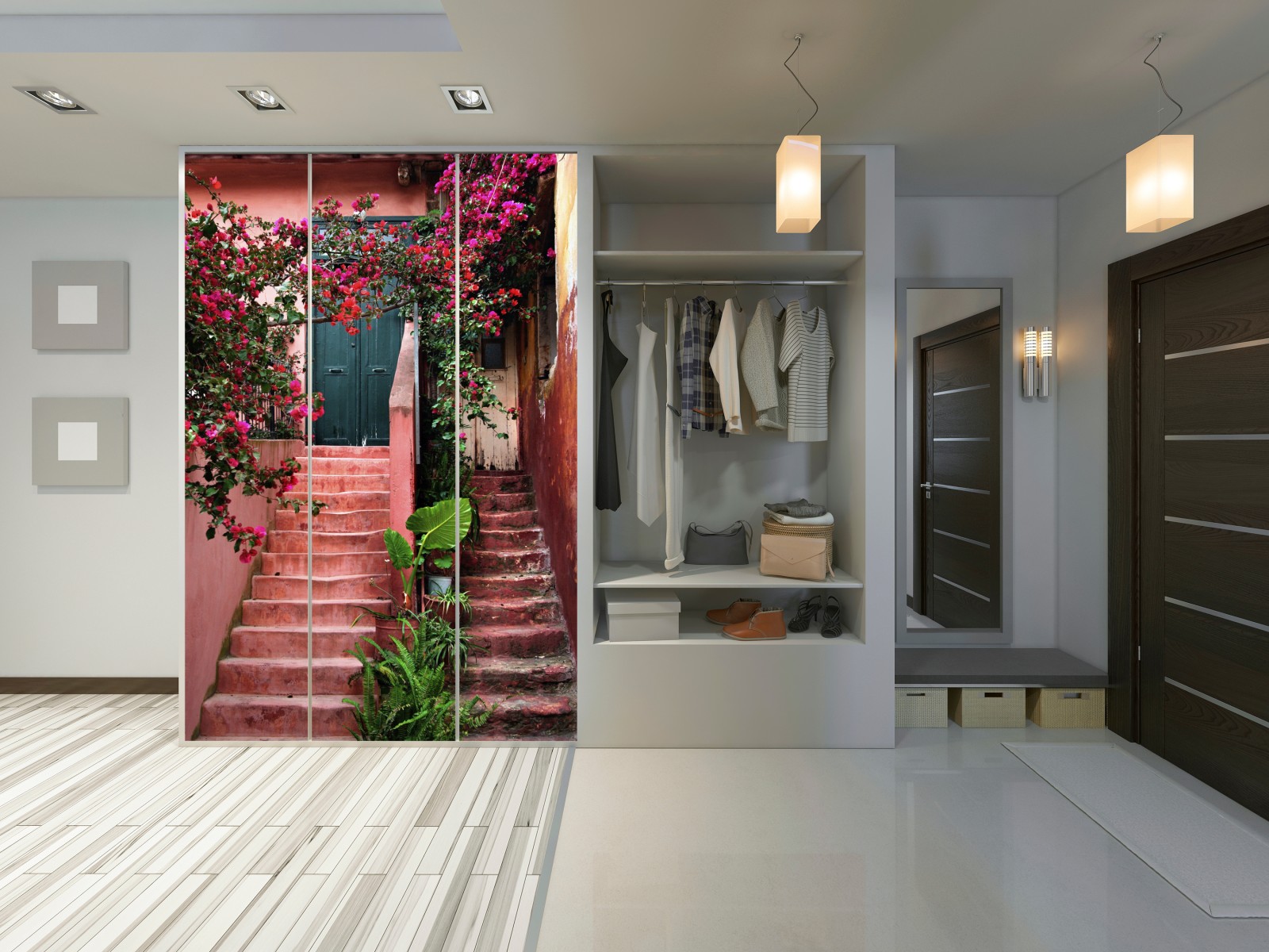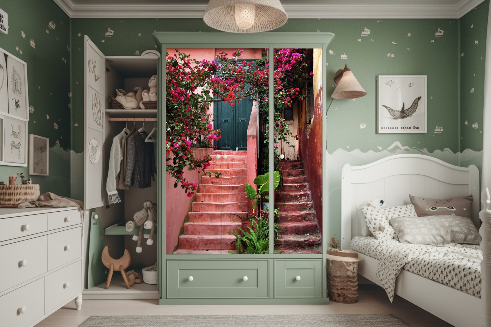 Schrankaufkleber Treppe mit bougainvillea und grünen pflanzen