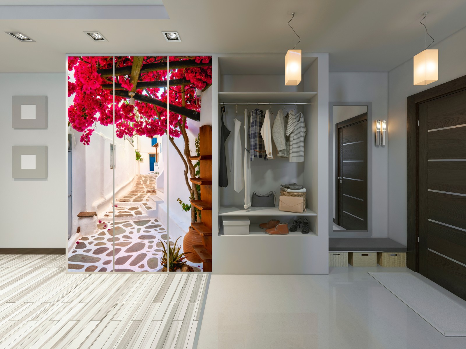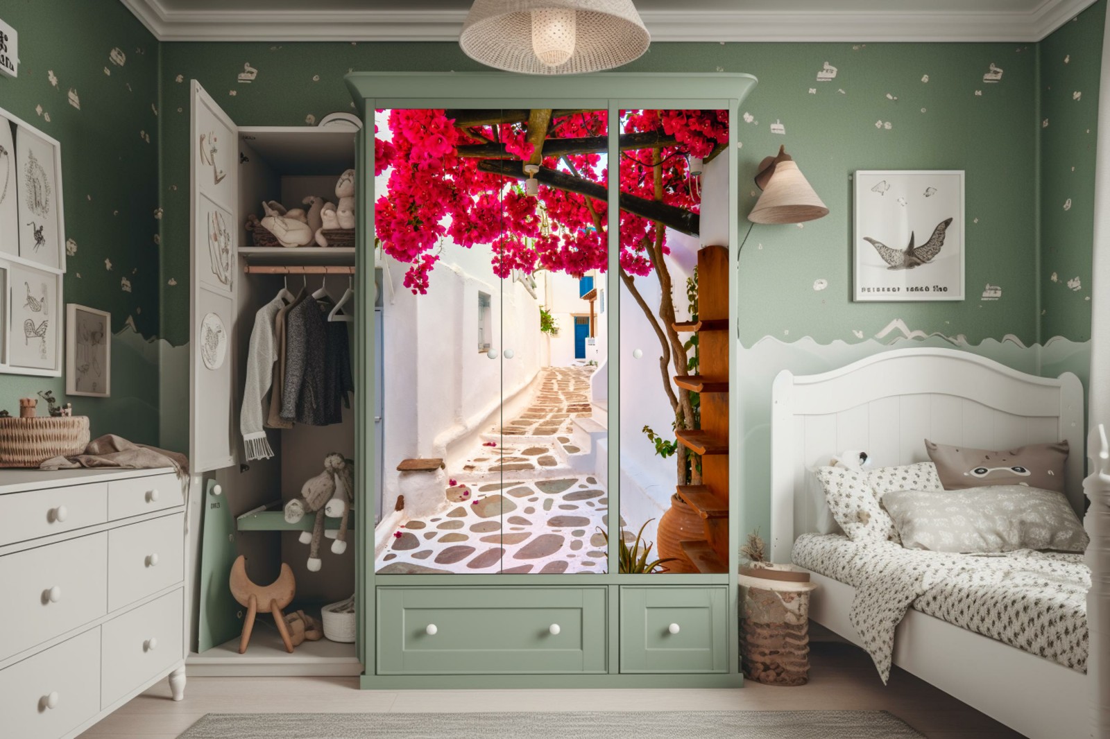 Schrankaufkleber Sonnige gasse in Griechenland mit bougainvillea
