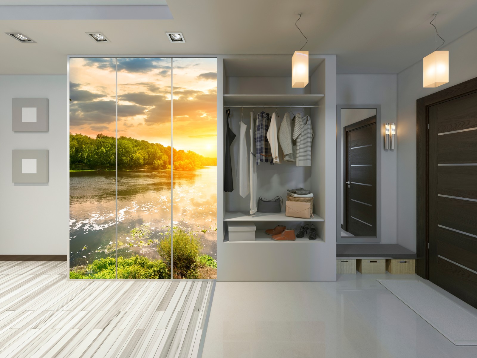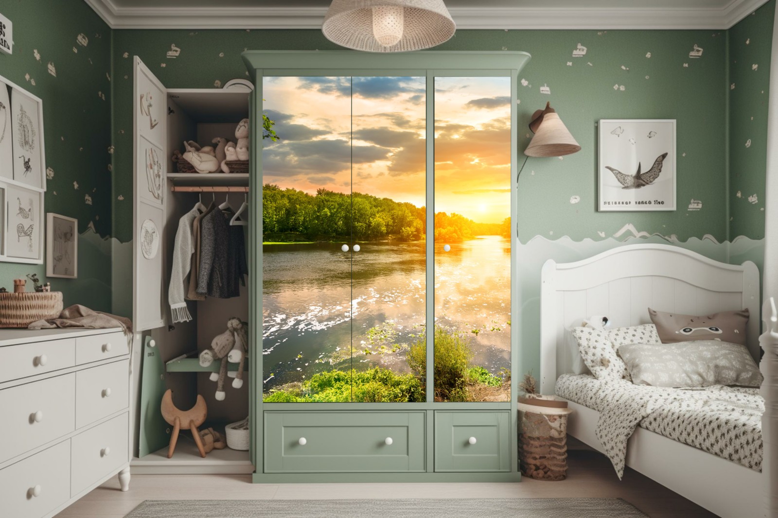 Schrankaufkleber Ruhiger sonnenuntergang am fluss im grünen wald
