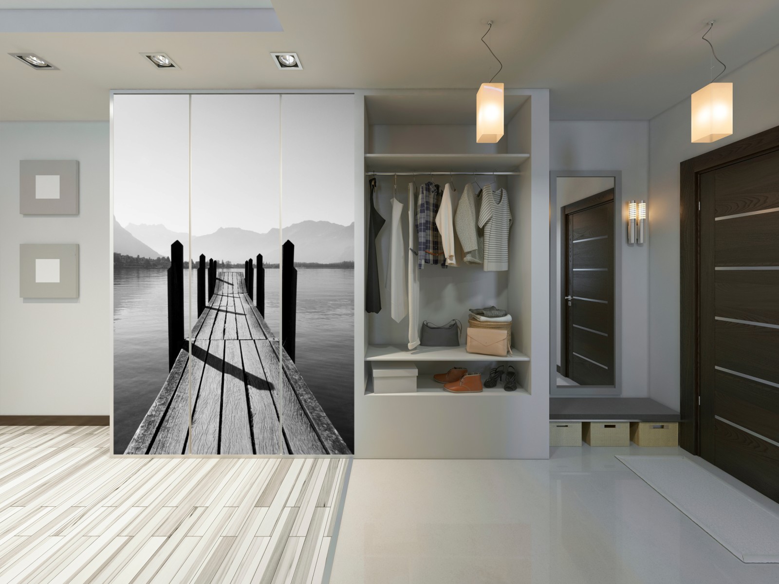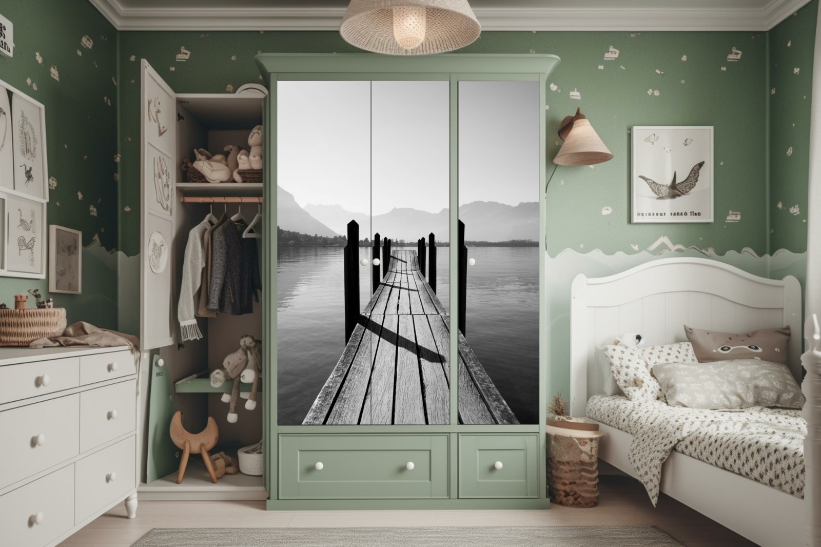Schrankaufkleber Ruhiger steg am see in schwarzweiß