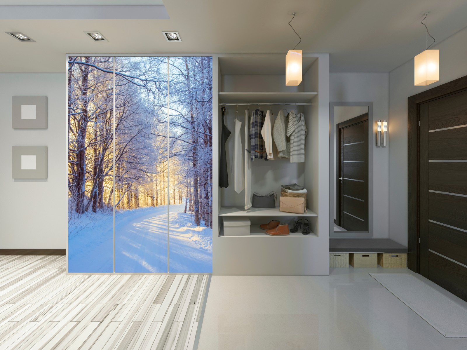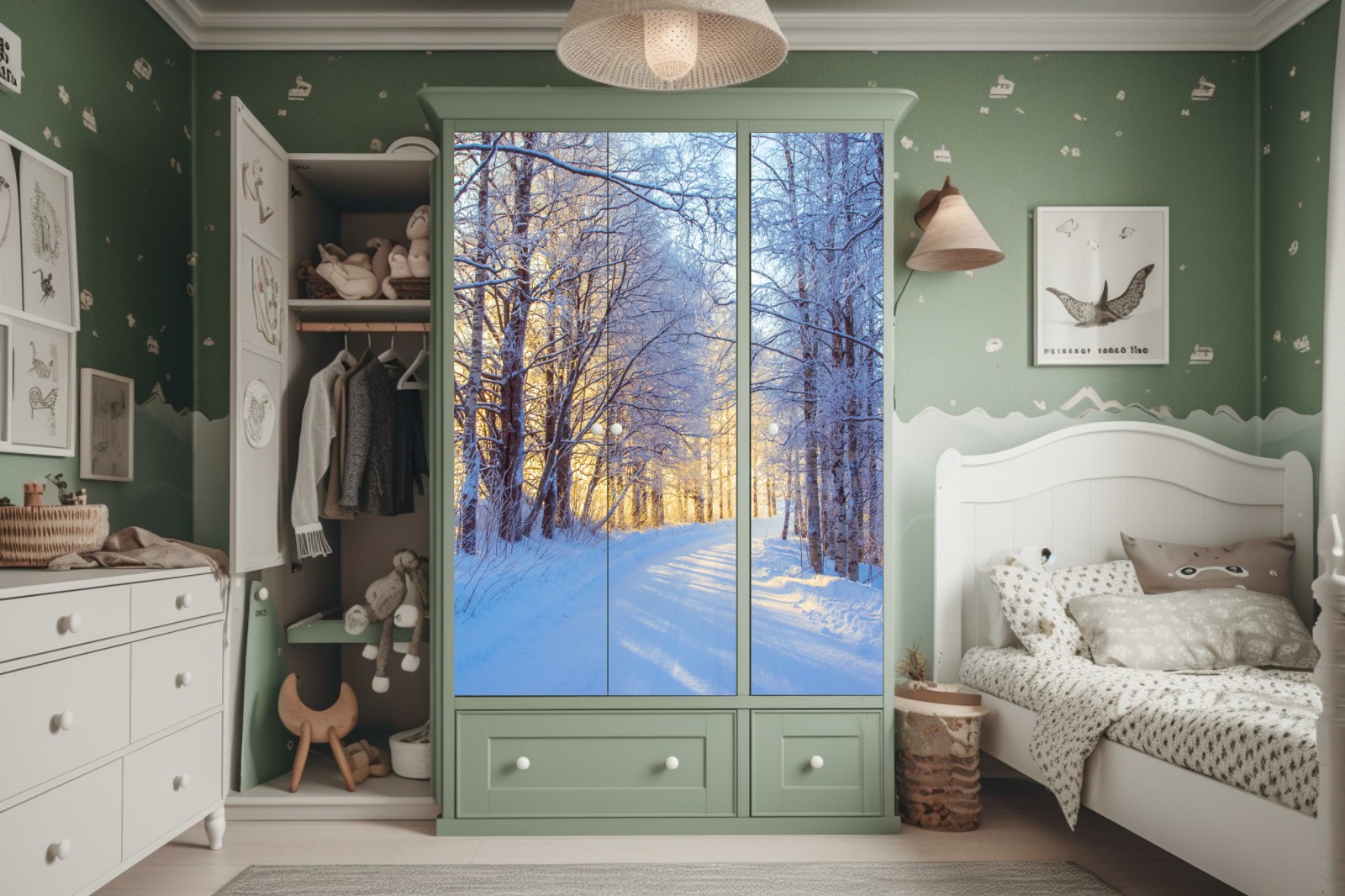 Schrankaufkleber Birkenwald im winter bei sonnenaufgang