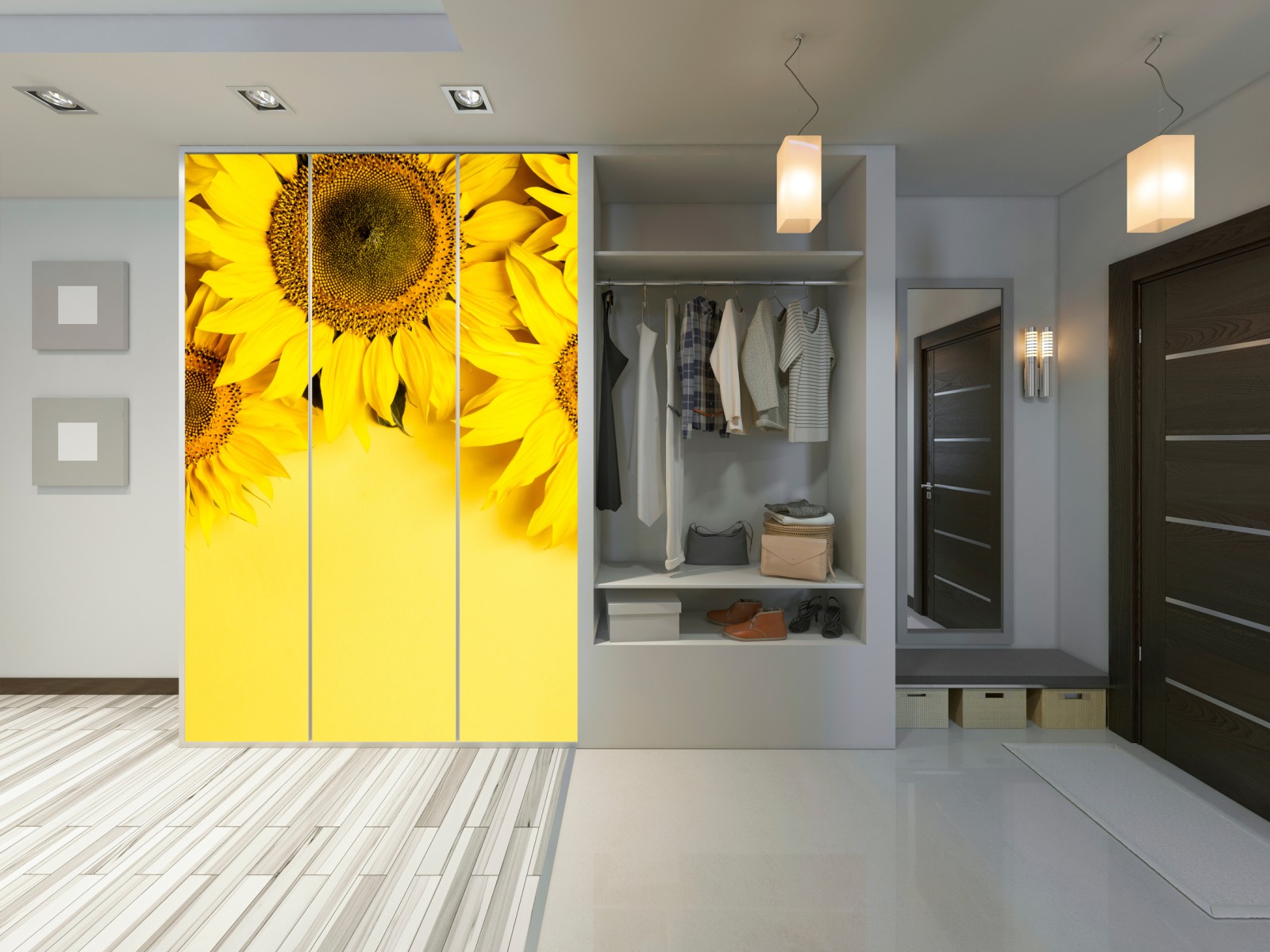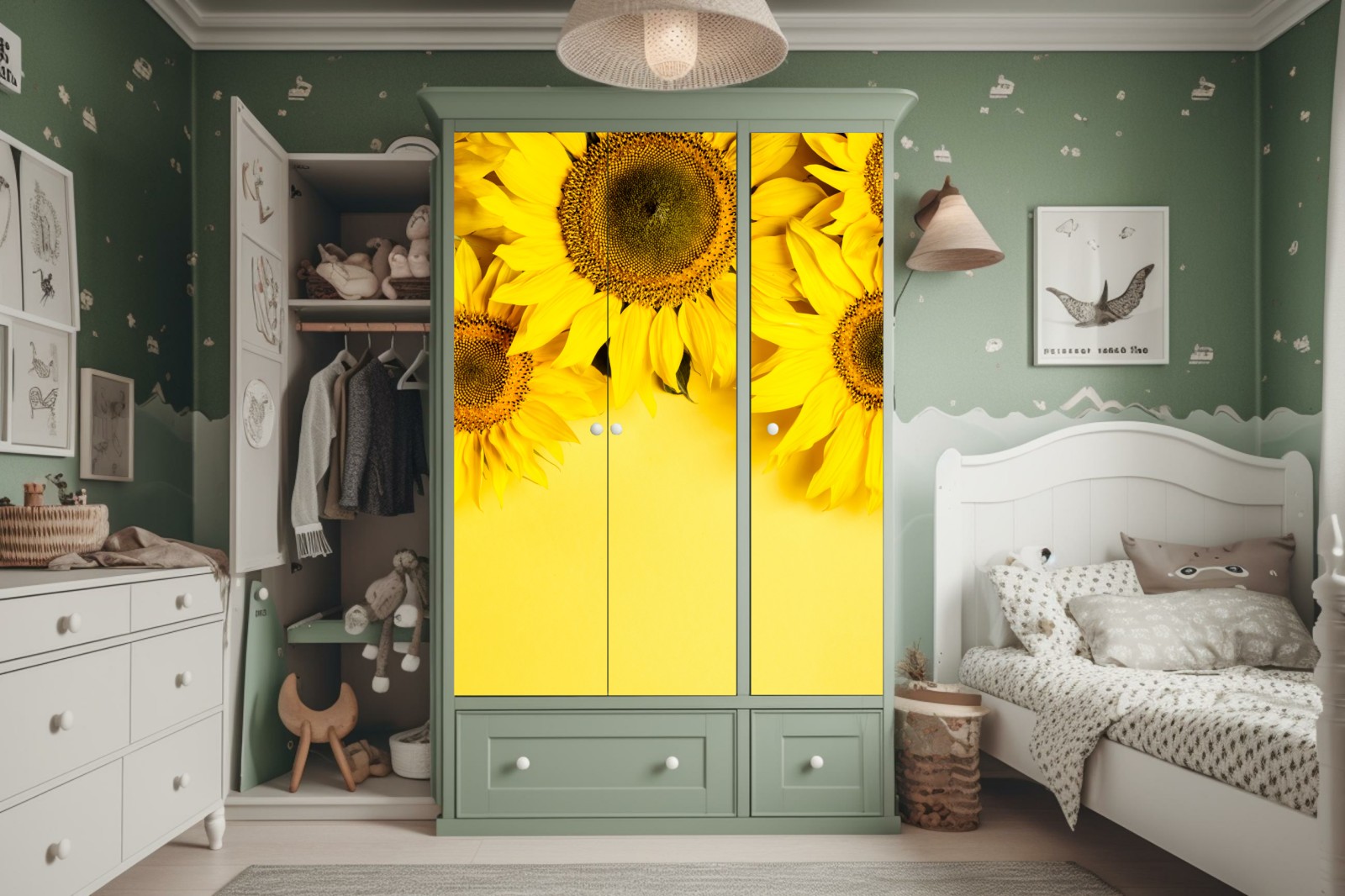 Schrankaufkleber Leuchtender sonnenblumenstrauß auf gelbem hintergrund