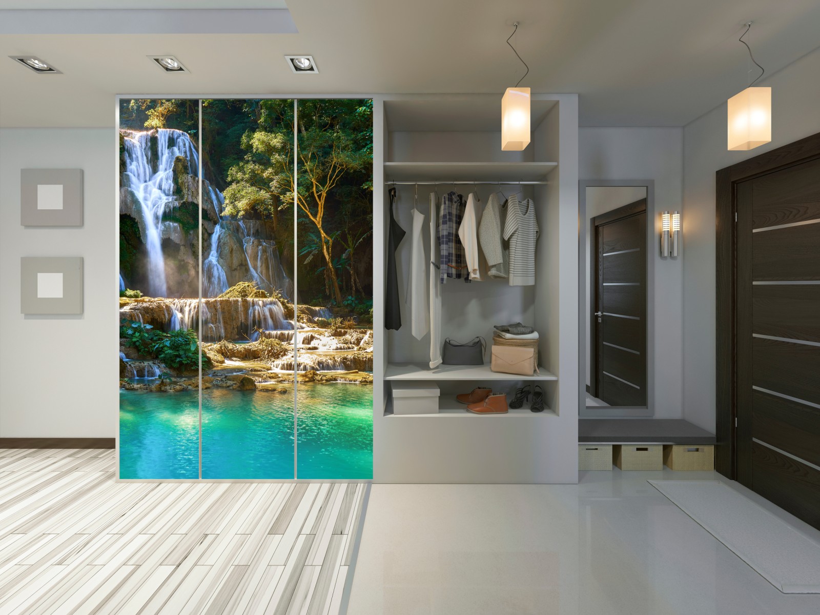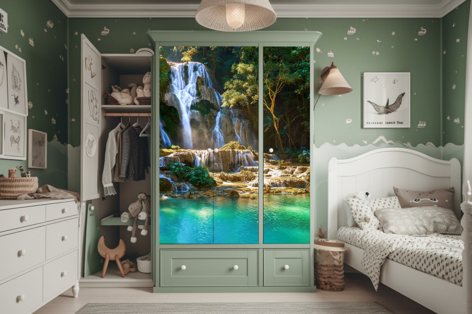 Schrankaufkleber Türkisfarbener wasserfall im üppigen wald