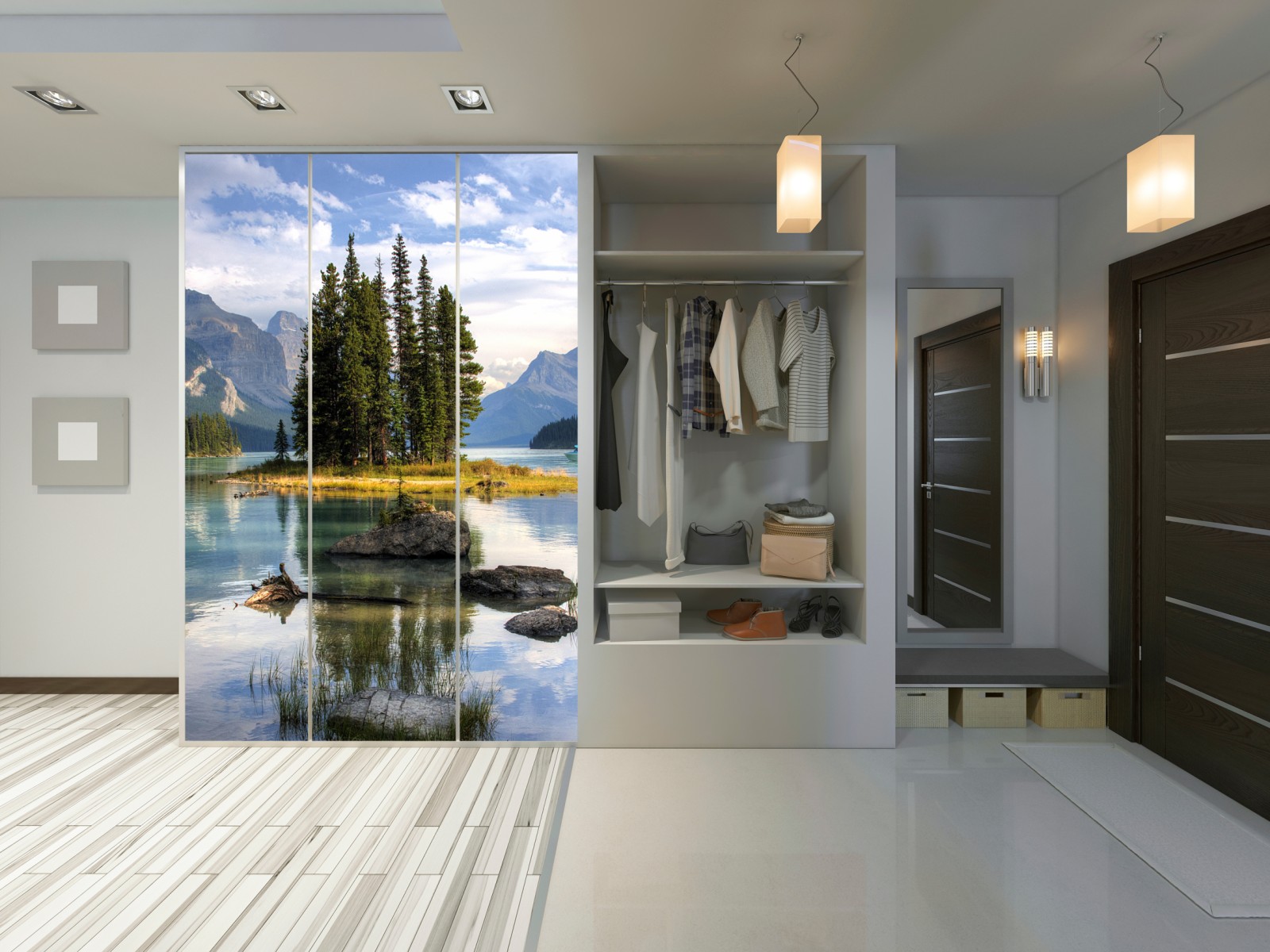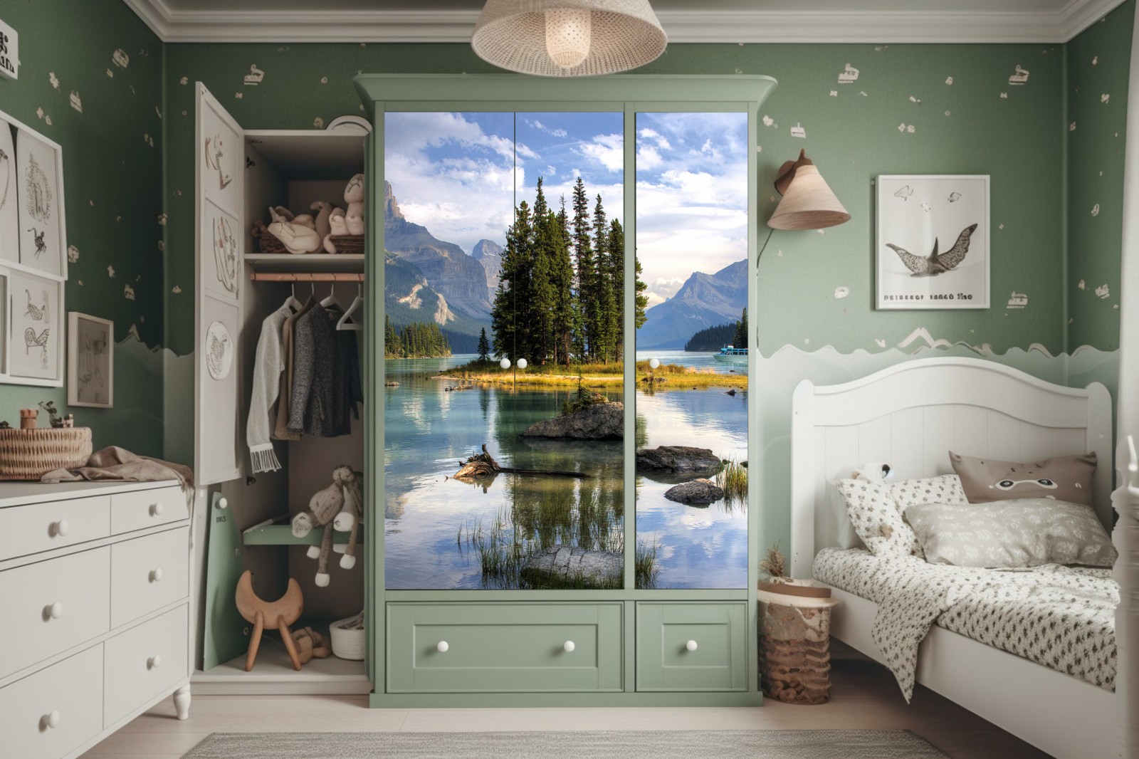 Schrankaufkleber Ruhiger alpensee mit insel und bergen