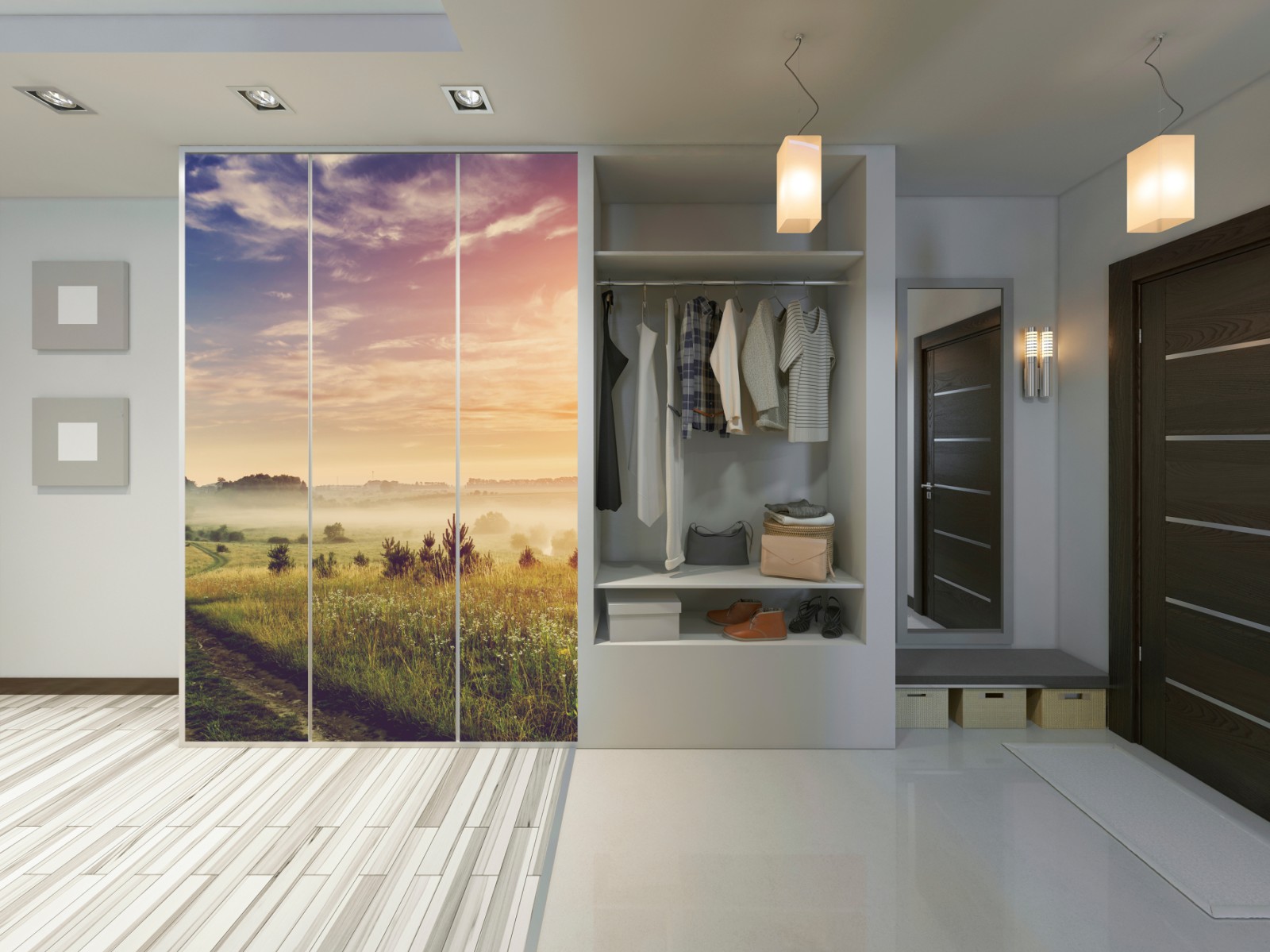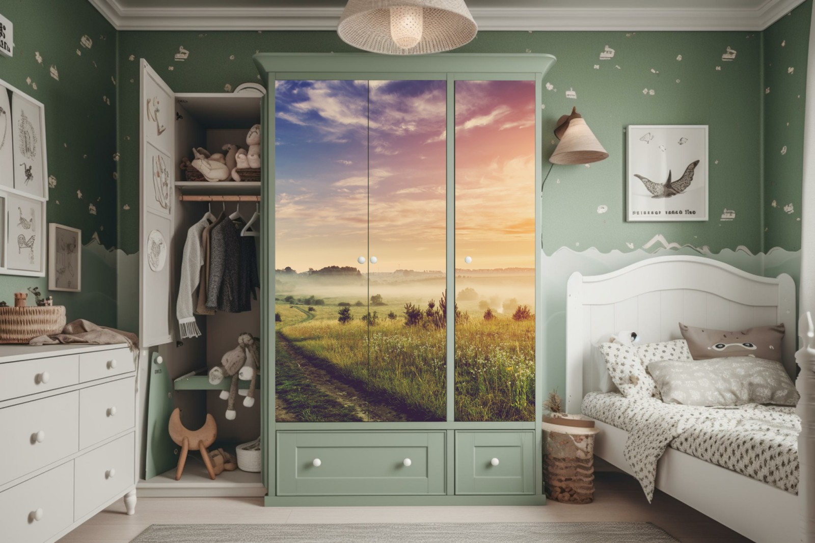 Schrankaufkleber Nebeliger sonnenaufgang über einer ländlichen wiese