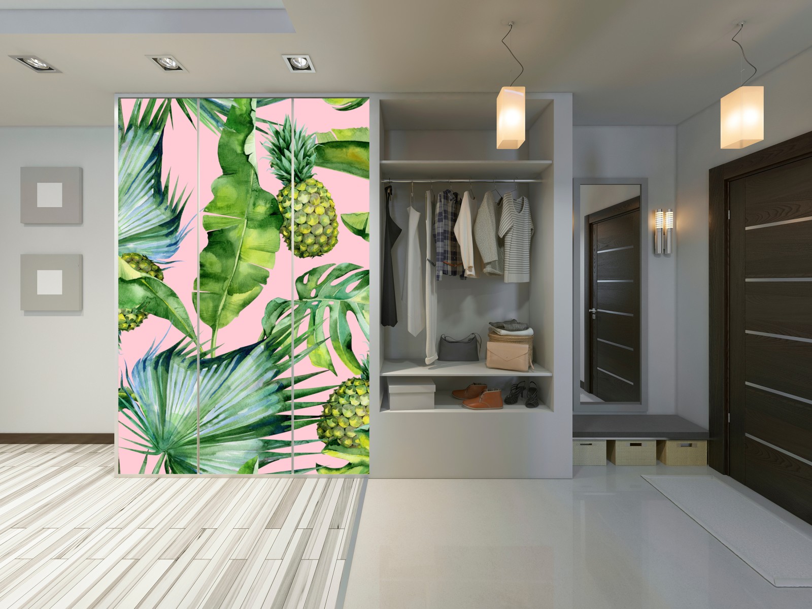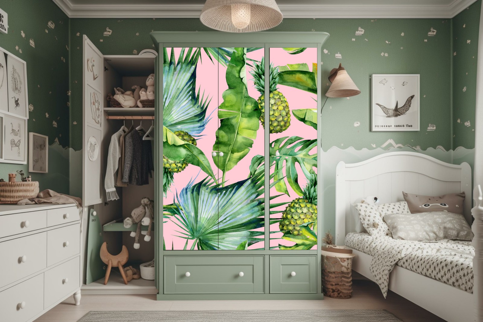 Schrankaufkleber Tropisches ananas- und blattmuster in aquarell auf rosa hintergrund