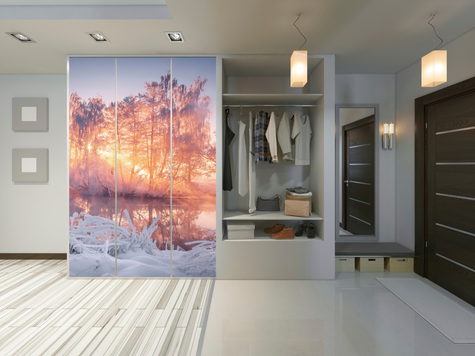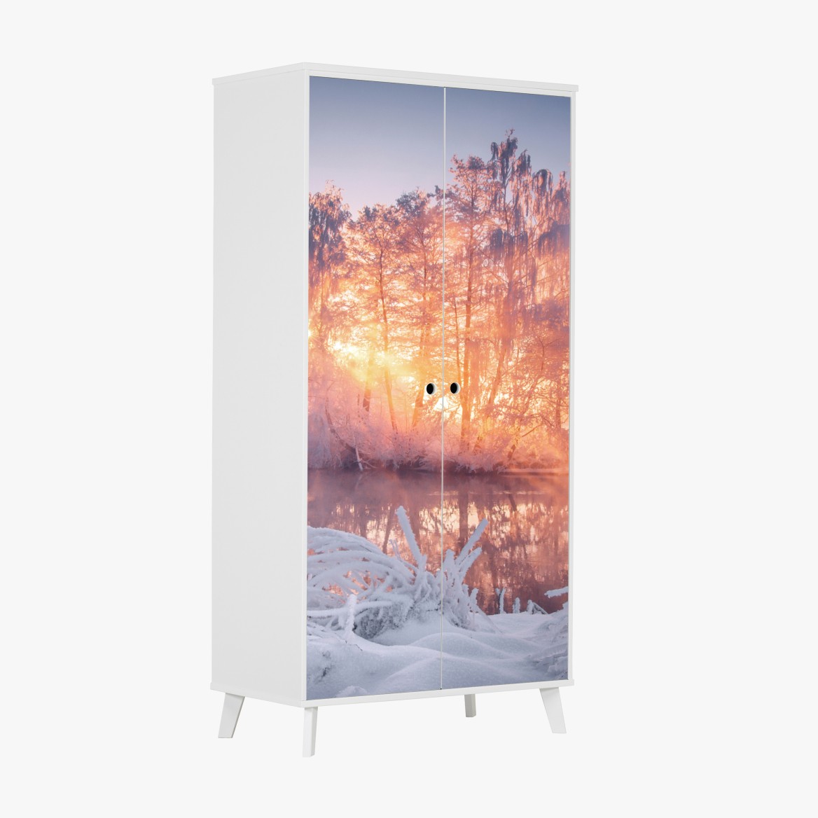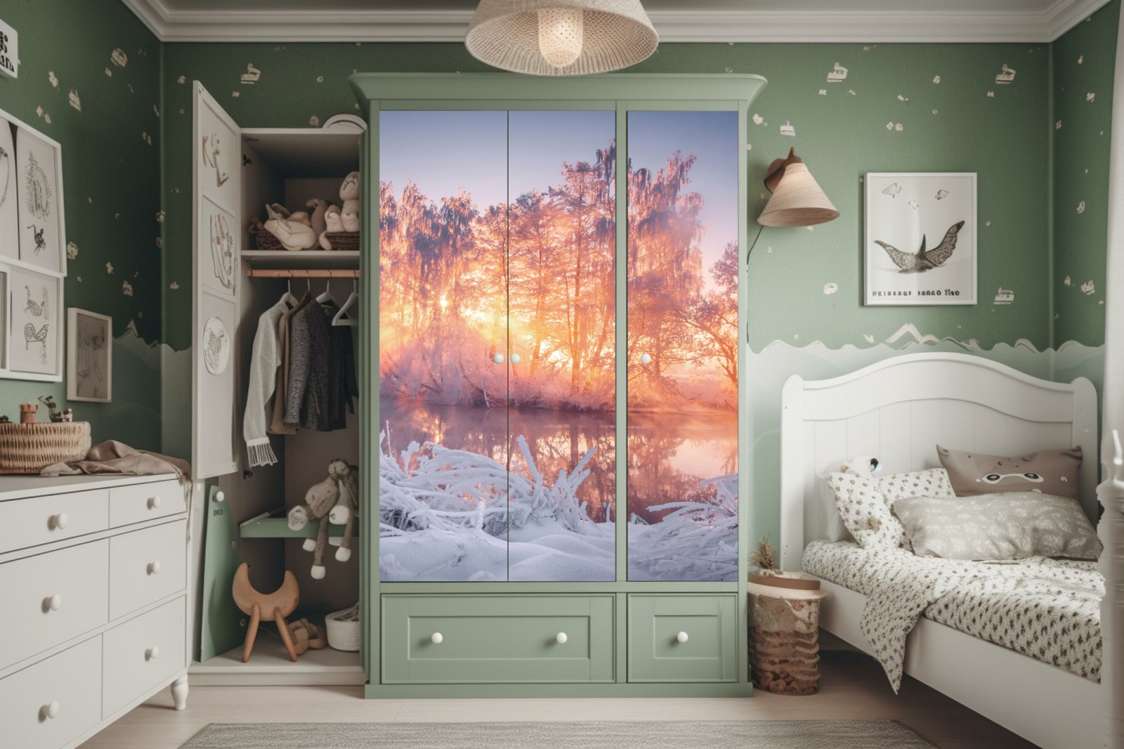 Schrankaufkleber Winterlicher sonnenaufgang über zugefrorenem fluss