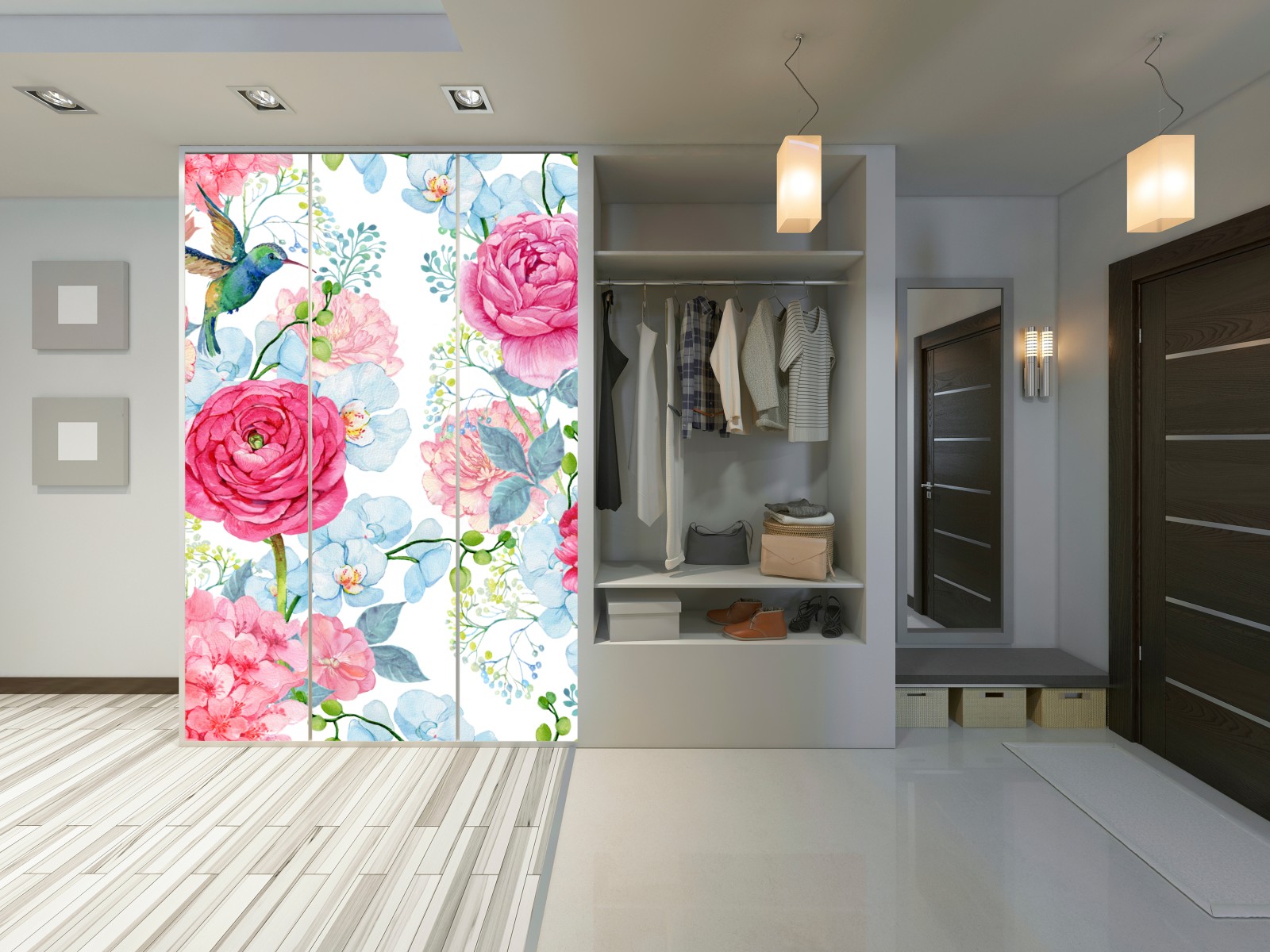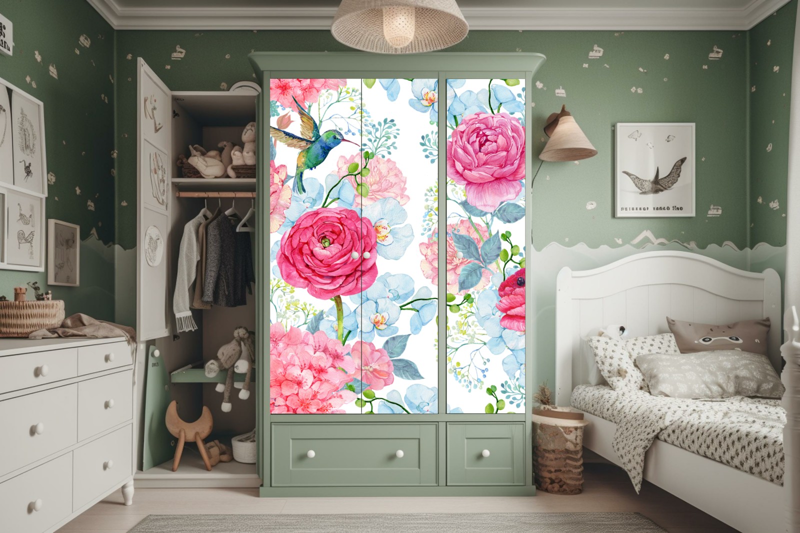 Schrankaufkleber Rosa aquarell blumengarten mit kolibri