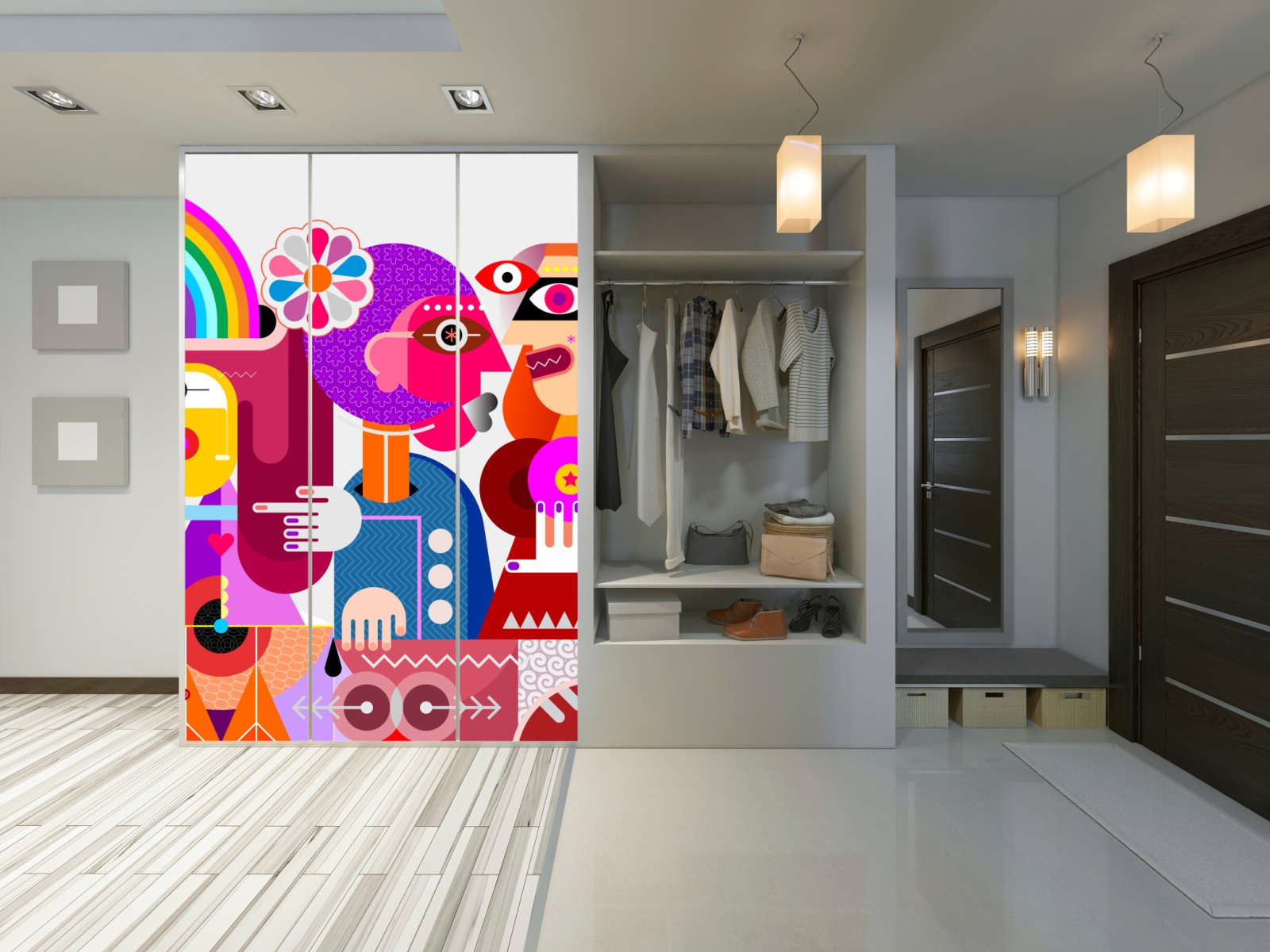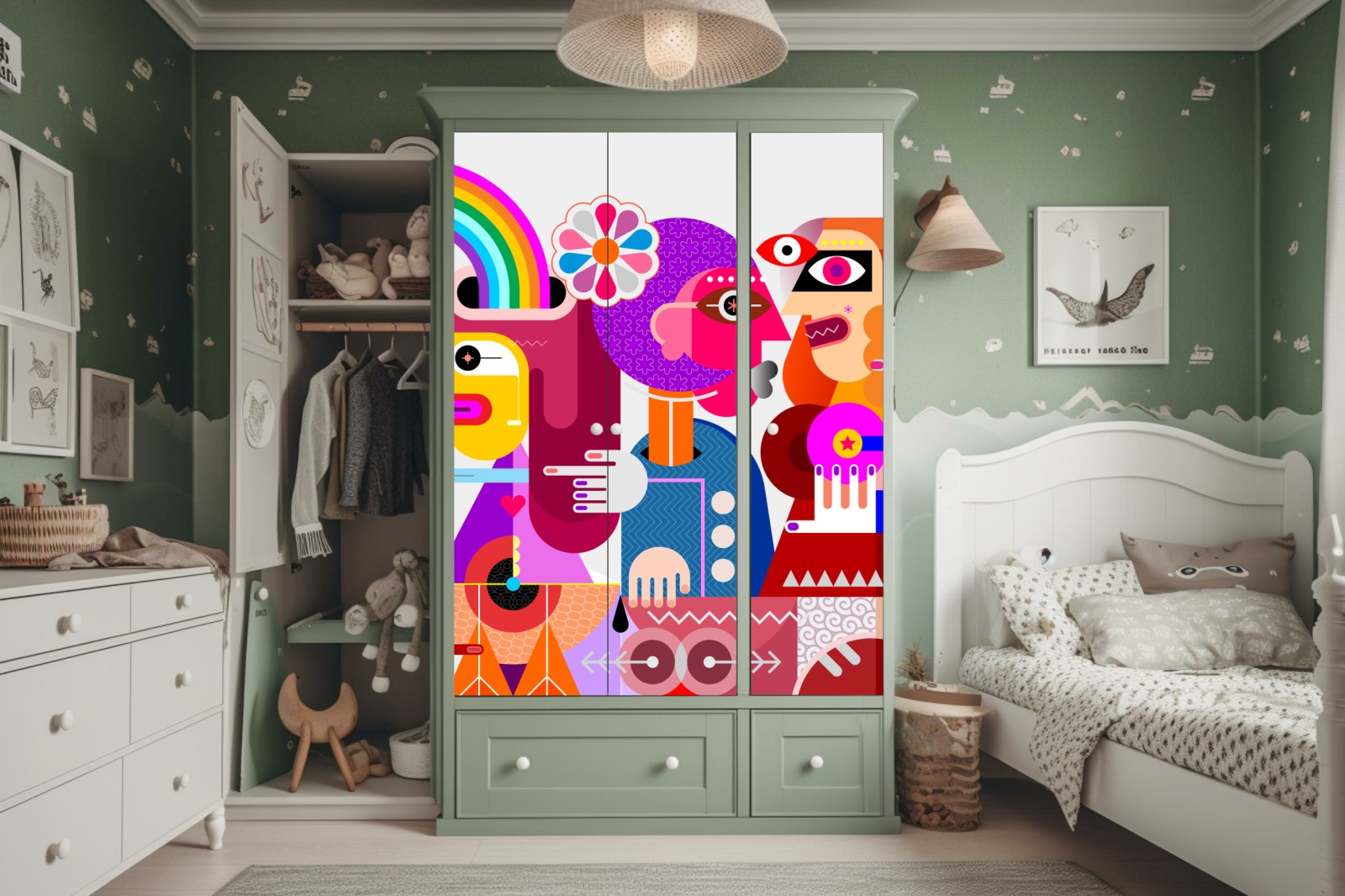 Schrankaufkleber Mann mit regenbogen reitet geometrischen vogel
