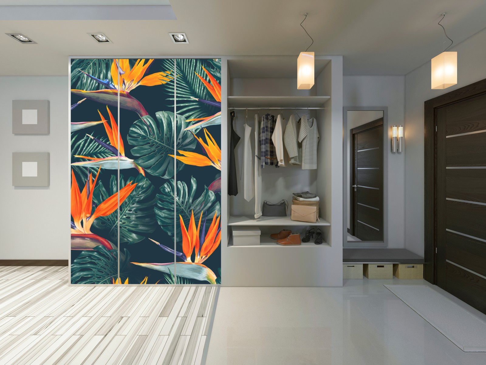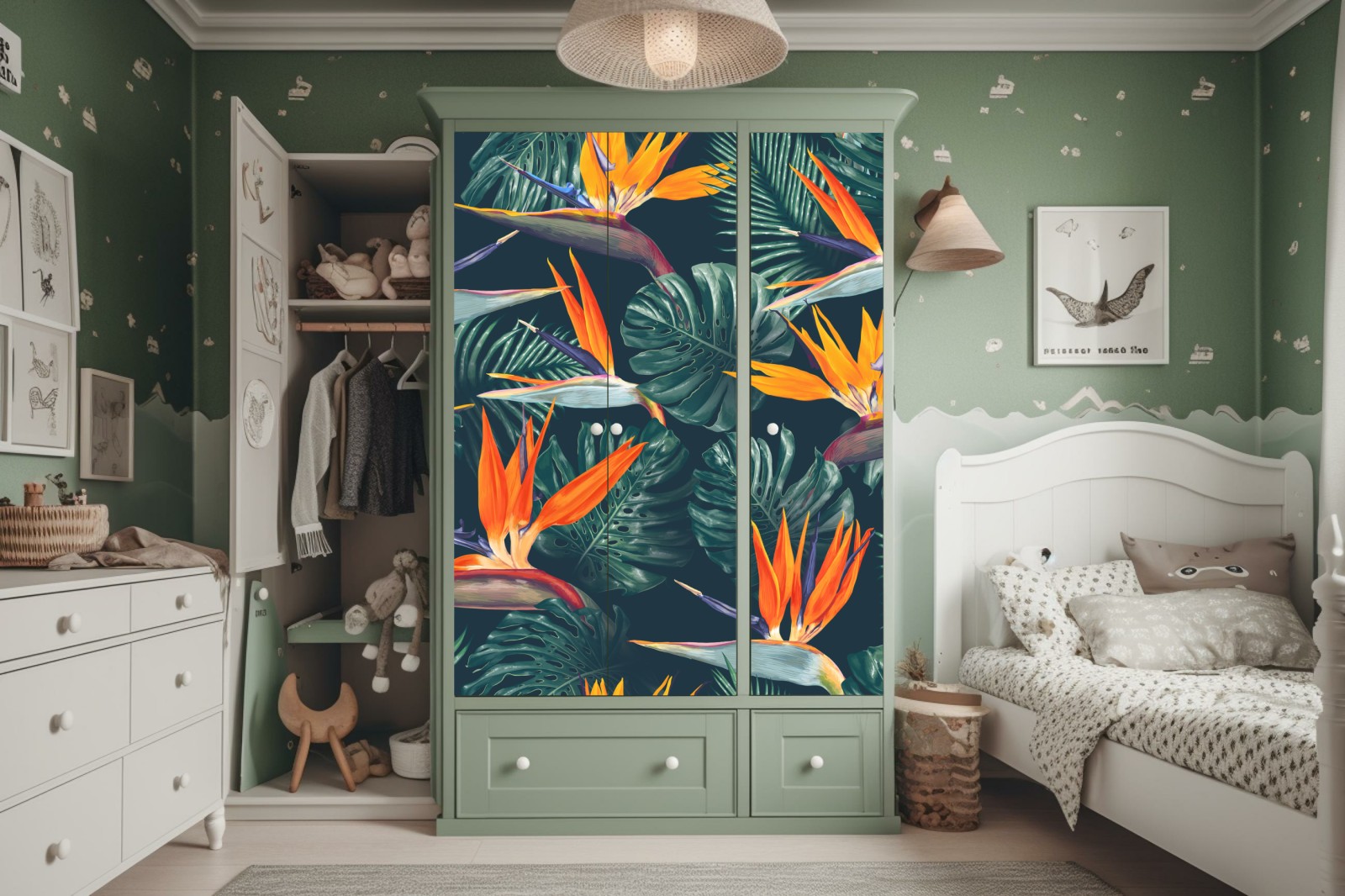 Lebendiges tropisches botanisches Motiv mit Strelitzie und üppigen Monstera-Blättern, ideal um Ihrem Raum exotische Energie zu verleihen.