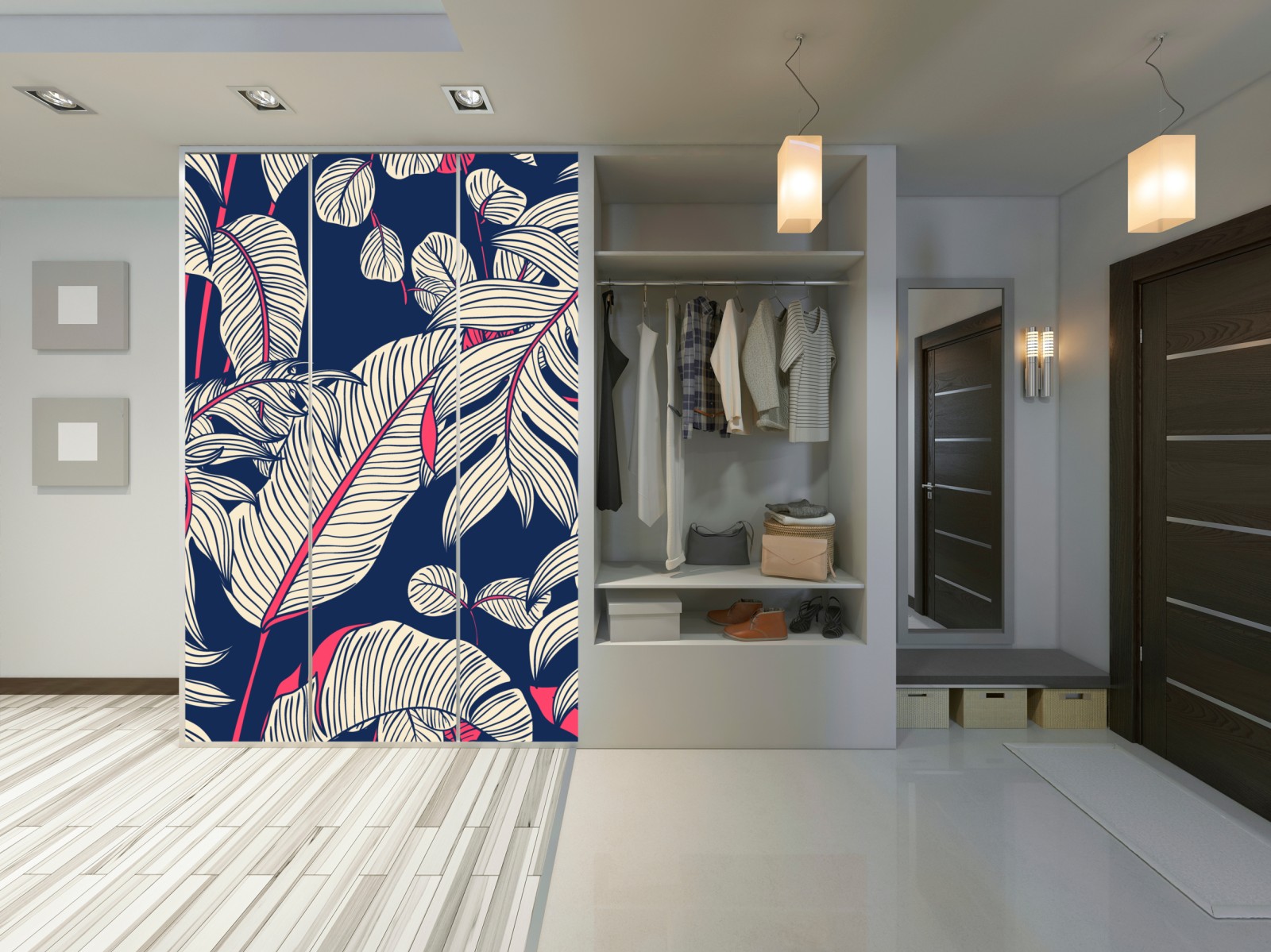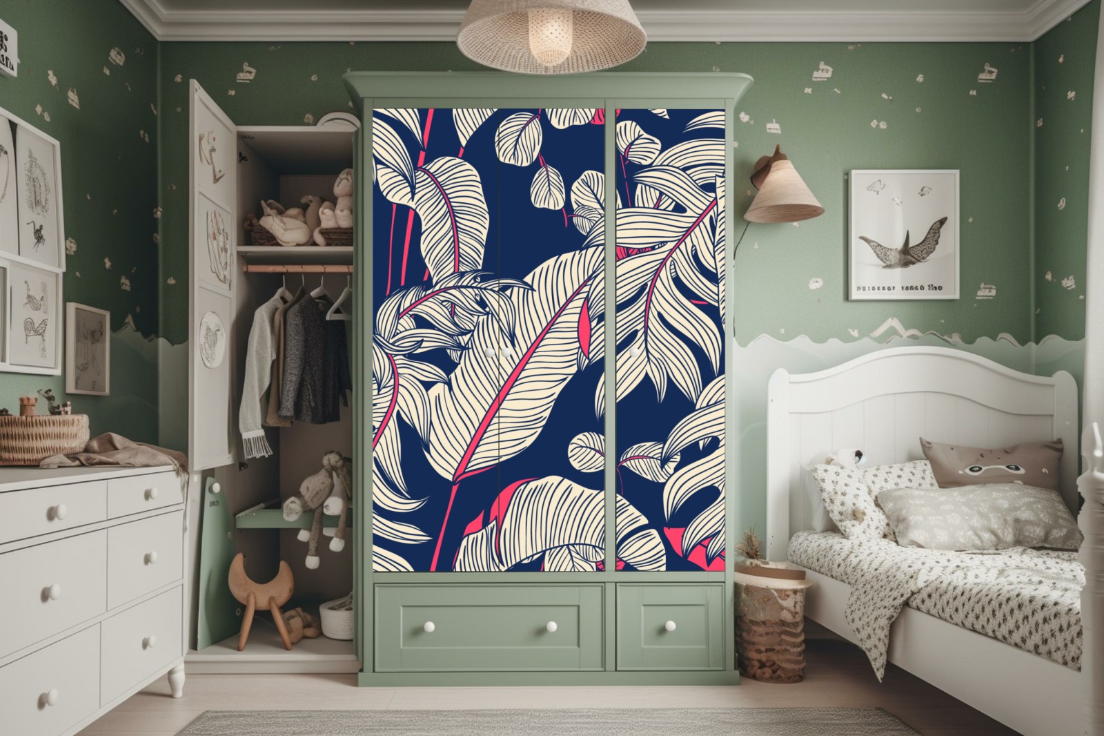 Kräftiges tropisches Blattmotiv in Marineblau, Creme und Rosa verleiht jedem Raum modernen botanischen Charme.