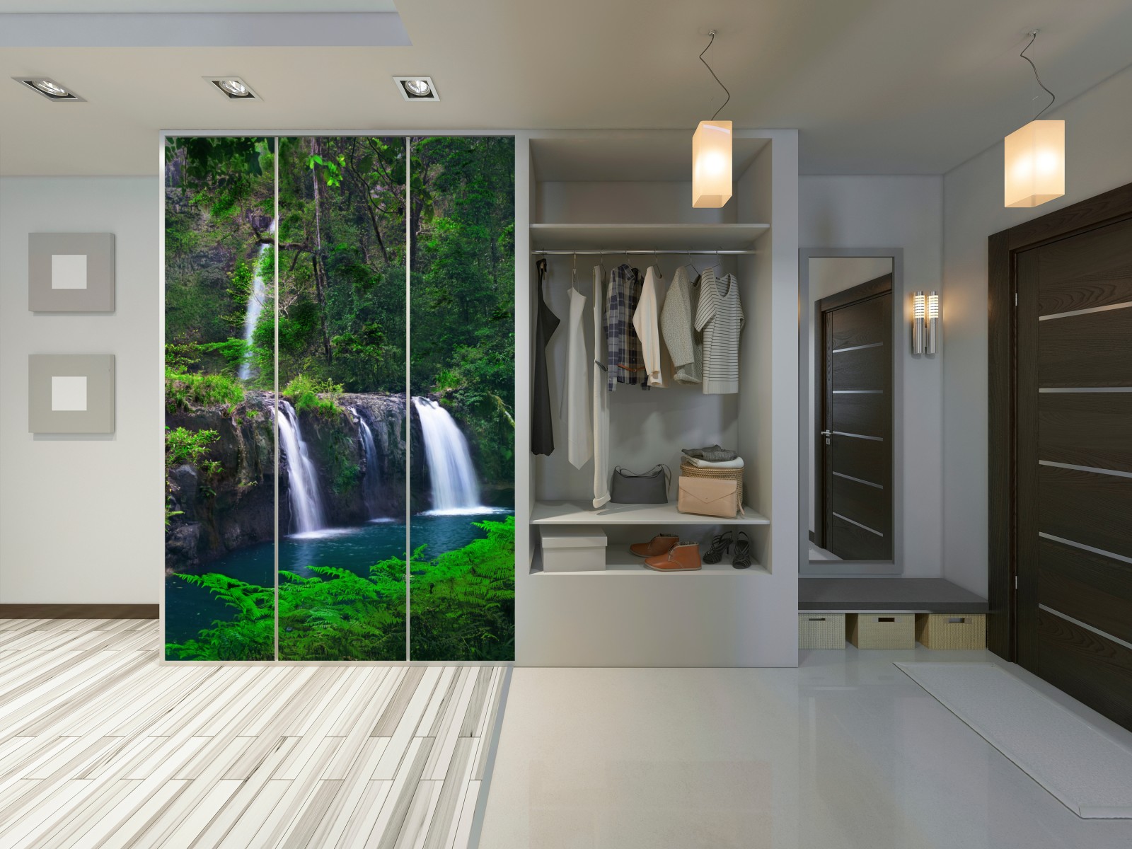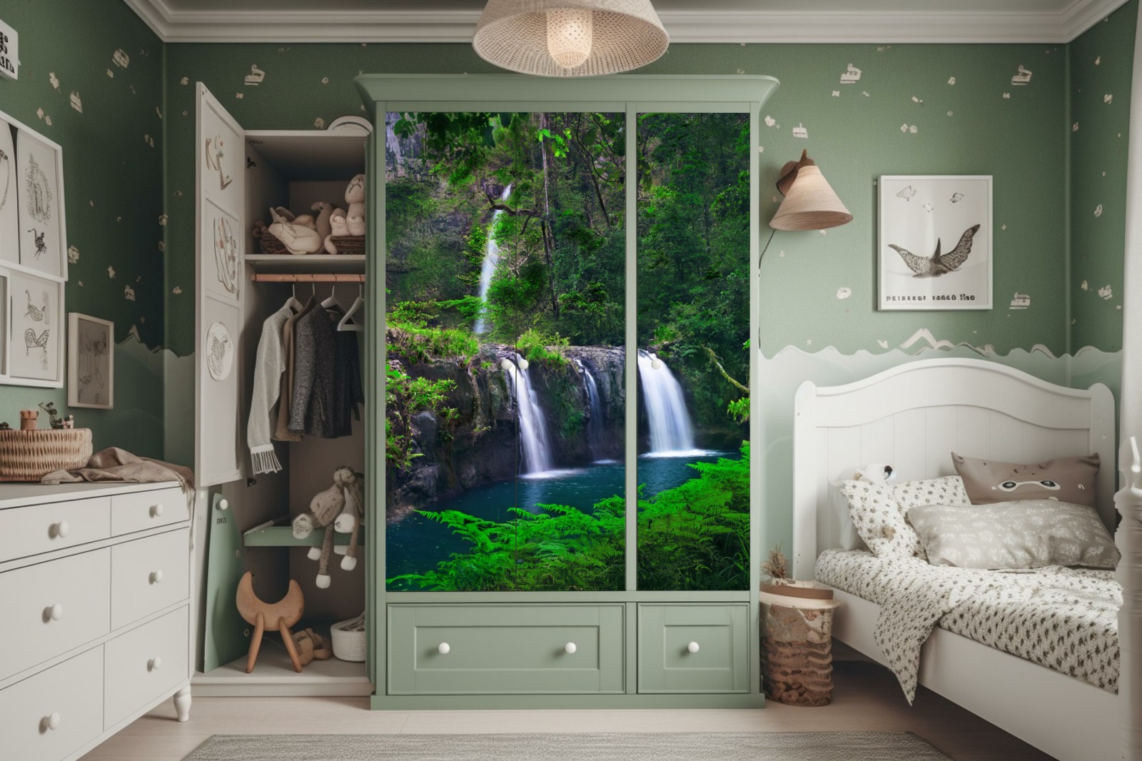 Schrankaufkleber beruhigender wasserfall im smaragdgrünen wald