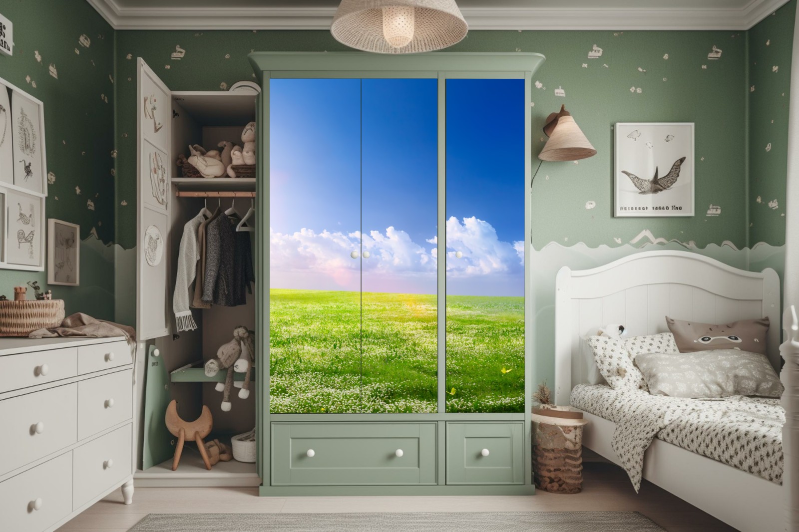 Schrankaufkleber sonnige frühlingswiese unter blauem himmel