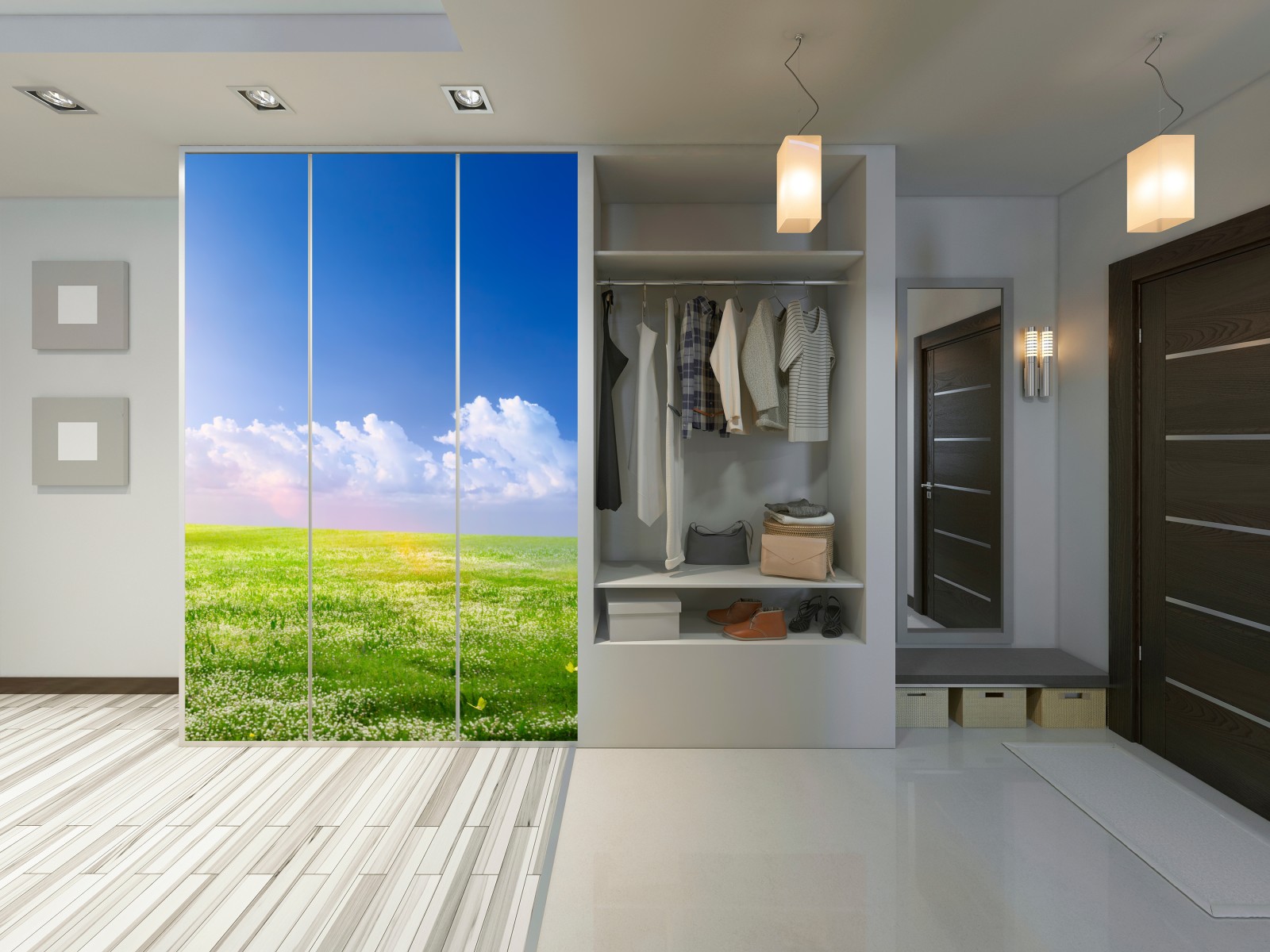 Eine ruhige Frühlingswiese unter klarem blauem Himmel verleiht jedem Raum Wärme und Gelassenheit.