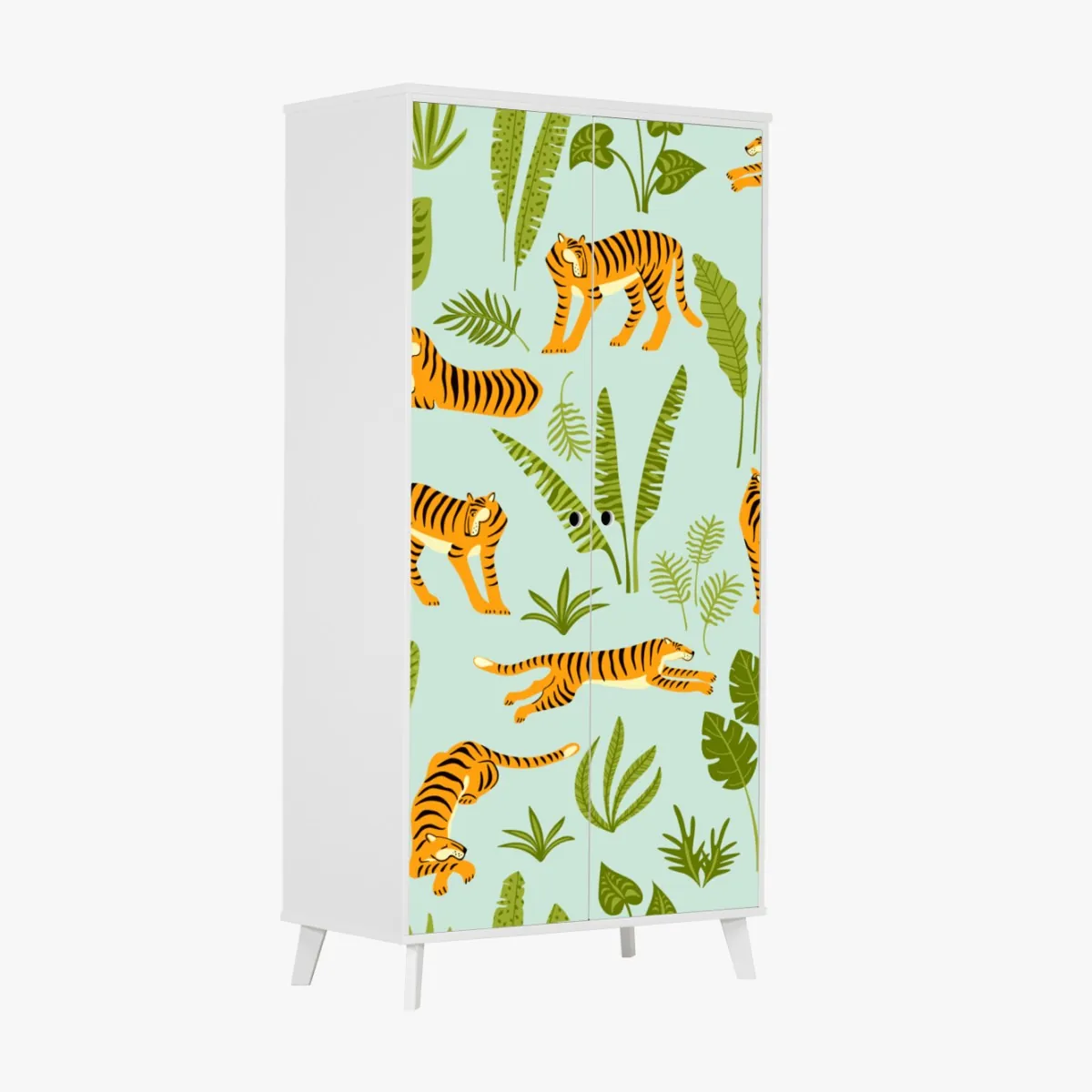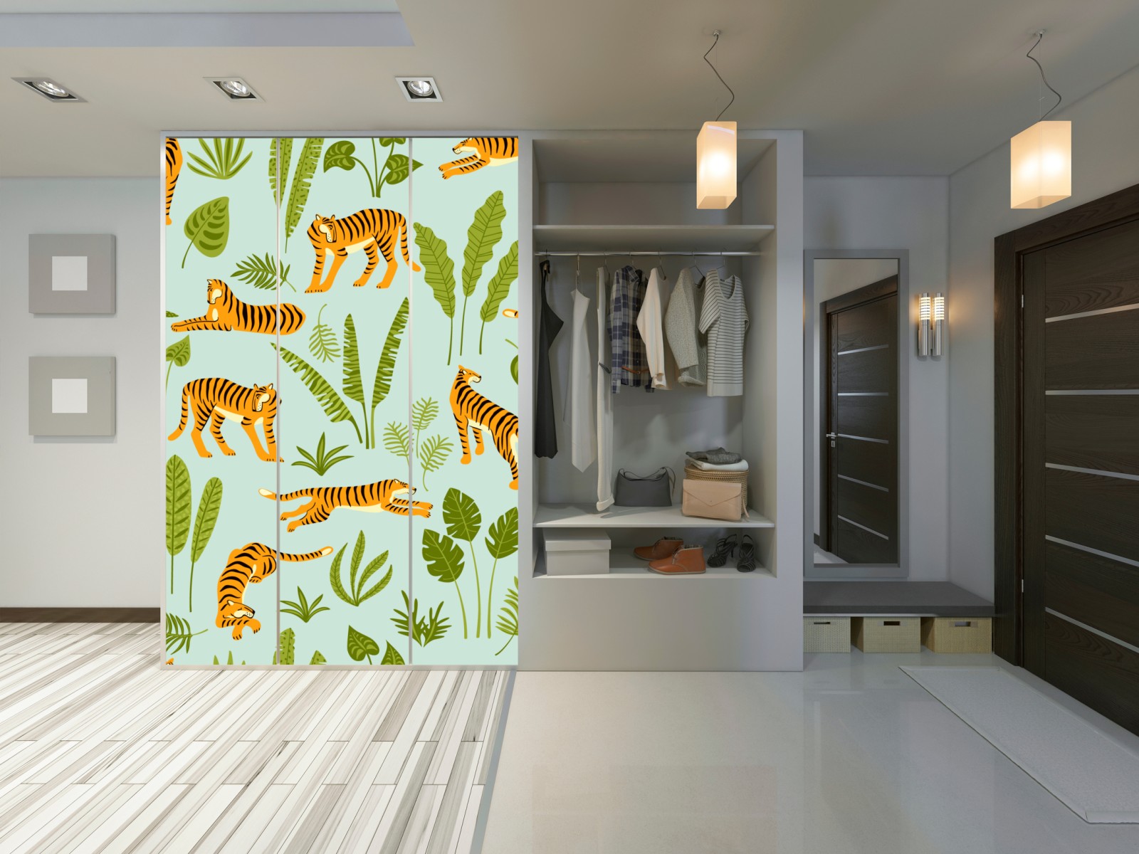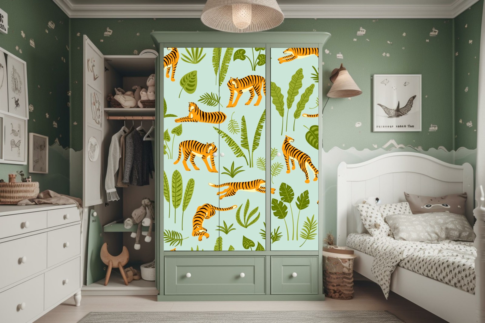 Fröhliches Muster mit Tigern und tropischen Blättern bringt einen verspielten Dschungelstil in Kinderzimmer oder Wohnräume.