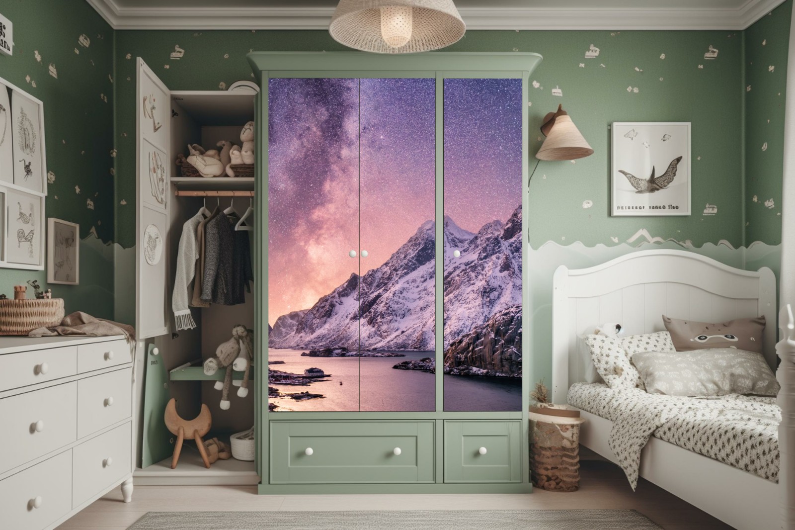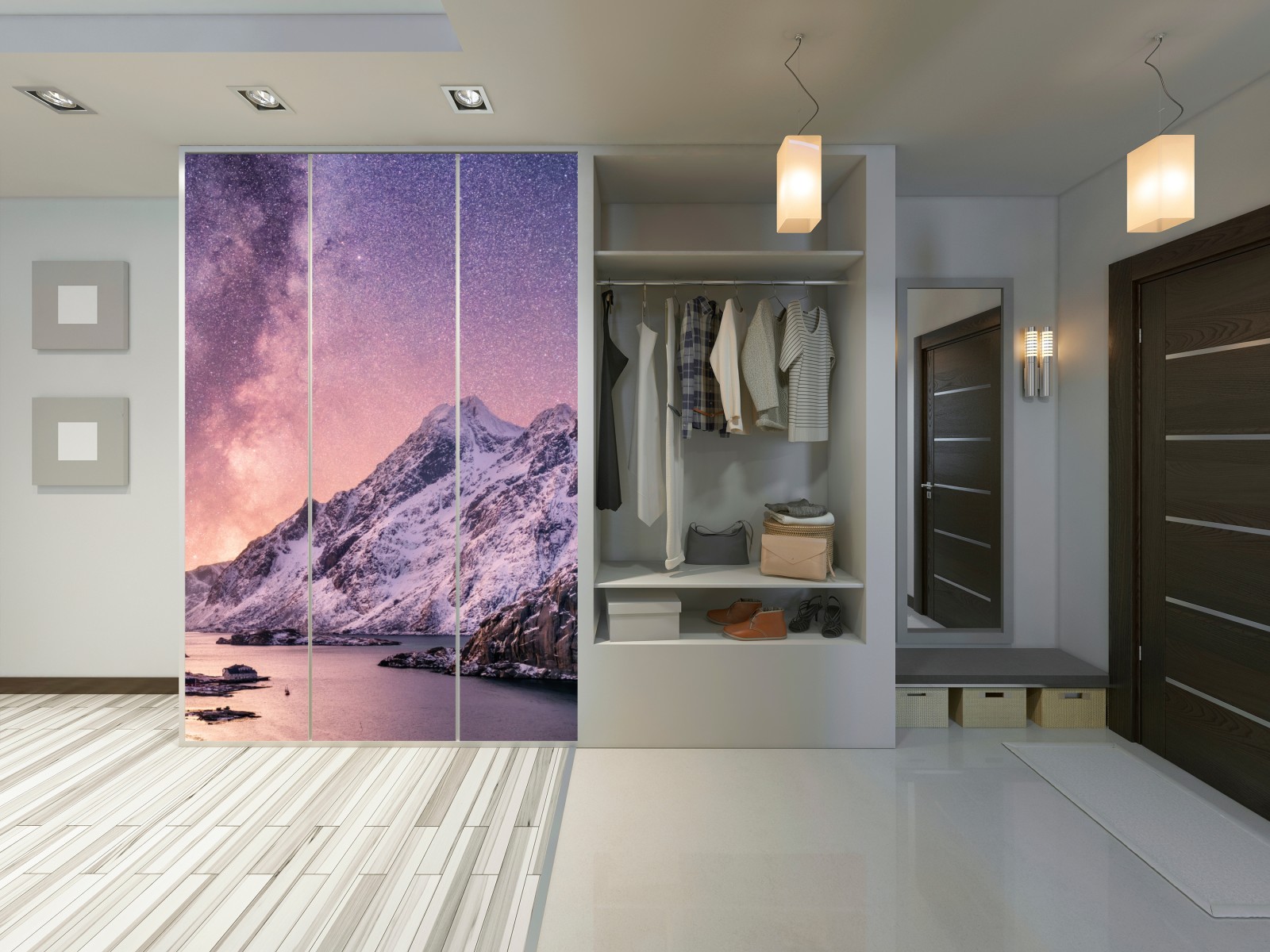Schrankaufkleber milchstraße über verschneiten bergen in Norwegen