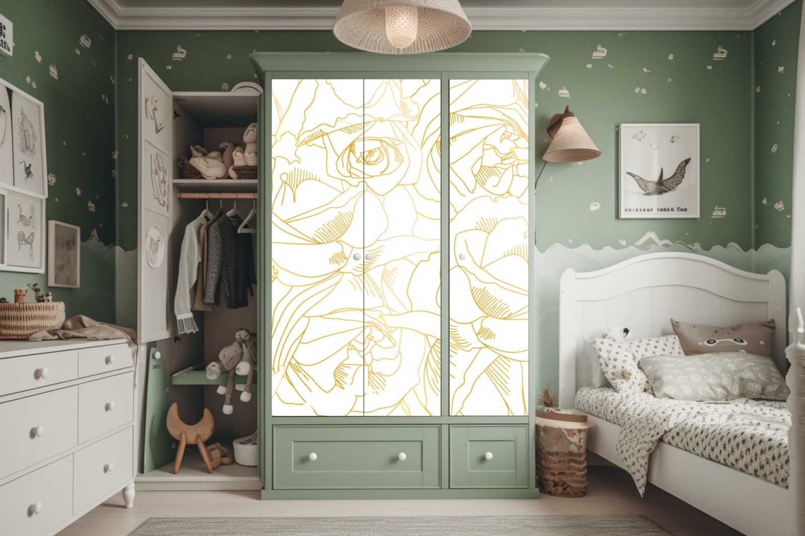 Feine goldene Linien zeichnen Rosen auf hellem Hintergrund und verleihen jedem Raum eine elegante, moderne botanische Note.