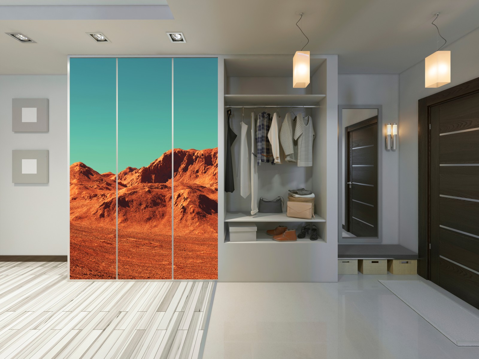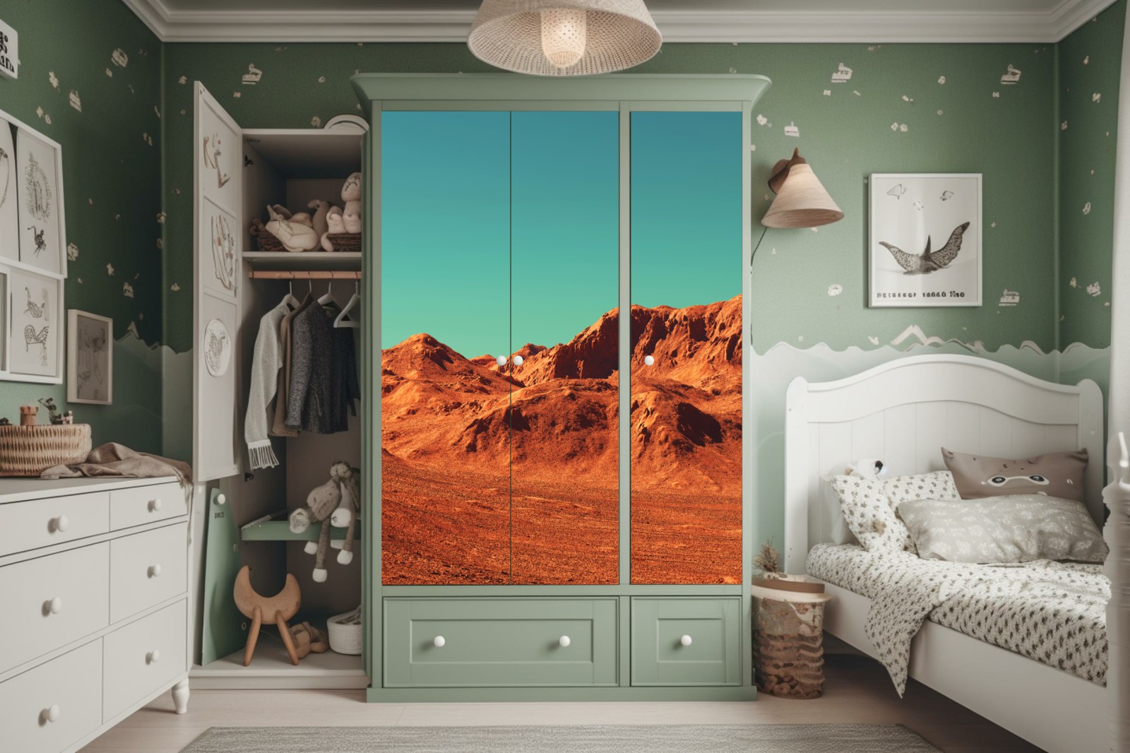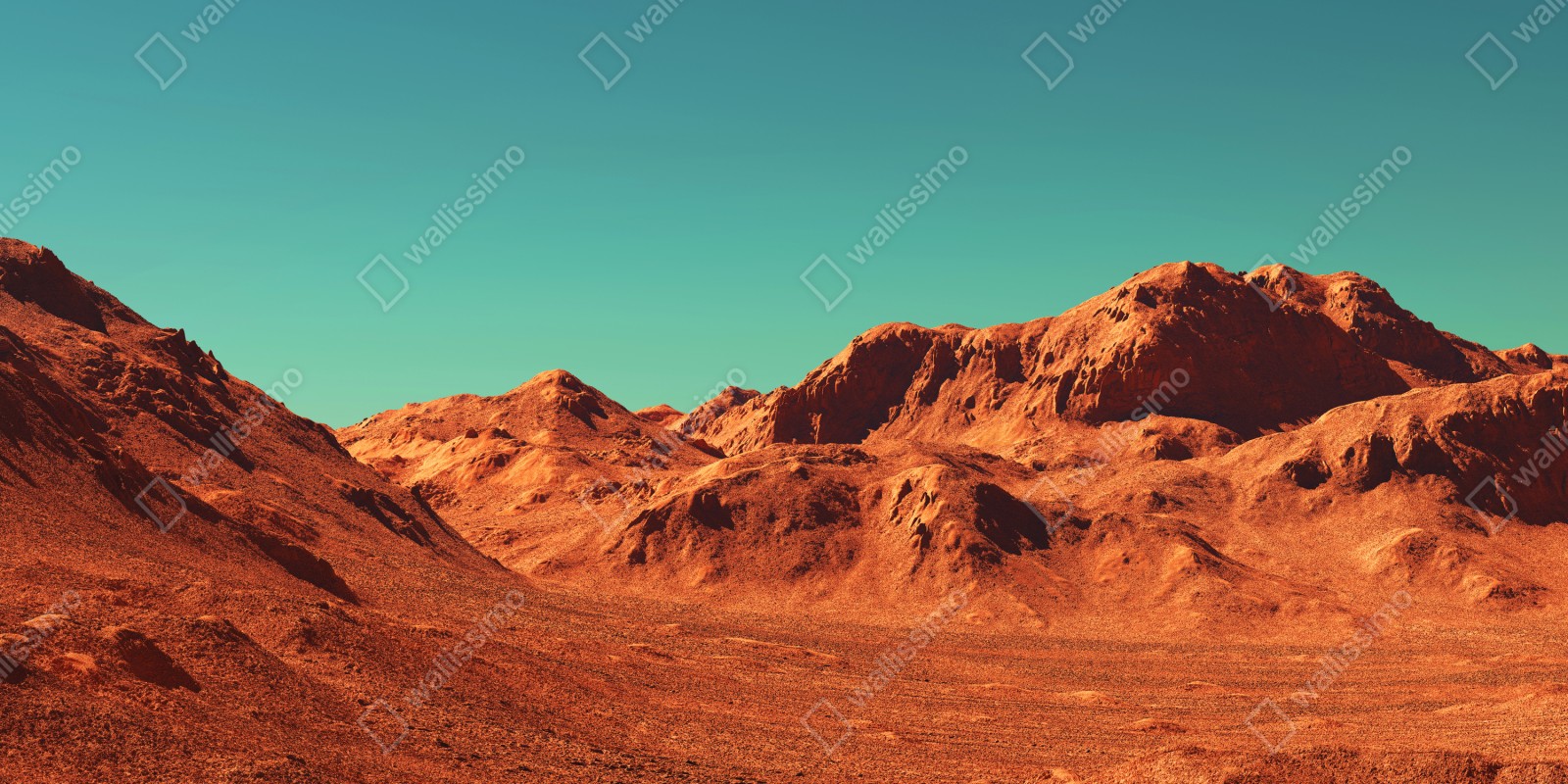 Beeindruckende 3D-Darstellung einer Marslandschaft in intensiven Rot- und Türkistönen, ideal für moderne Wohnräume.