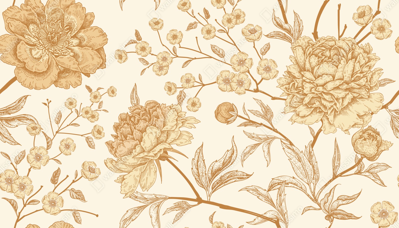 Elegantes vintage-inspiriertes Blumenmuster in beigen Sepia-Tönen mit detaillierten Pfingstrosen, das jedem Raum zeitlose Wärme verleiht.