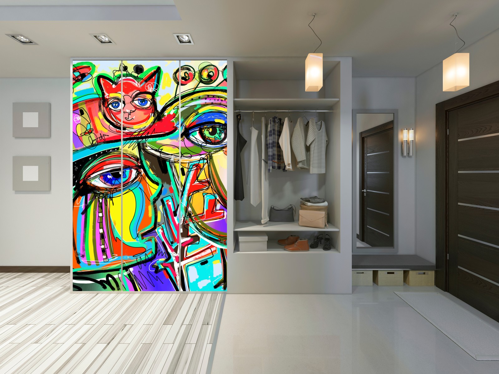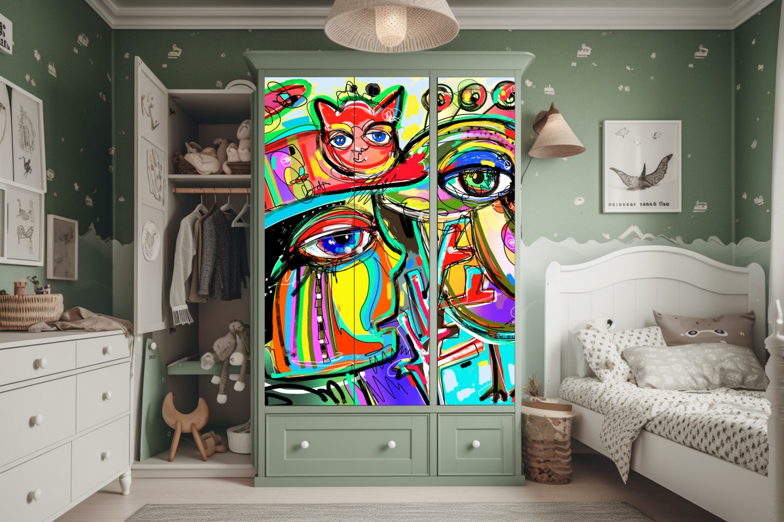 Schrankaufkleber lebendige abstrakte gesichter mit katze und vogel