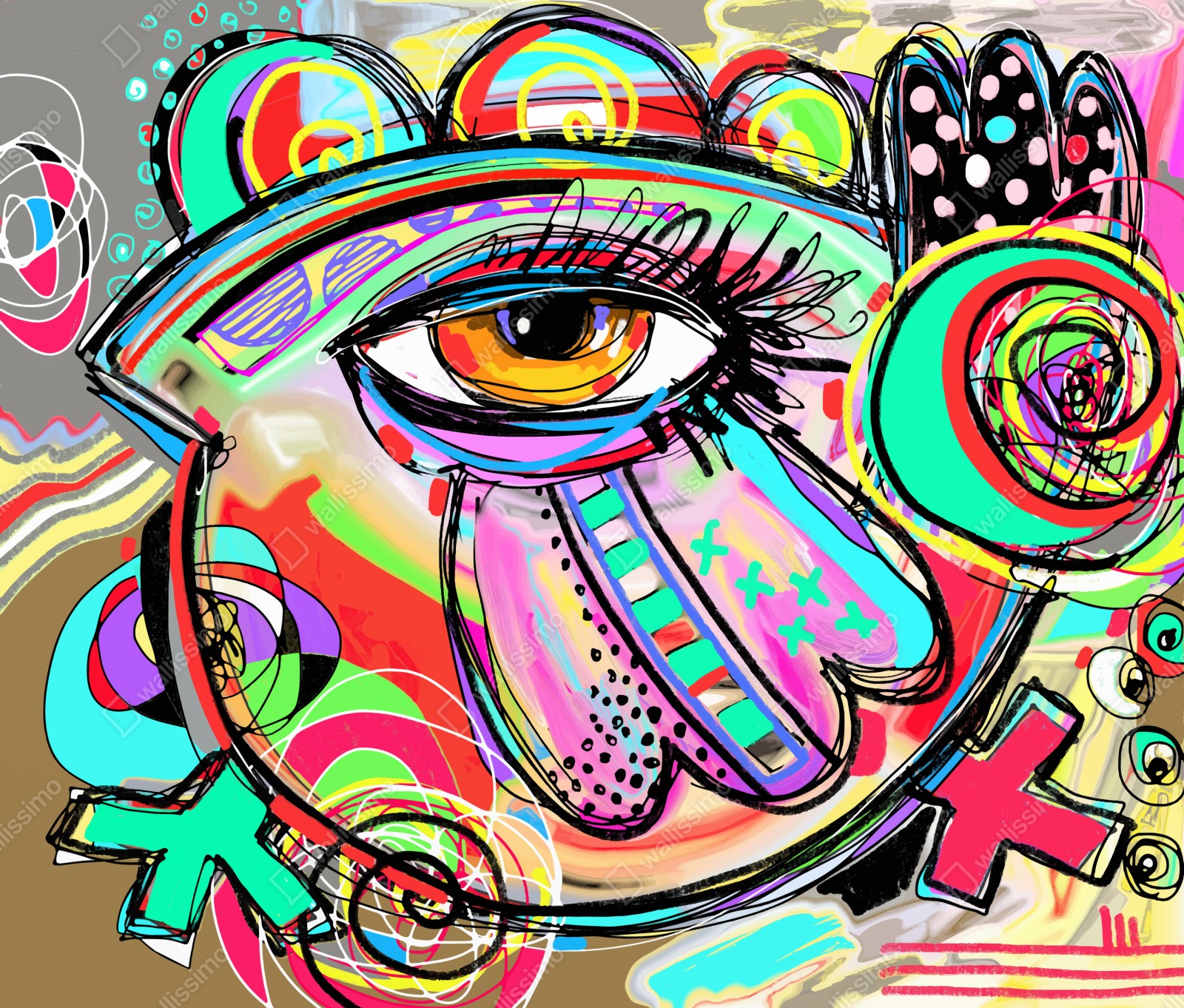 Kraftvolles zeitgenössisches Kunstwerk mit einem farbenfrohen abstrakten Gesicht und einem markanten Auge, ideal um modernen Räumen Energie und Charakter zu verleihen.